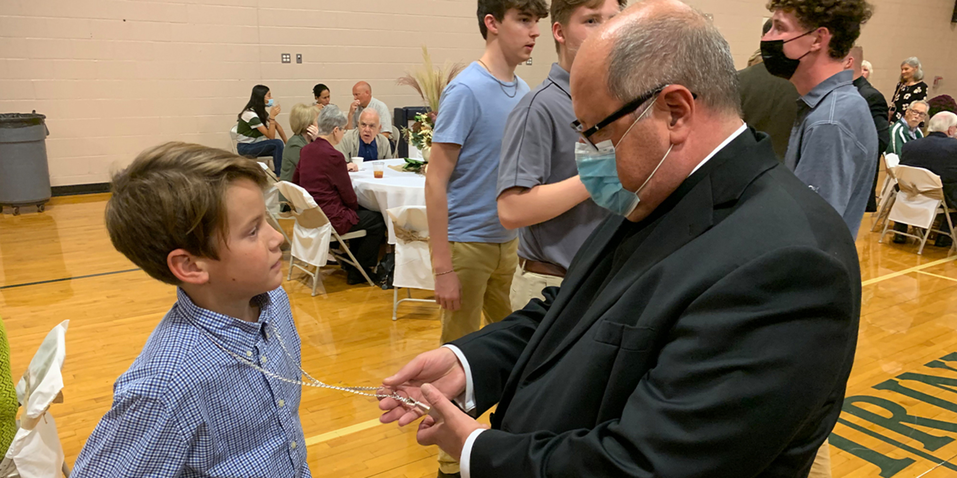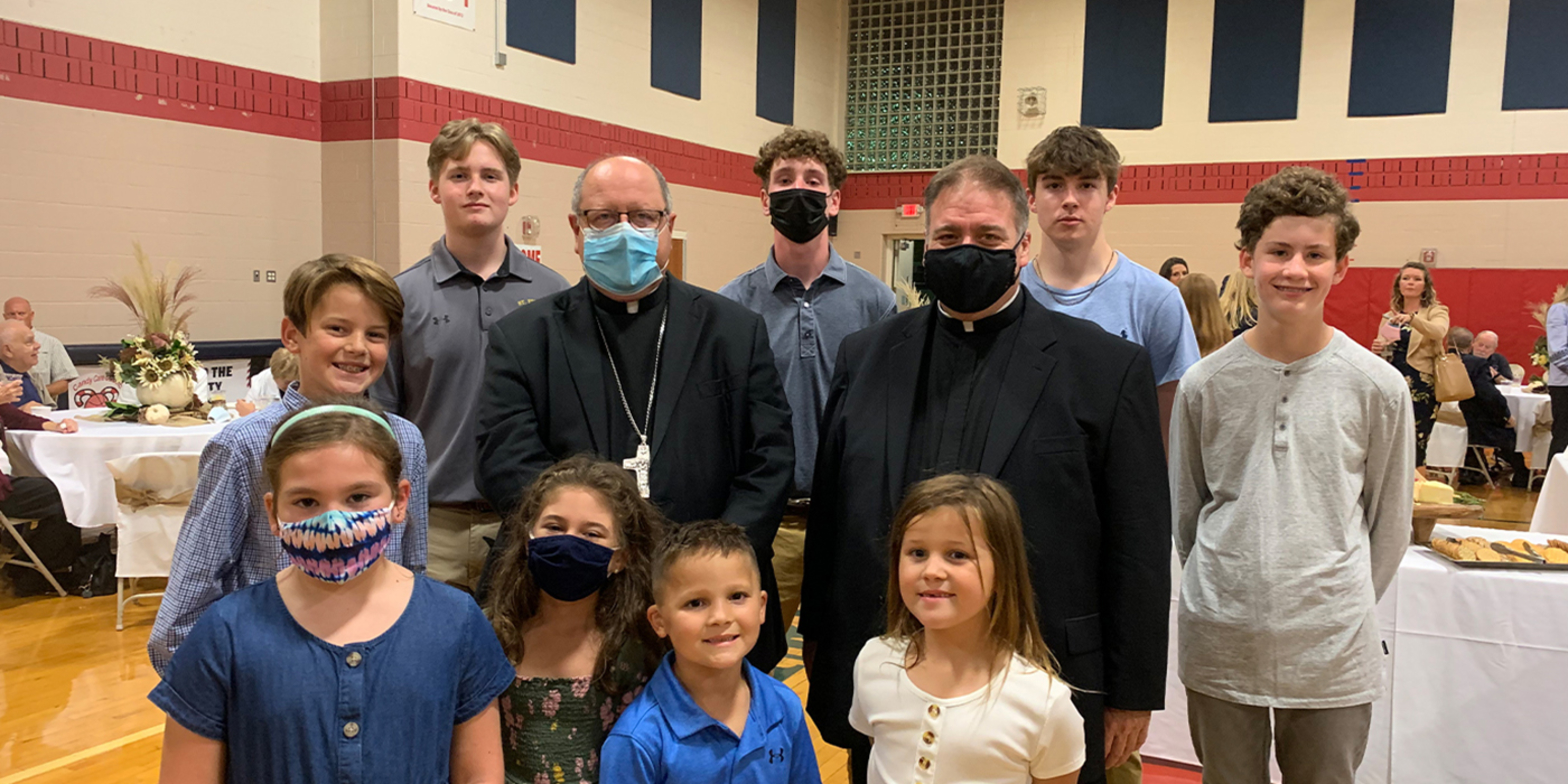 A festive, fall-themed reception took place in the school’s gym after Mass. At the gathering, the bishop and Father Hawk chatted with students, Holy Trinity school alumni, staff and parishioners.