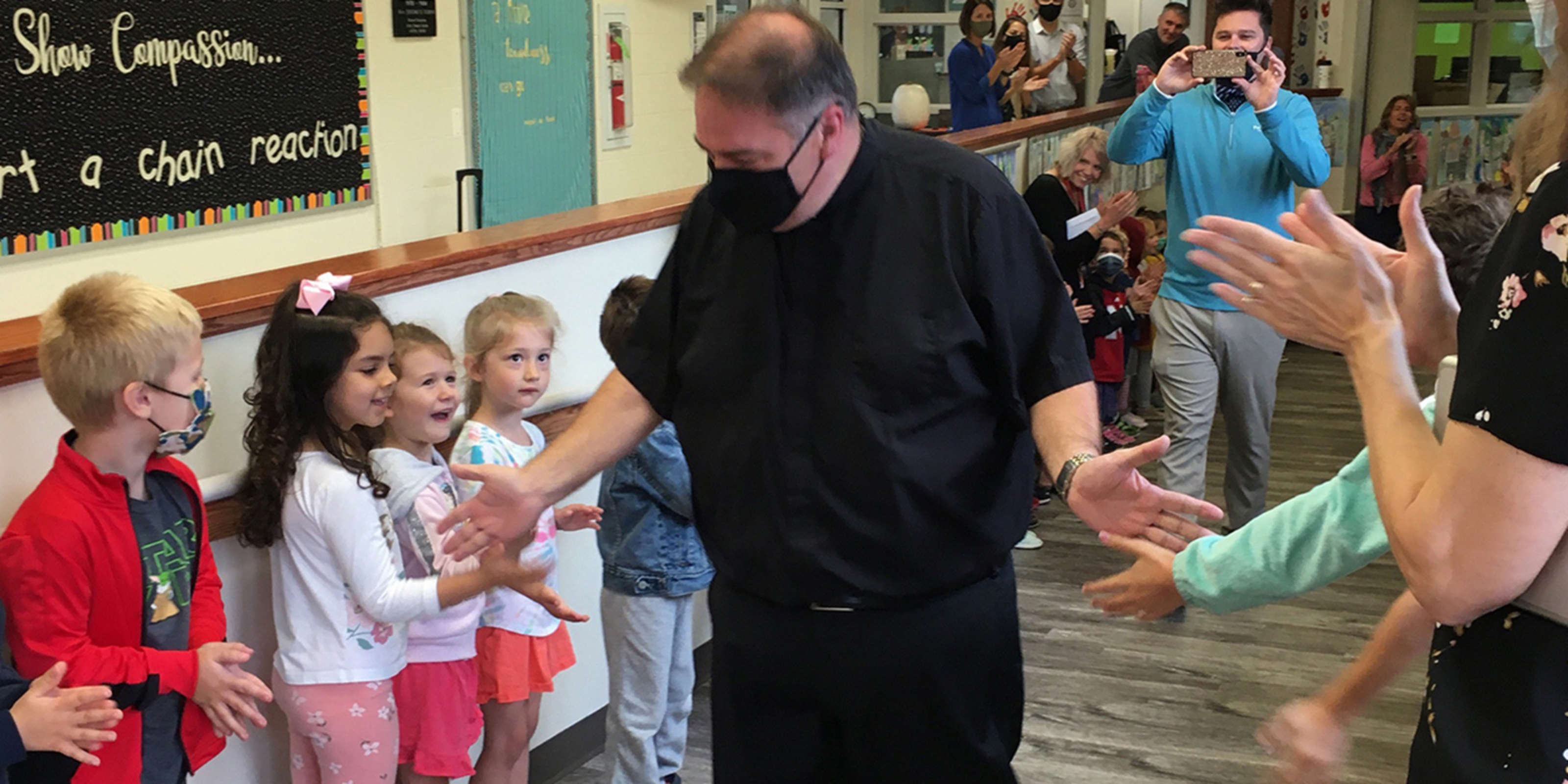 Father Hawk thanked the students, parents and staff at Holy Trinity School and PSR program for a warm welcome as the school year began. He shared how earlier in the day, students surprised him with a “clap in,” lining the hallways, cheering his name and giving high-fives as he entered the building.