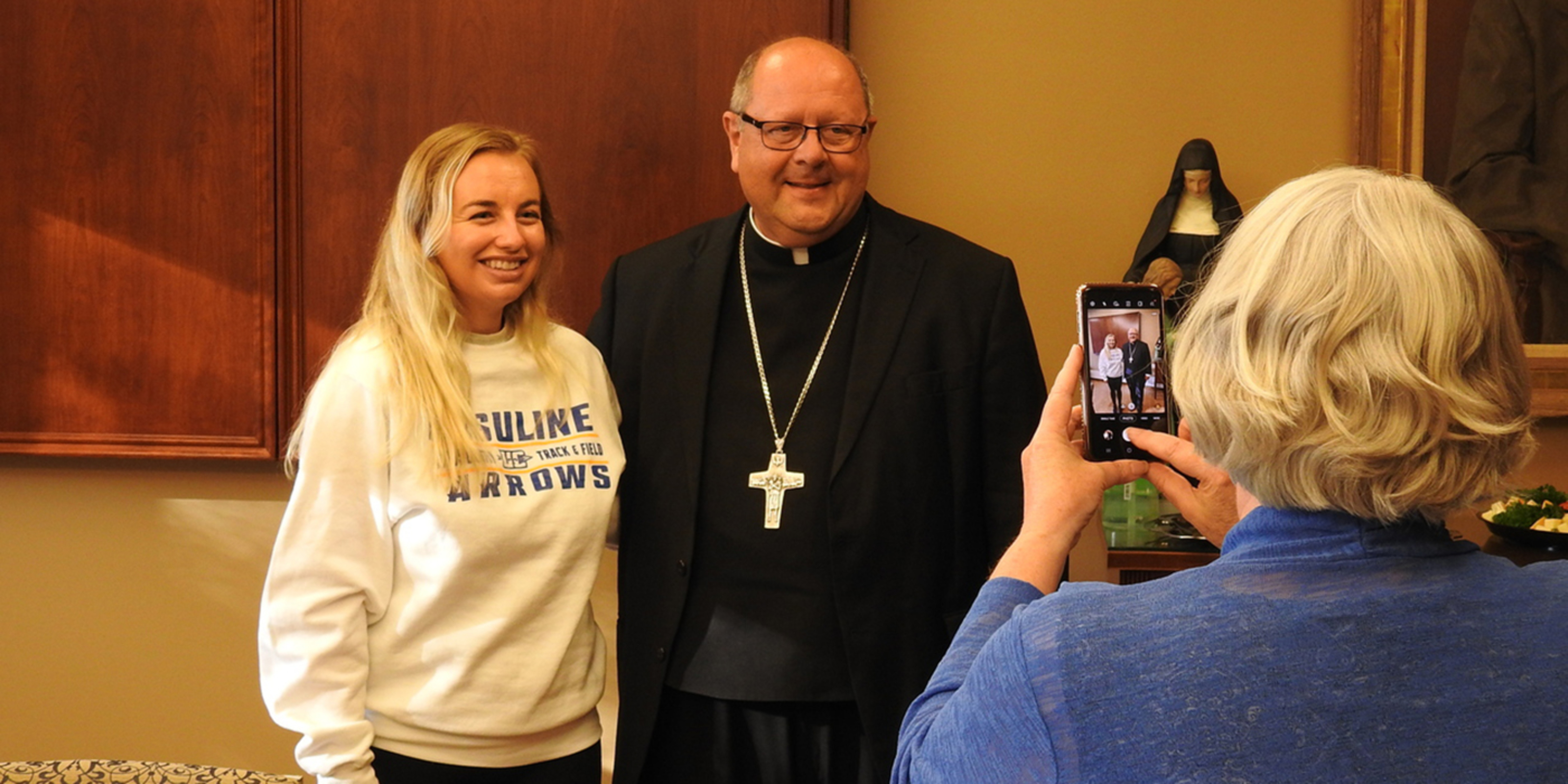 After posing for photos with the students, Sister De Vinne guided the bishop to the library where he met with college officials at a reception before enjoying dinner with trustees.