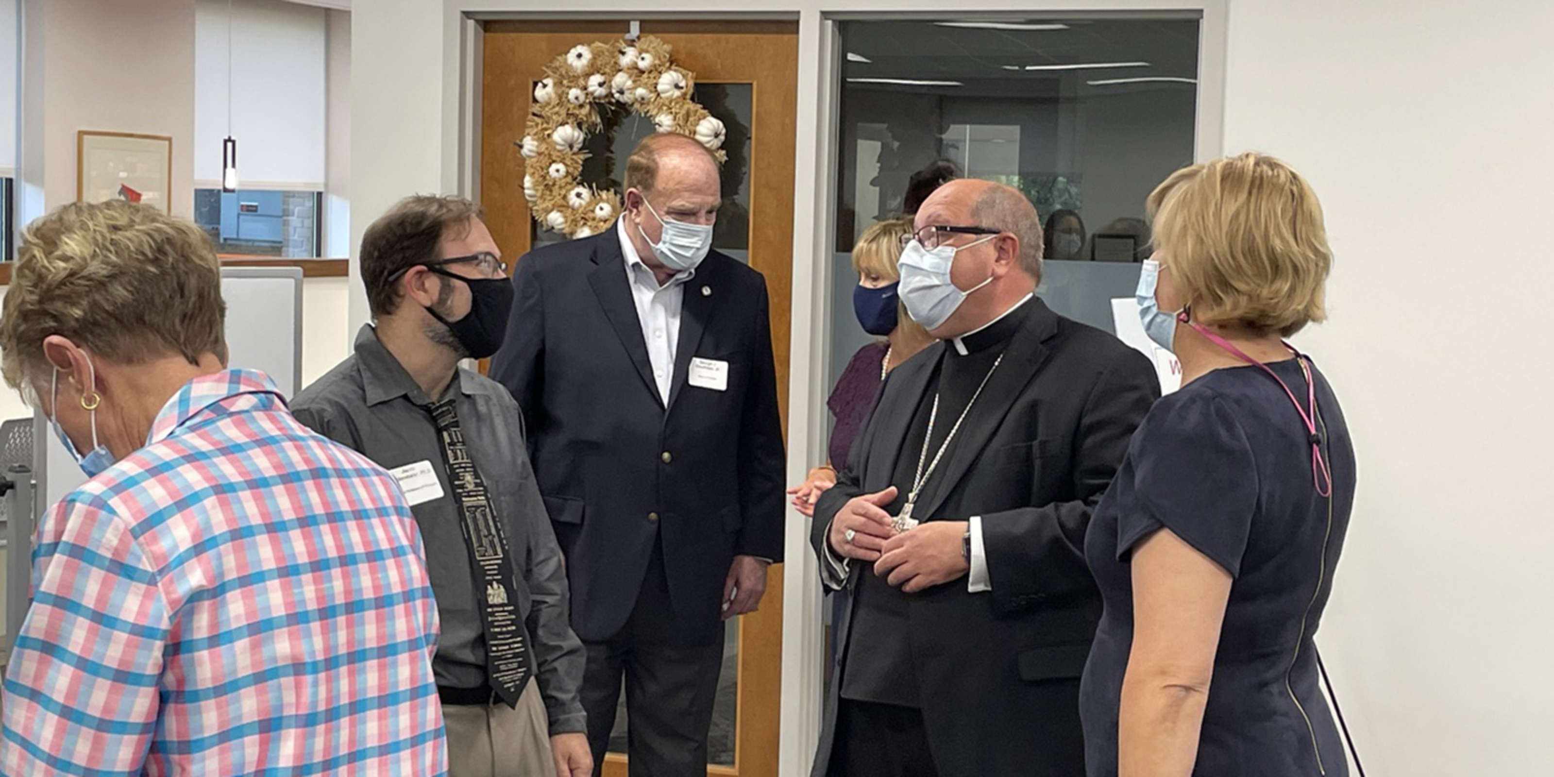 During a recent visit to the college, Bishop Edward Malesic met Sister Christine De Vinne, OSU, college president; Paula Fitzgerald, campus minister; administrators, deans, board members and a group of students. He also had the opportunity to view the college’s original charter, which the college archivist cares for in the library.