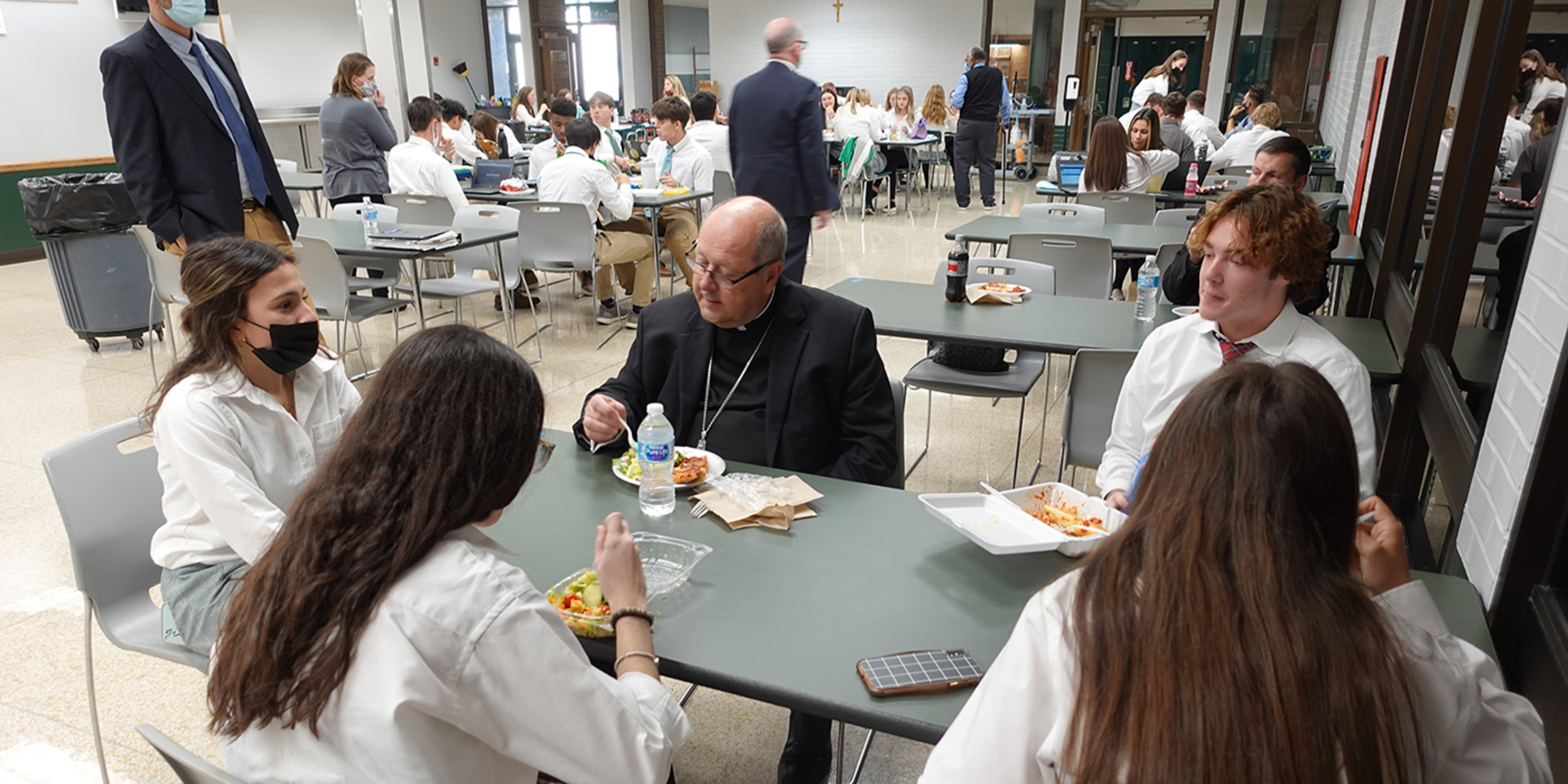 The bishop enjoyed lunch with a group of students and posed for selfies before ending his visit. He also saw the girls volleyball trophy for their recent win in the regional championships. The team will play in the state semifinals on Nov. 12. In recognition of the achievement, Bishop Malesic – with Crowley’s approval – announced there would be no school that day.