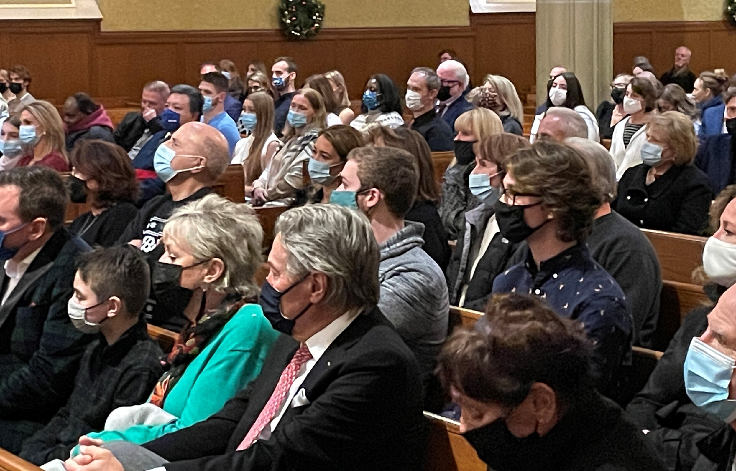 “We’ve been through a long, trying event. I appreciate your civility and I know our health care workers are at the brink, so please pray for them,” he said, as the congregation applauded. “Take care of one another.”