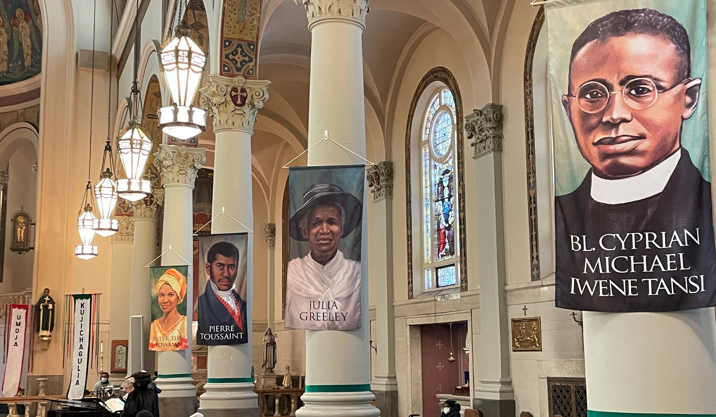 After Mass, two parishioners shared the stories of two of the people featured in the banners hanging in the church. This week’s featured sainthood candidates were Sister Thea Bowman and Blessed Pierre Toussaint.
