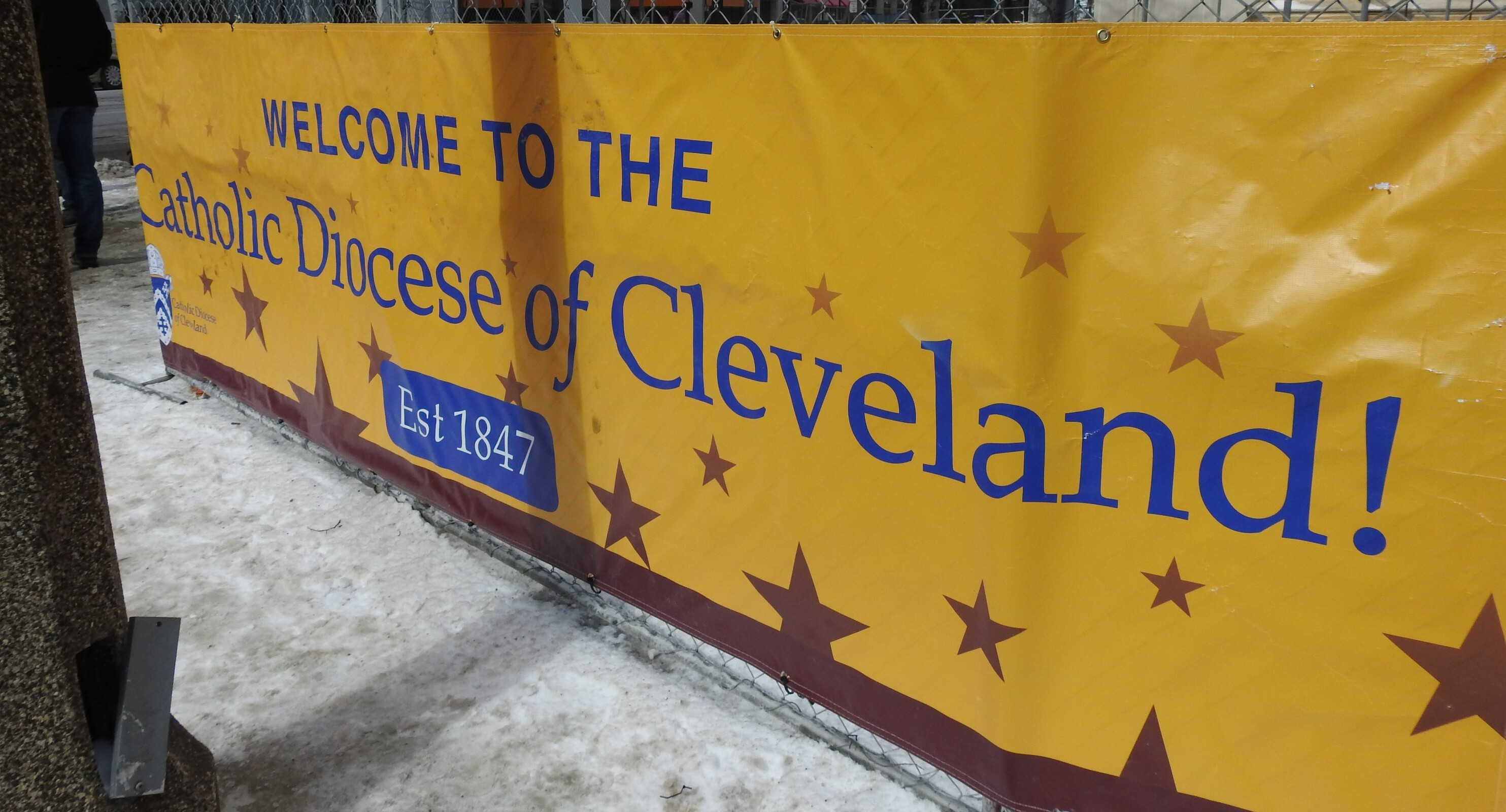 Mike Hayes, director of the Office of Young Adult Ministry; Francine Costantini, director of the Office of Youth Ministry; Miguel Chavez, director of the Office of Missionary Discipleship; and Terri Yohman, director of the Office of Marriage and Family Life recruited volunteers to help work shifts Feb. 19-20 outside the Cathedral of St. John the Evangelist at East Ninth Street and Superior Avenue. A large banner sporting the wine and gold colors of the Cleveland Cavaliers basketball team shared the message of the diocese’s 175th anniversary.