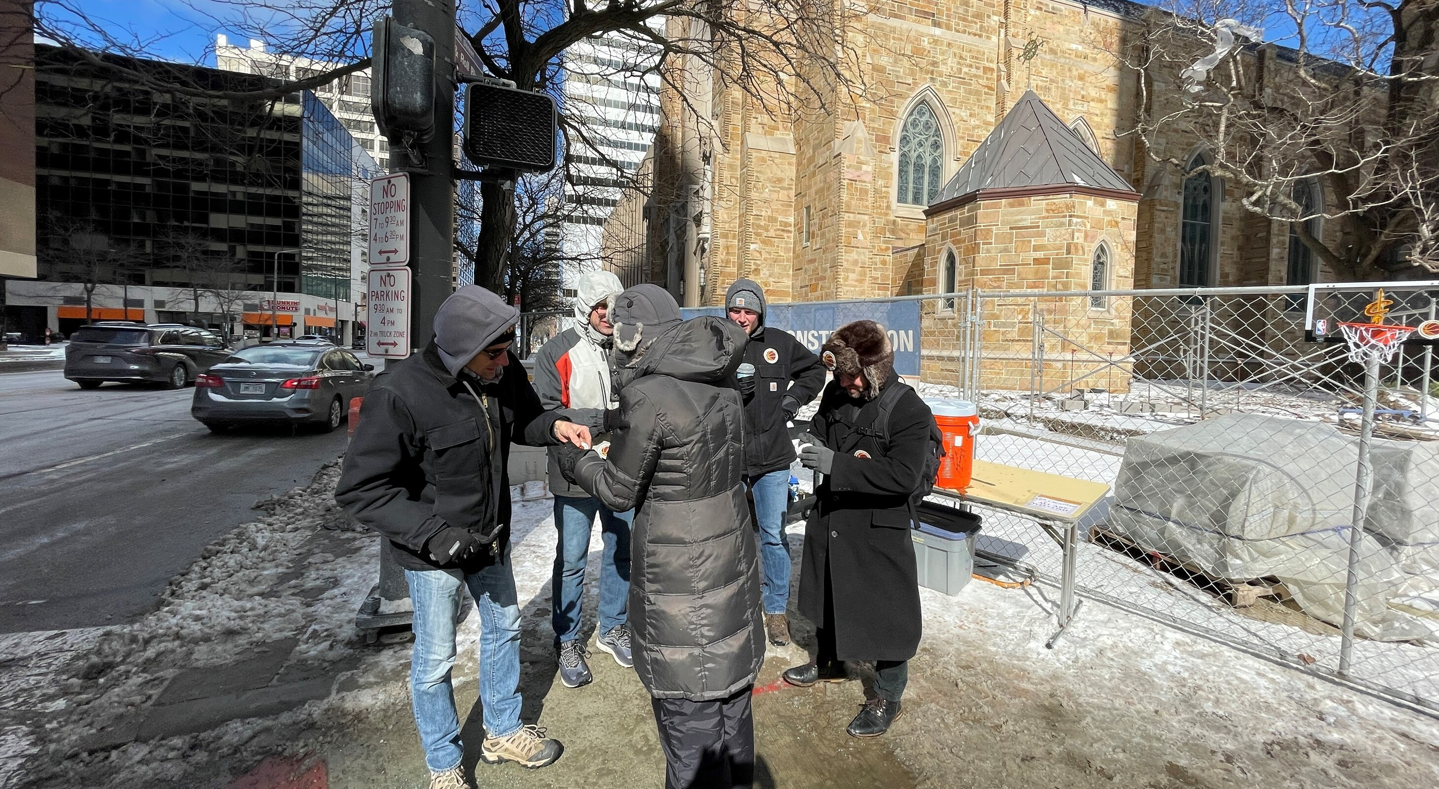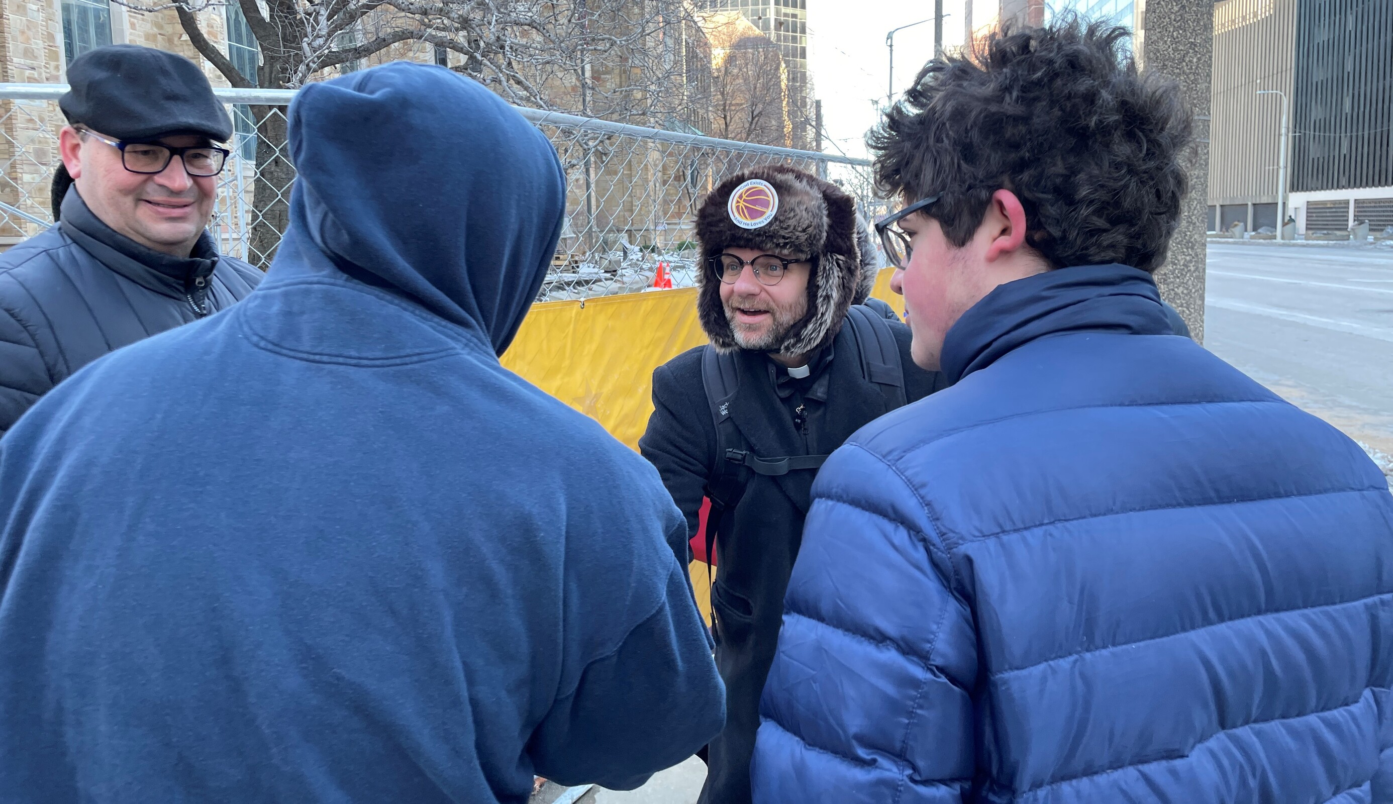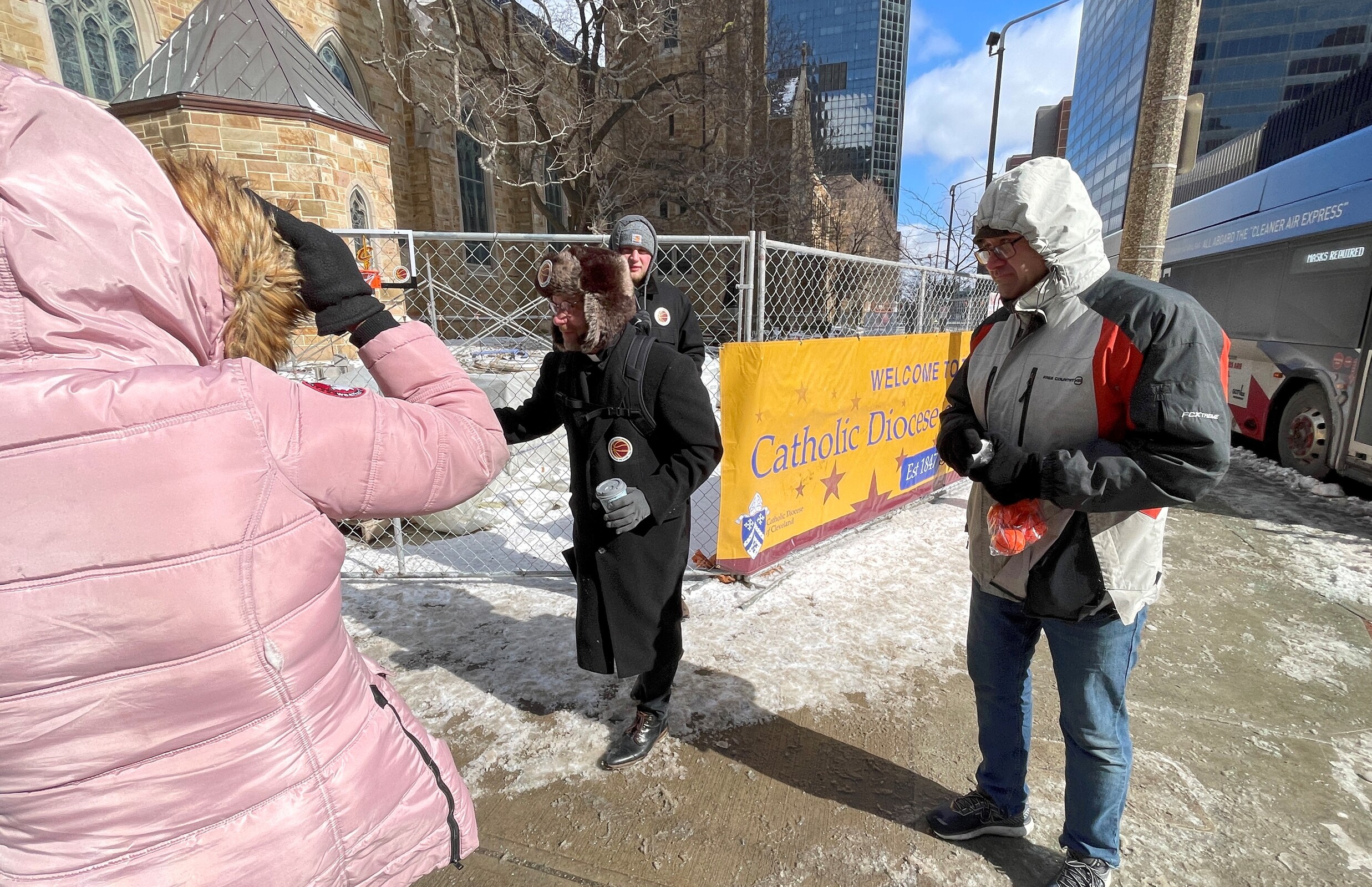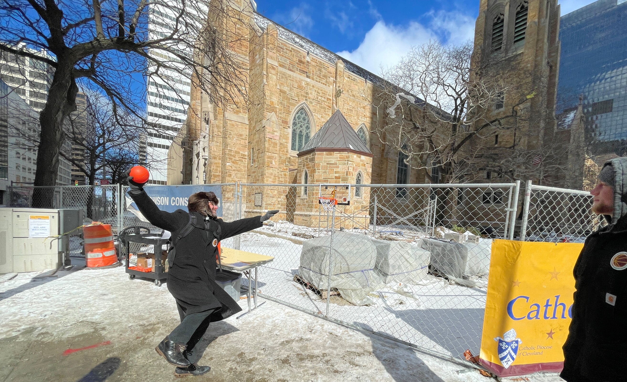 Volunteers offered friendly greetings to passersby, distributed the stickers, mini basketballs and free hot chocolate. They also invited people to visit the cathedral and pray. And there even was a mini basketball hoop attached to the construction fence in front of the cathedral so visitors could have some fun shooting hoops if they wanted.