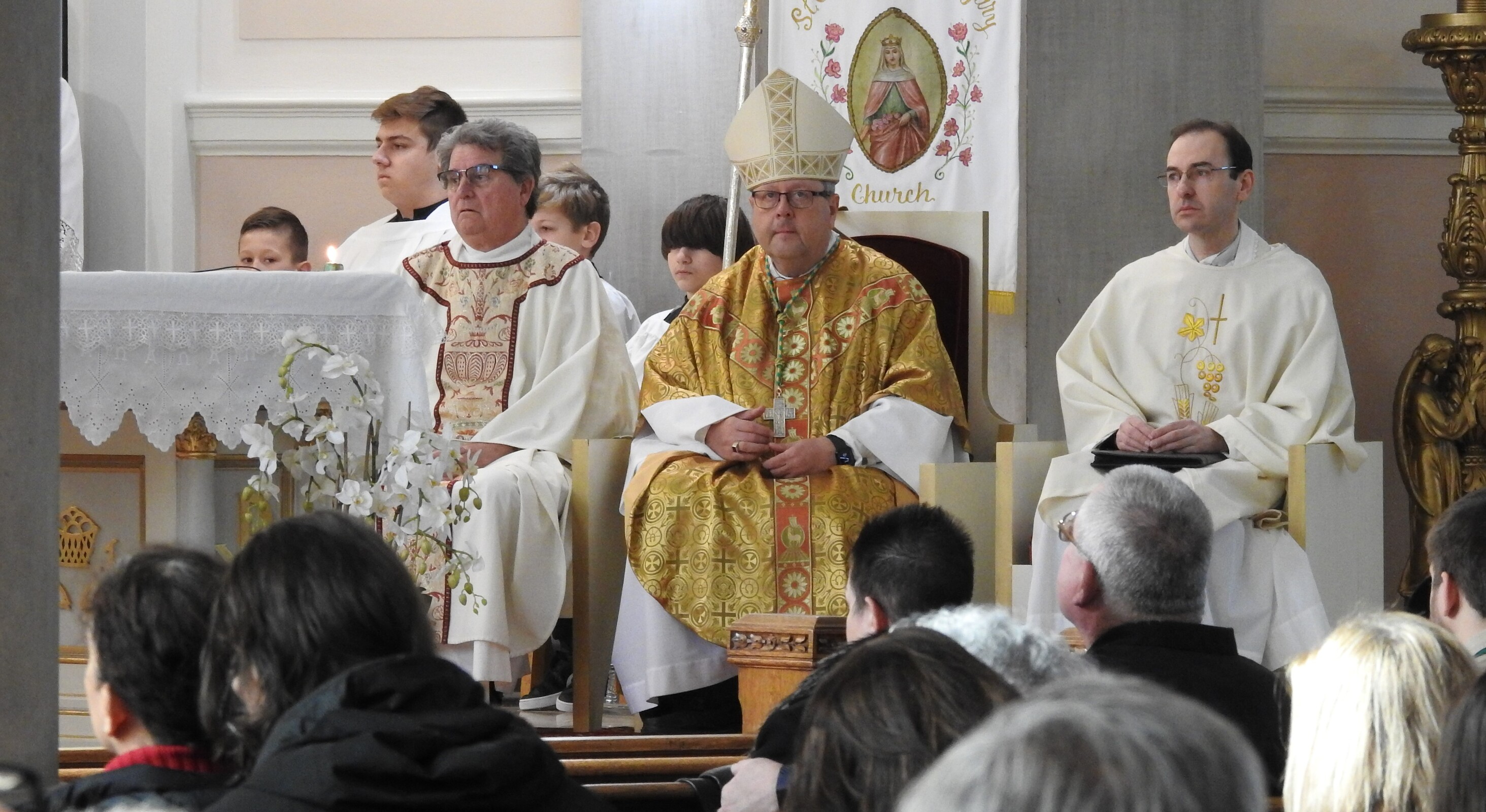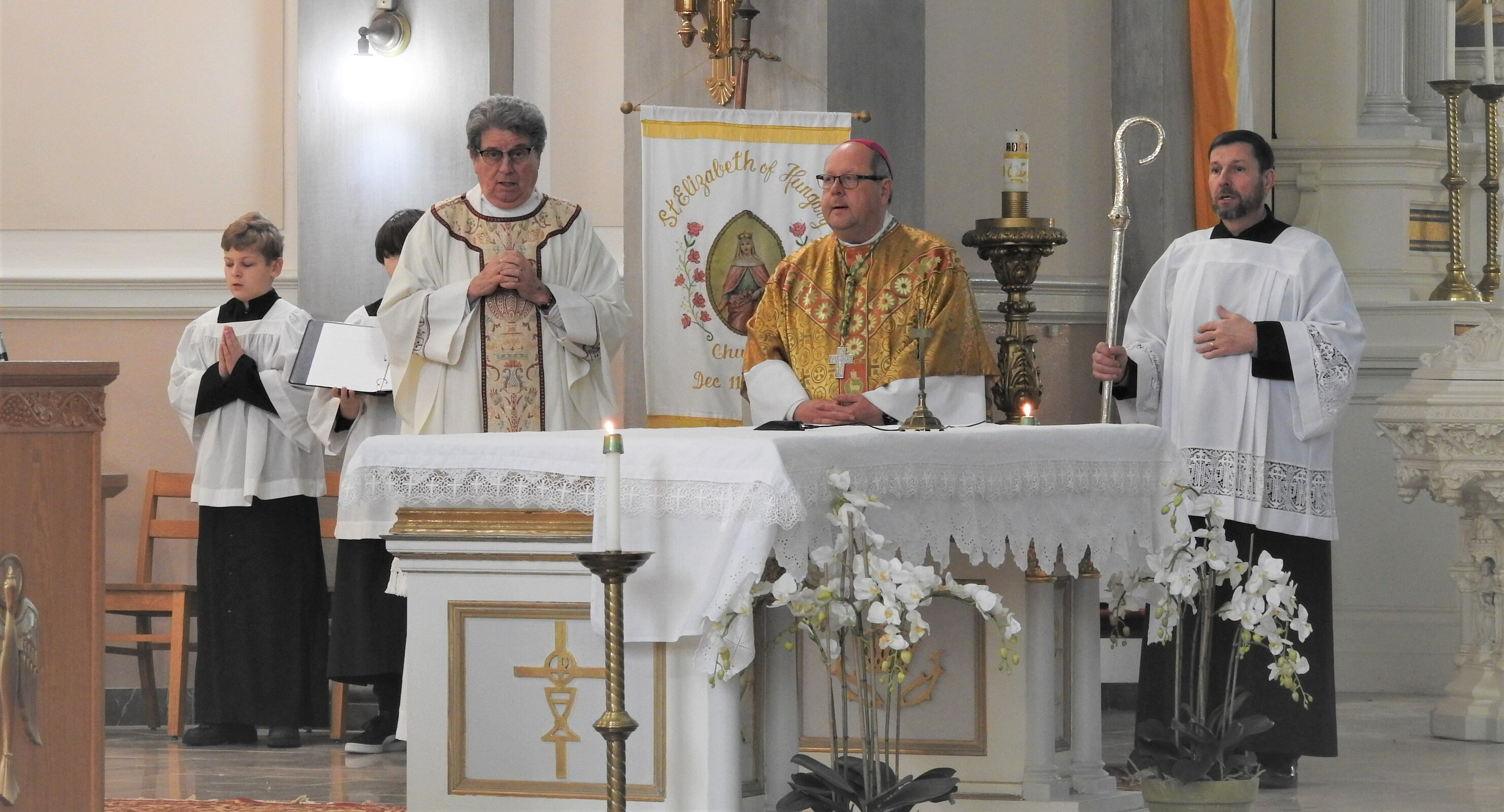 St. Elizabeth of Hungary Parish, the mother church of the other two Hungarian parishes in the Diocese of Cleveland – St. Emeric (1904), where Father Bona also serves as pastor, and St. Margaret (1918-2009) – celebrated three occasions on Feb. 20. Bishop Edward Malesic celebrated Mass at which Father Richard Bona was installed as pastor, he blessed the church’s restored bells and marked the 100th anniversary of the consecration of the church at 9016 Buckeye Ave. in Cleveland.