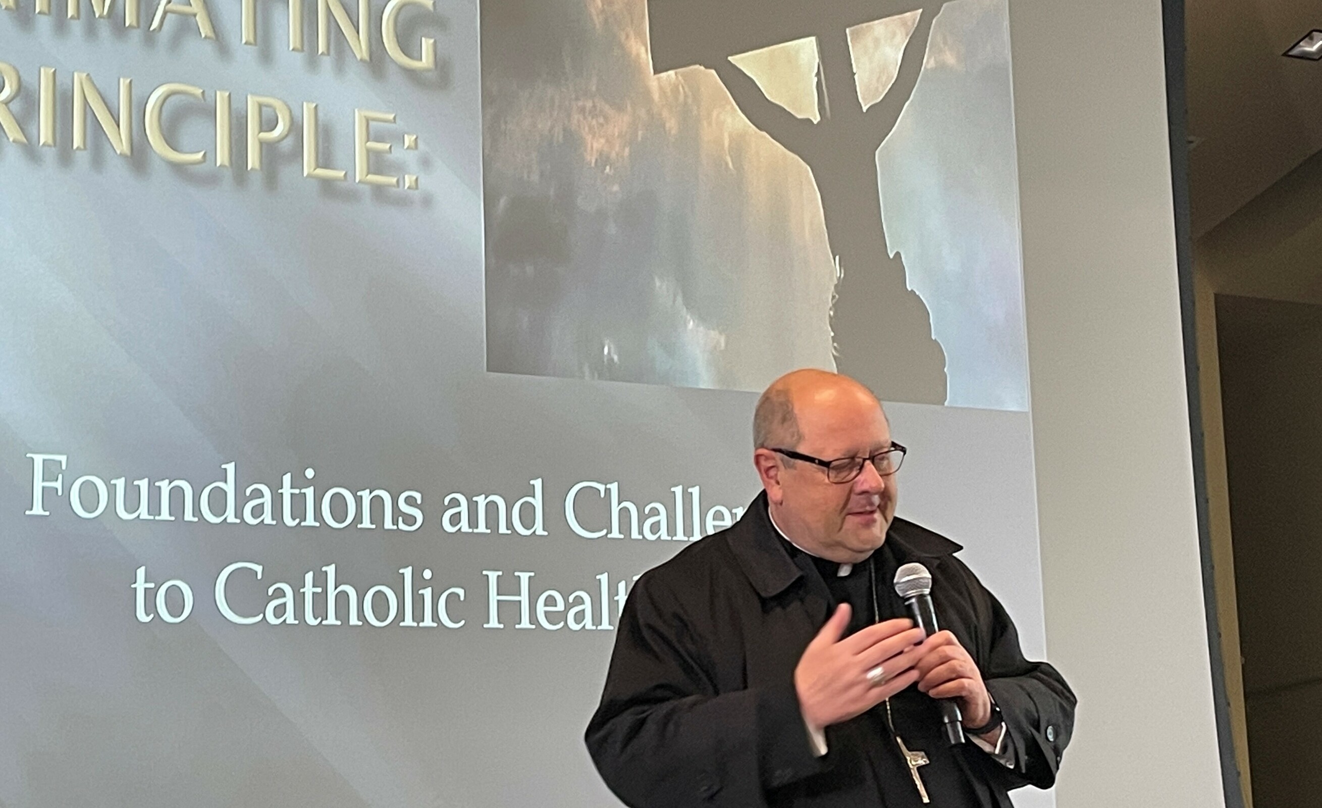 After Mass, the bishop joined attendees in the Parish Life Center, where he opened the presentation part of the conference with a prayer before turning the microphone over to conference leaders who kicked off a series of presentations by an interdisciplinary group of medical, bioethical and theological experts.
