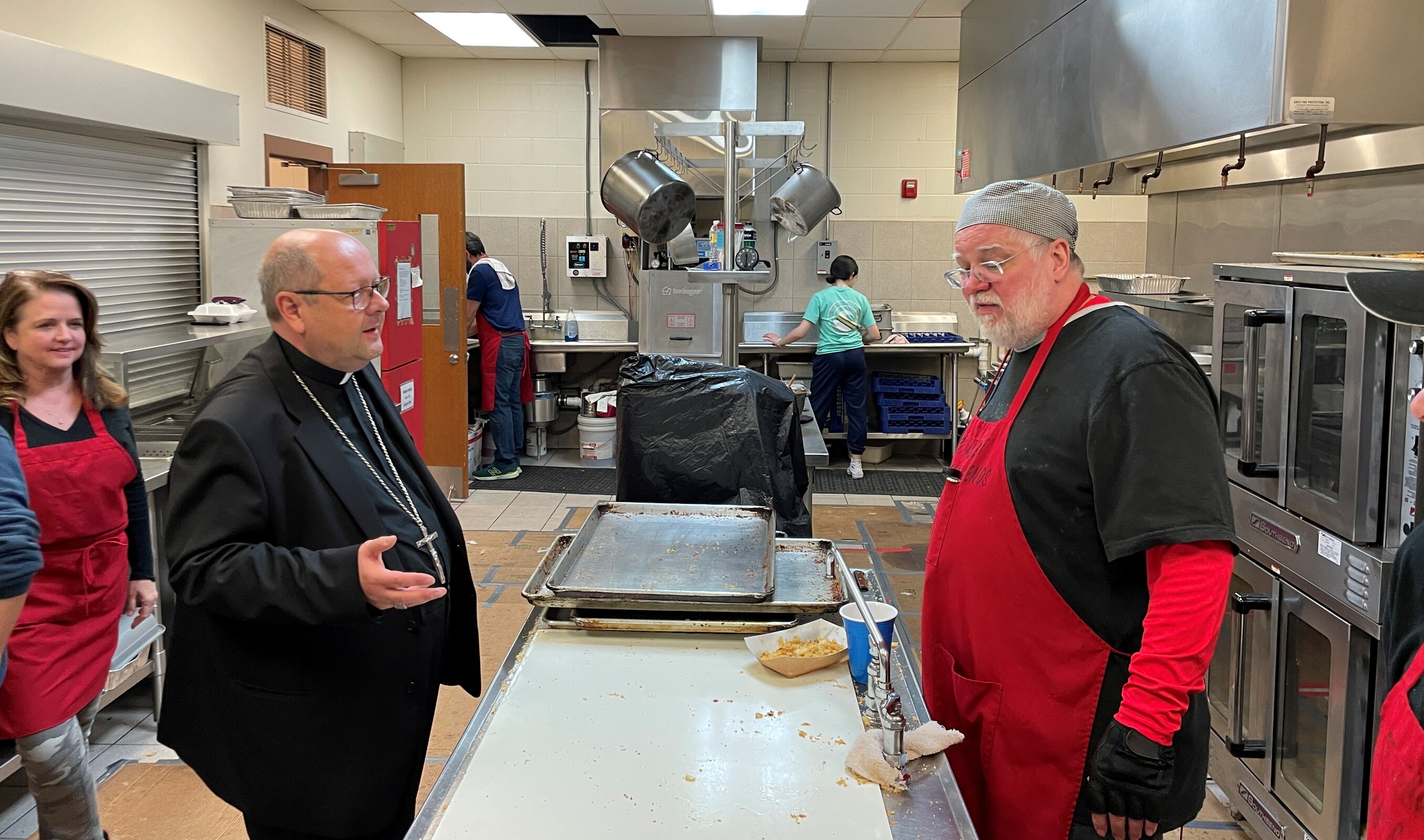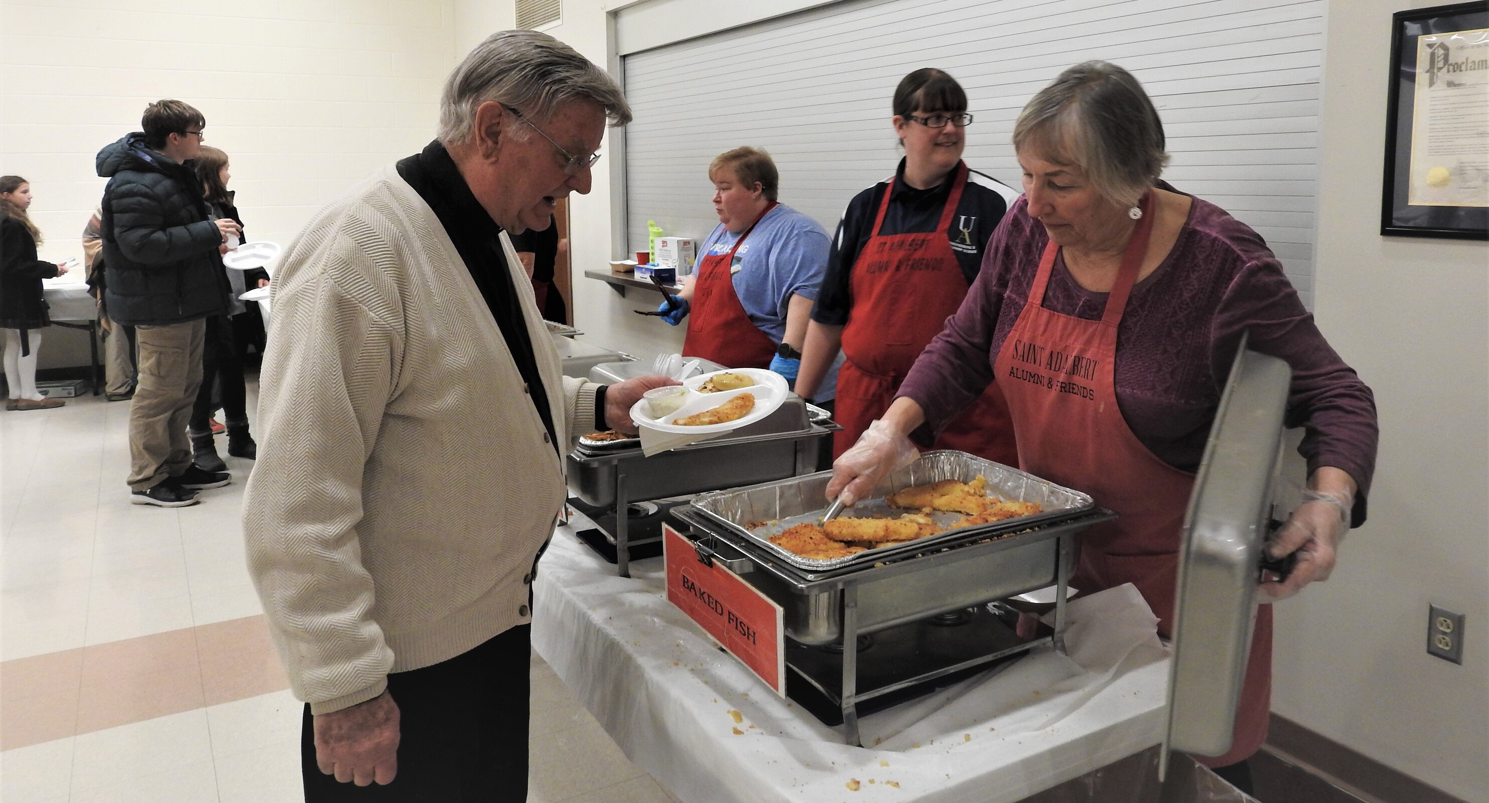 The bishop made a few brief remarks after the Stations before heading to the parish hall to sample the fish fry. He chatted with volunteers in the kitchen and those serving customers. The meal included baked perch, macaroni and cheese, two kinds of pierogi – sauerkraut and potato and cheese – cabbage and noodles, fries and coleslaw. Father Gerald Keller, pastor emeritus who served the parish 1974-2008 and after whom the parish hall is named, joined Father Butkowski and the bishop for the fish fry.
