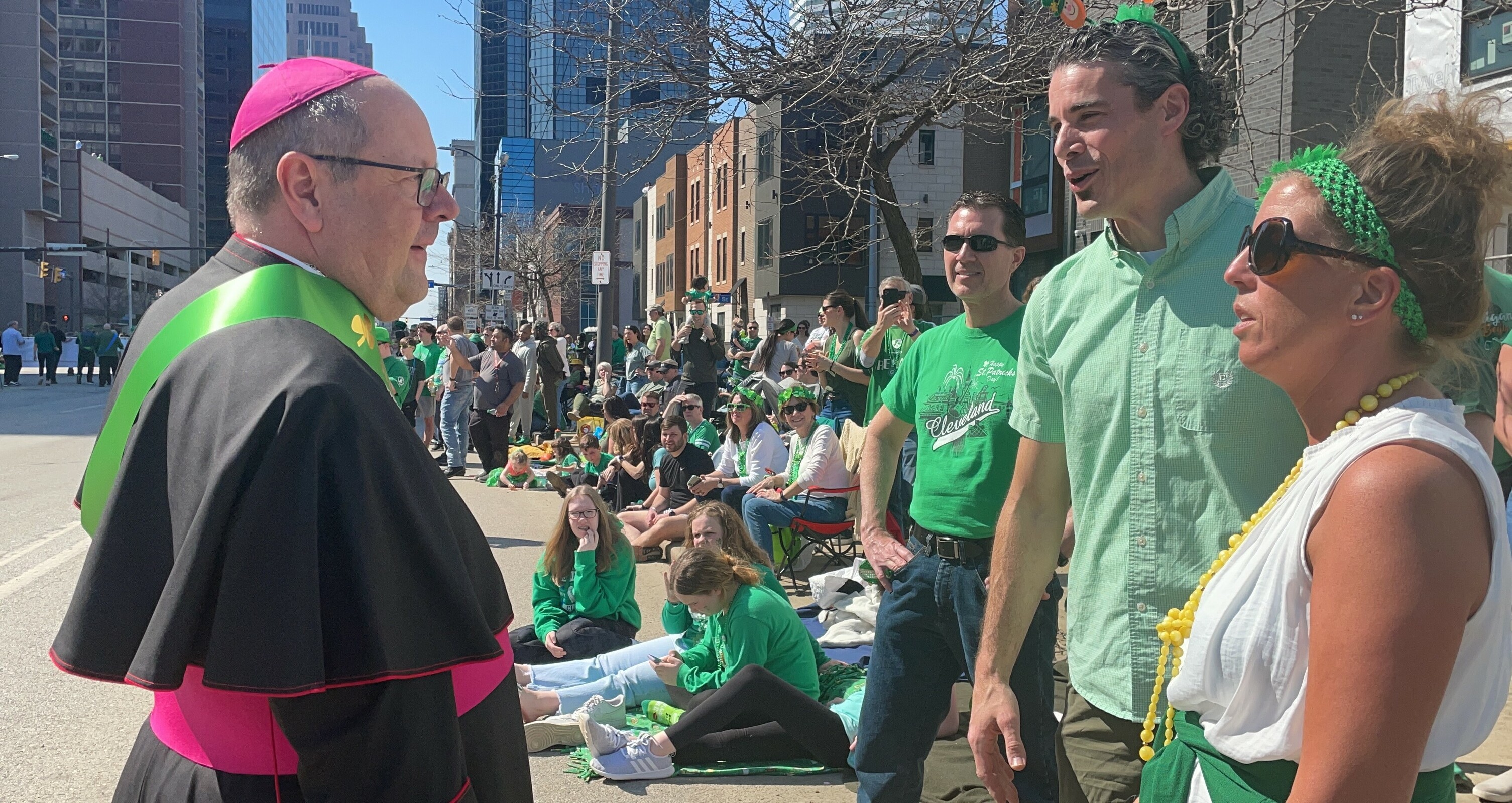 Prior to the parade, Bishop Malesic mingled for a few minutes with the crowd lining Superior Avenue for the festivities. Then he gathered with other dignitaries and honorees to bless the parade, which stepped off from East 18th Street and Superior, marched west on Superior to Public Square, then turned onto Rockwell Avenue before disbanding. The bishop walked in the parade for a while, joining seminarians from Borromeo and Saint Mary seminaries.