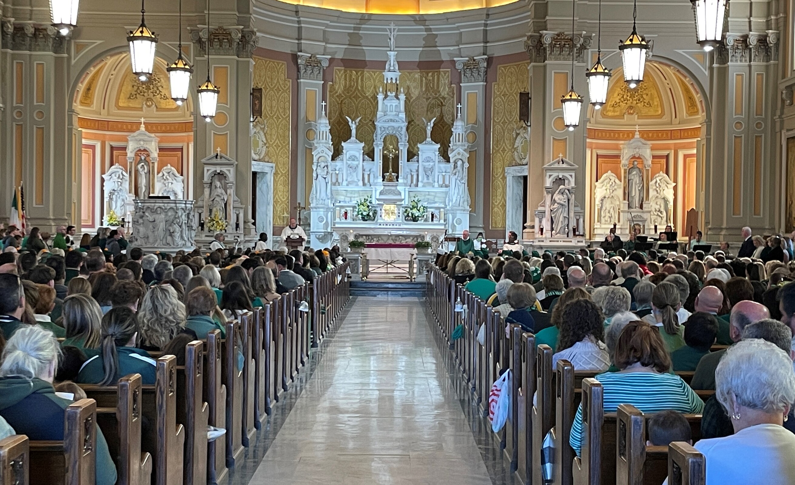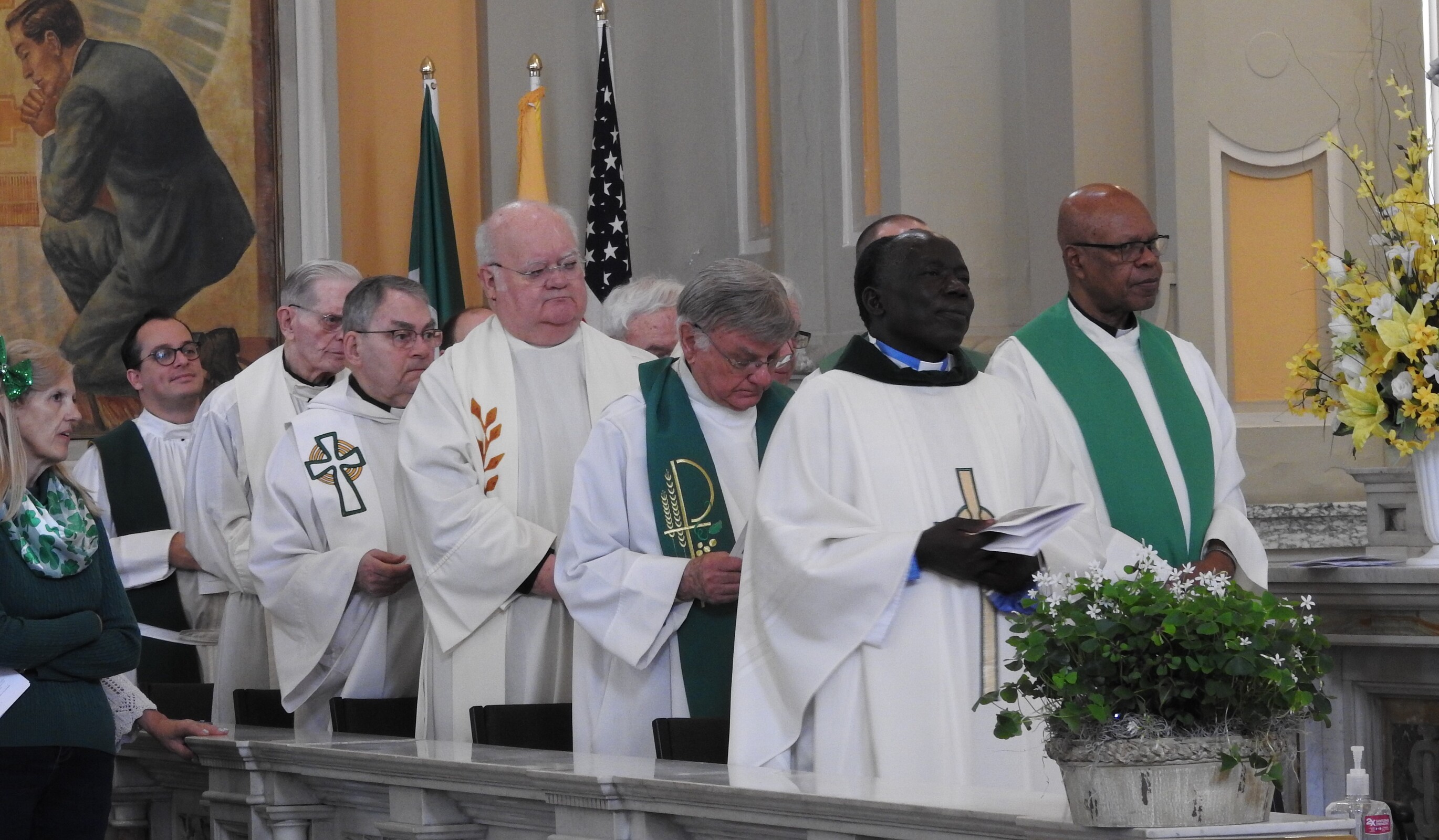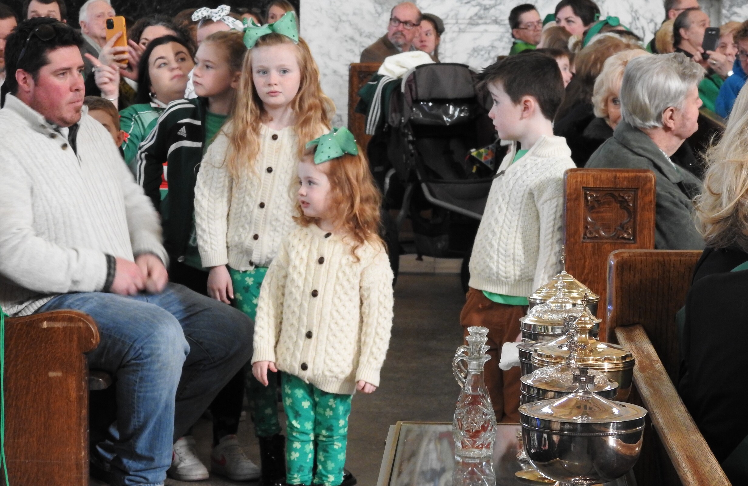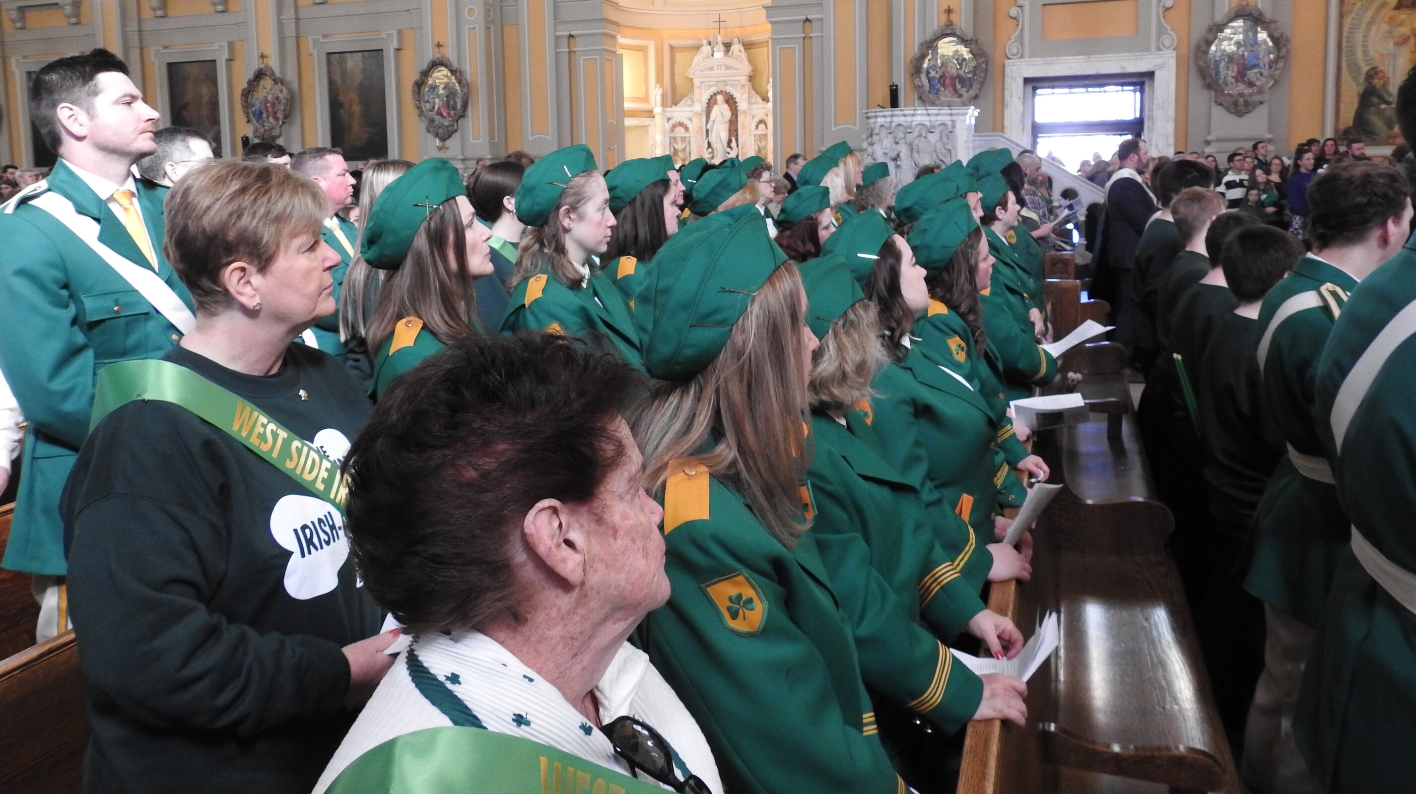 Members, honorees, parade units and friends of the West Side Irish American Club gathered for the annual pre-parade liturgy. There were about a dozen concelebrants included Father Caroli Shao, AJ, St. Colman pastor; Father Benjamin Koka, AJ, St. Colman parochial vicar; and Father Thomas Mahoney, a retired diocesan priest and Hibernian of the Year.