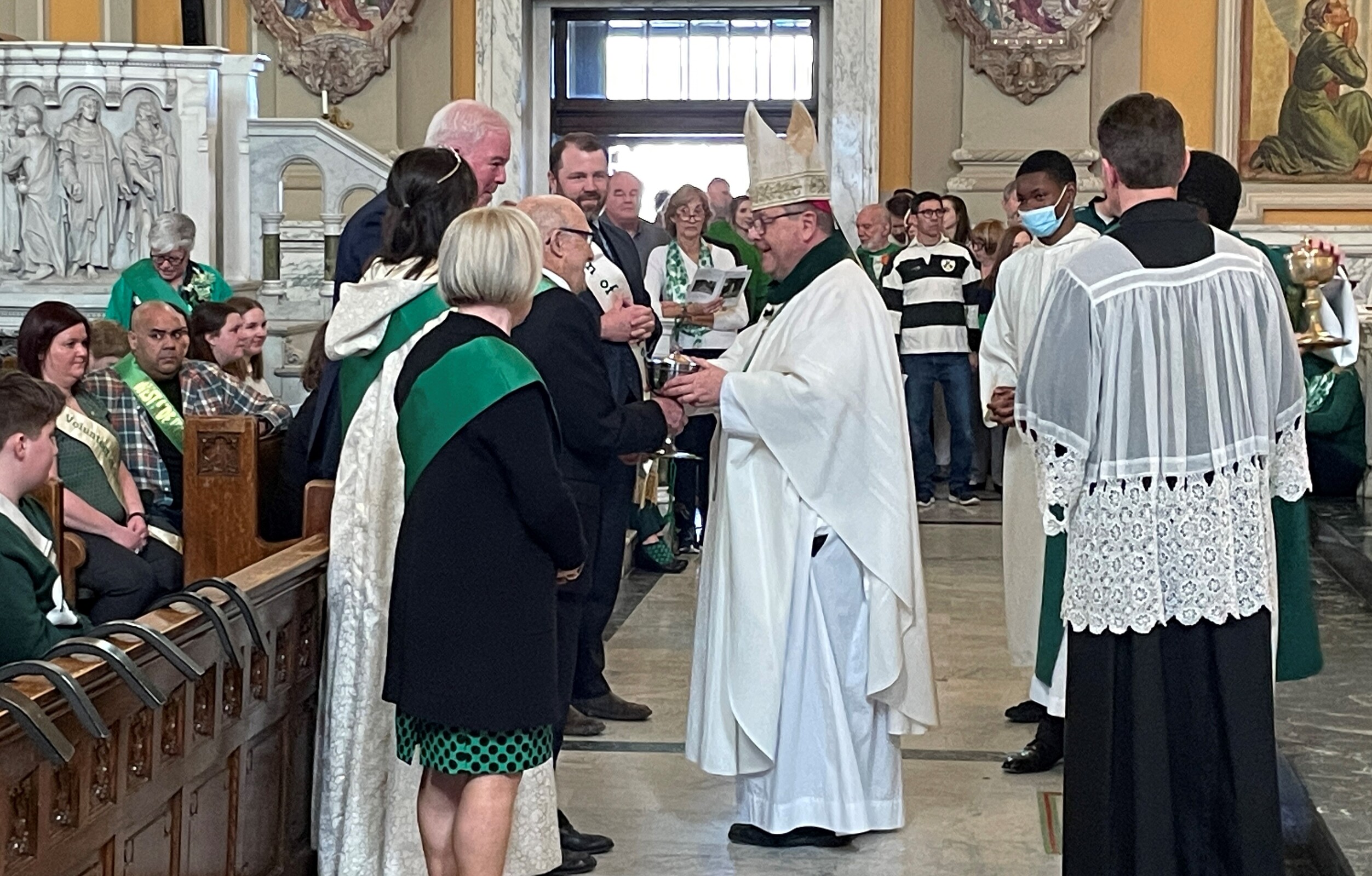 At the beginning of Mass, he blessed the two traditional, large shamrock plants – one of which was presented to him – and the congregation. In his homily, the bishop noted that St. Colman’s has opened its doors to the large Irish community in Northeast Ohio for many years. “And more than that, you have opened your doors to those who love the Irish,” he said.