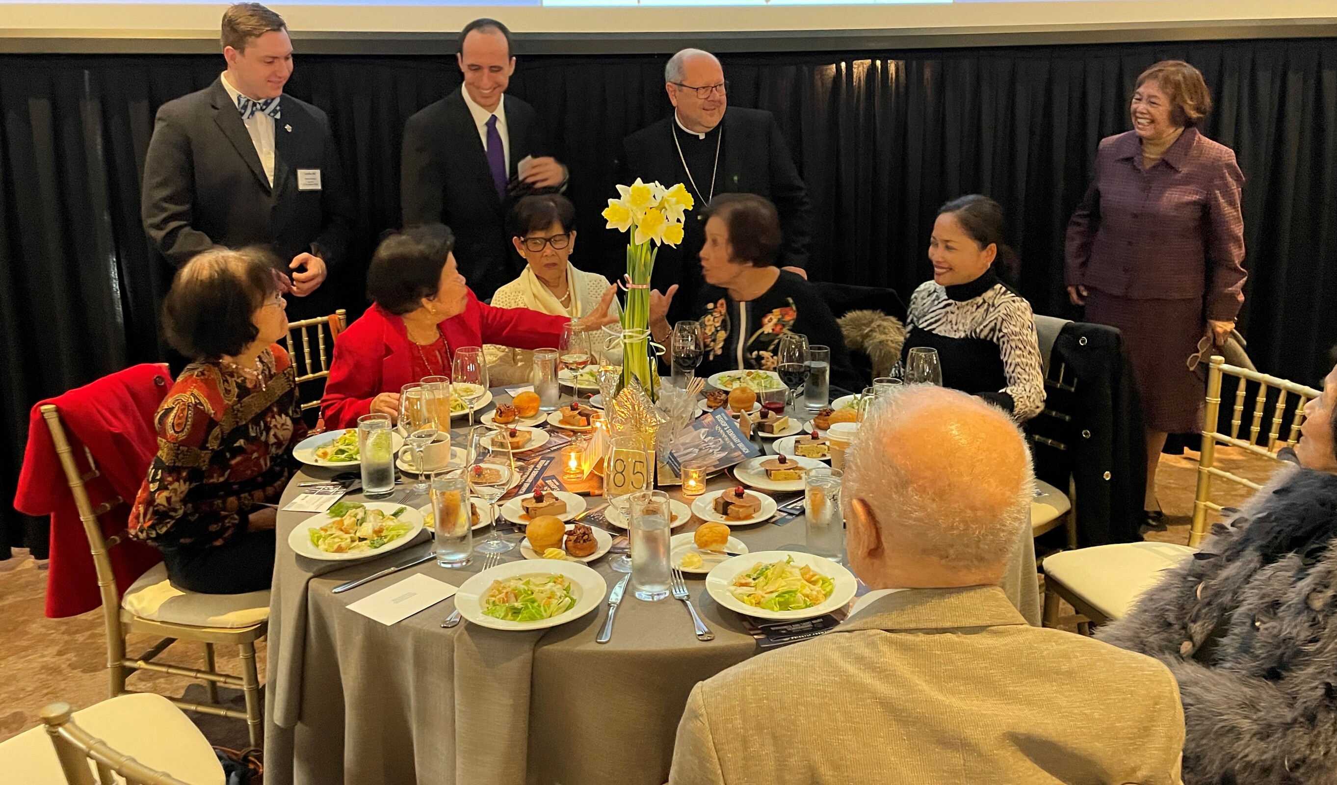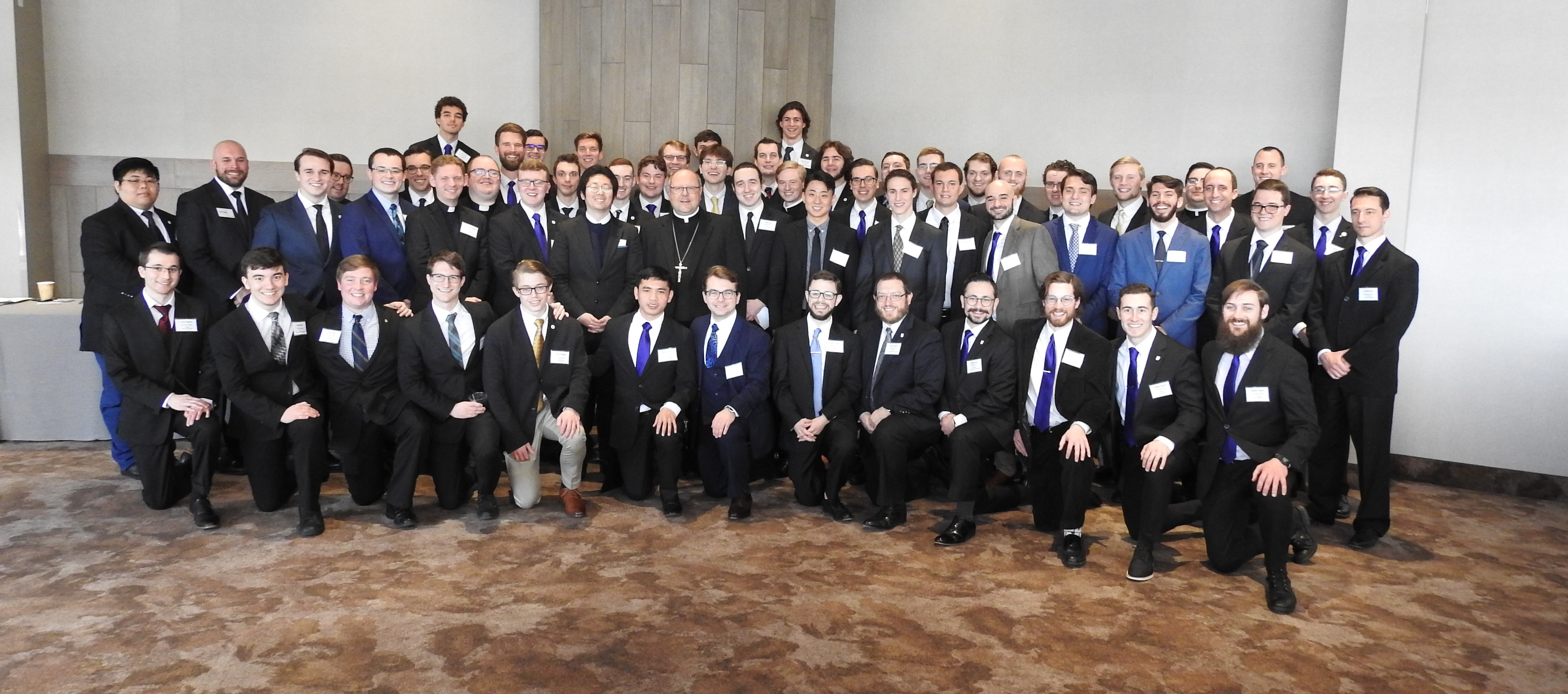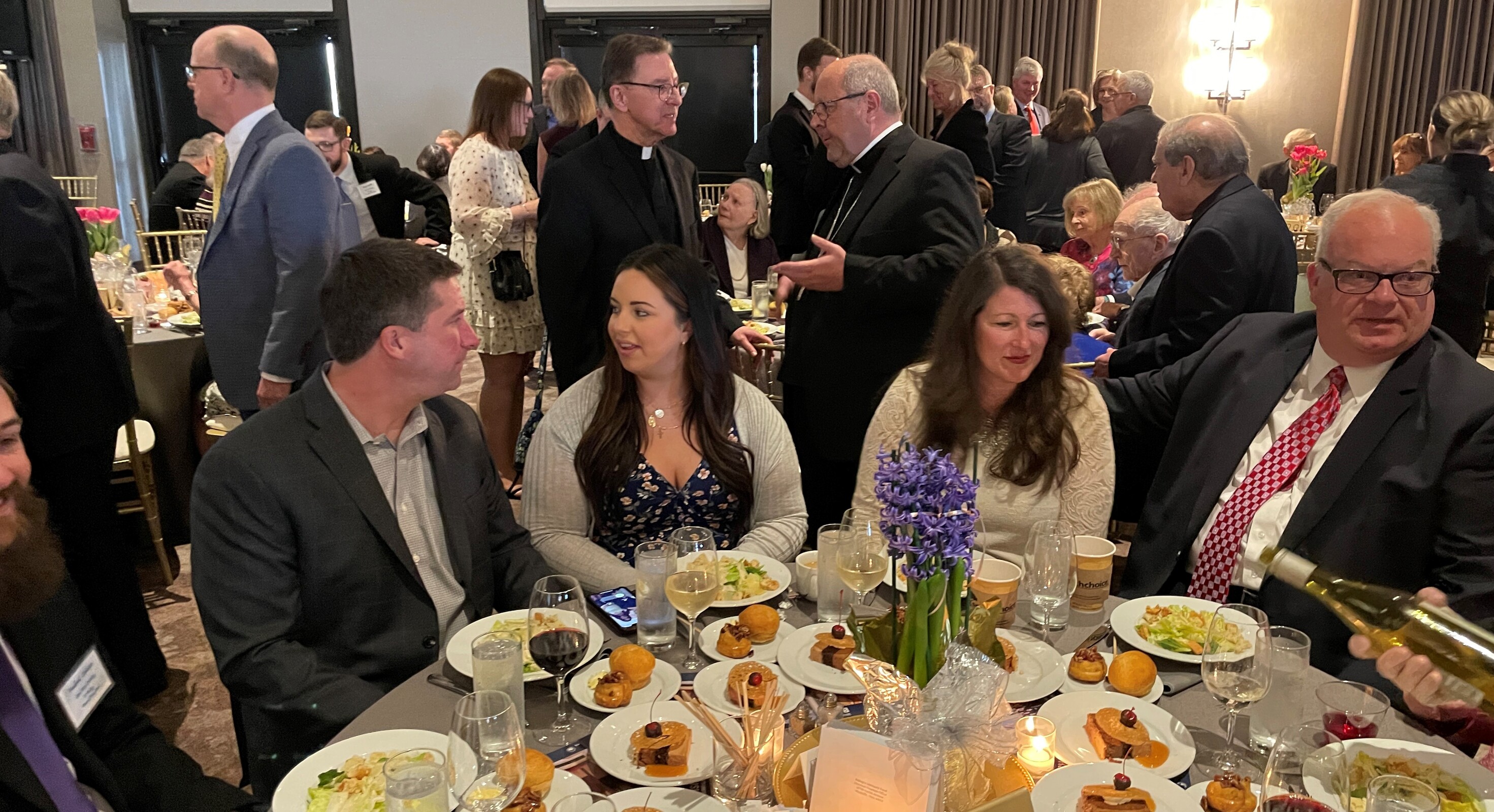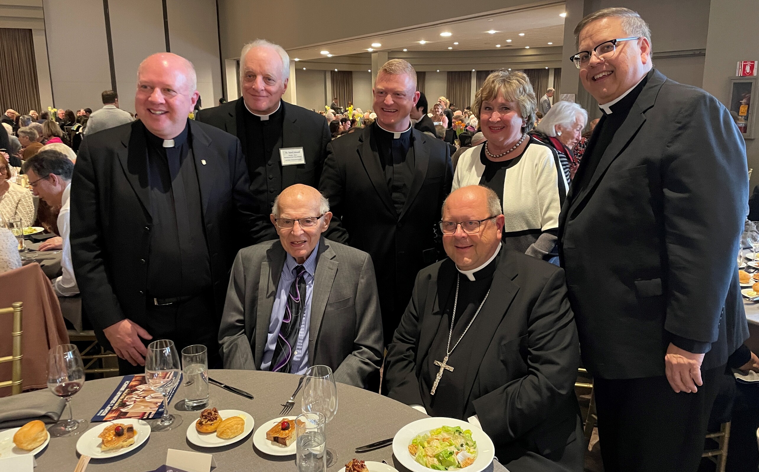 Seminarians formed two lines outside the ballroom and as guests left, they were invited to drop pledge envelopes in the large silver bowls held by some of the seminarians.