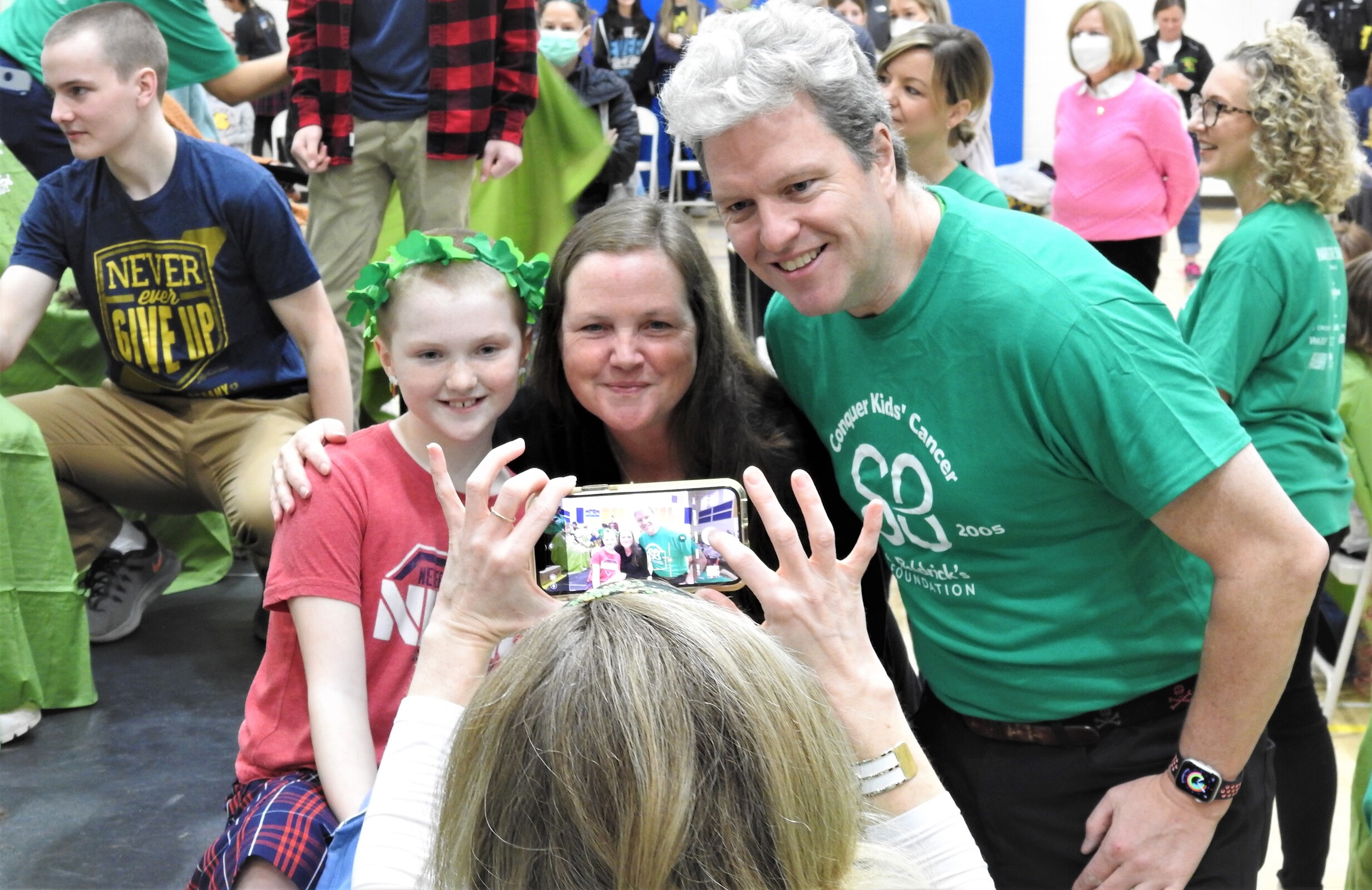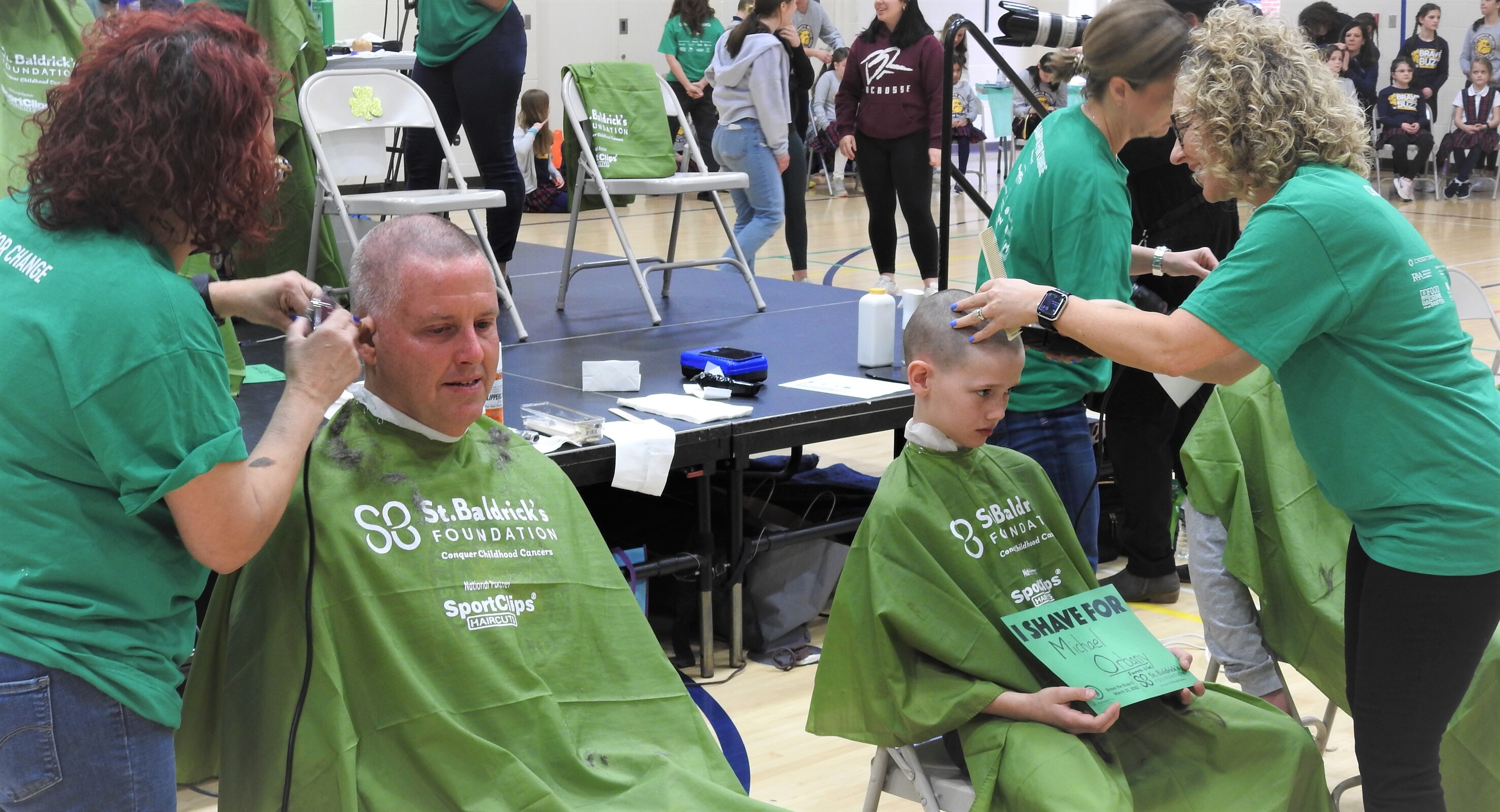 Among the first group of shavees were Ruby Stilla, a first-grader, and Maggie Chambers, a fourth-grader. Both donated 12 or more inches of hair before having their heads shaved and receiving a shamrock crown. This was the second time that Maggie, who also was the largest fundraiser, had her head shaved.