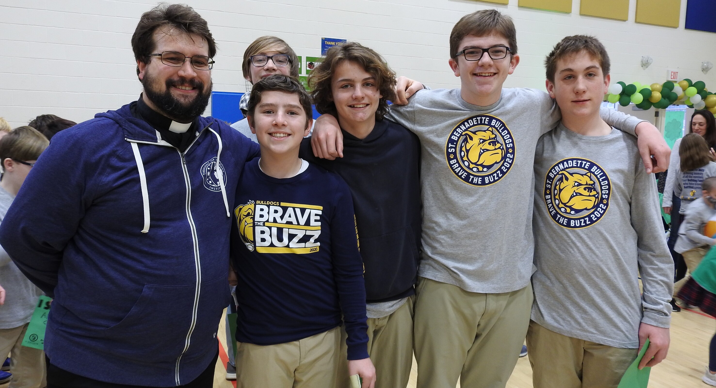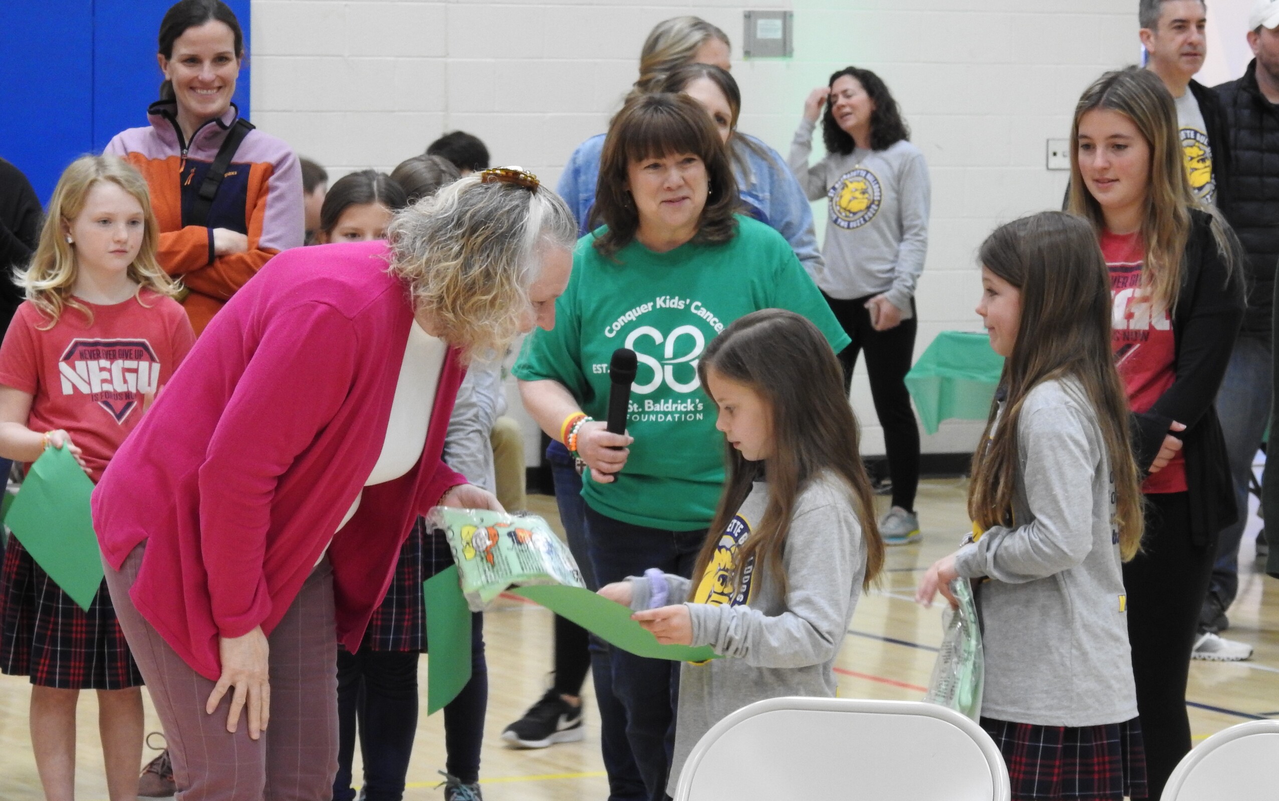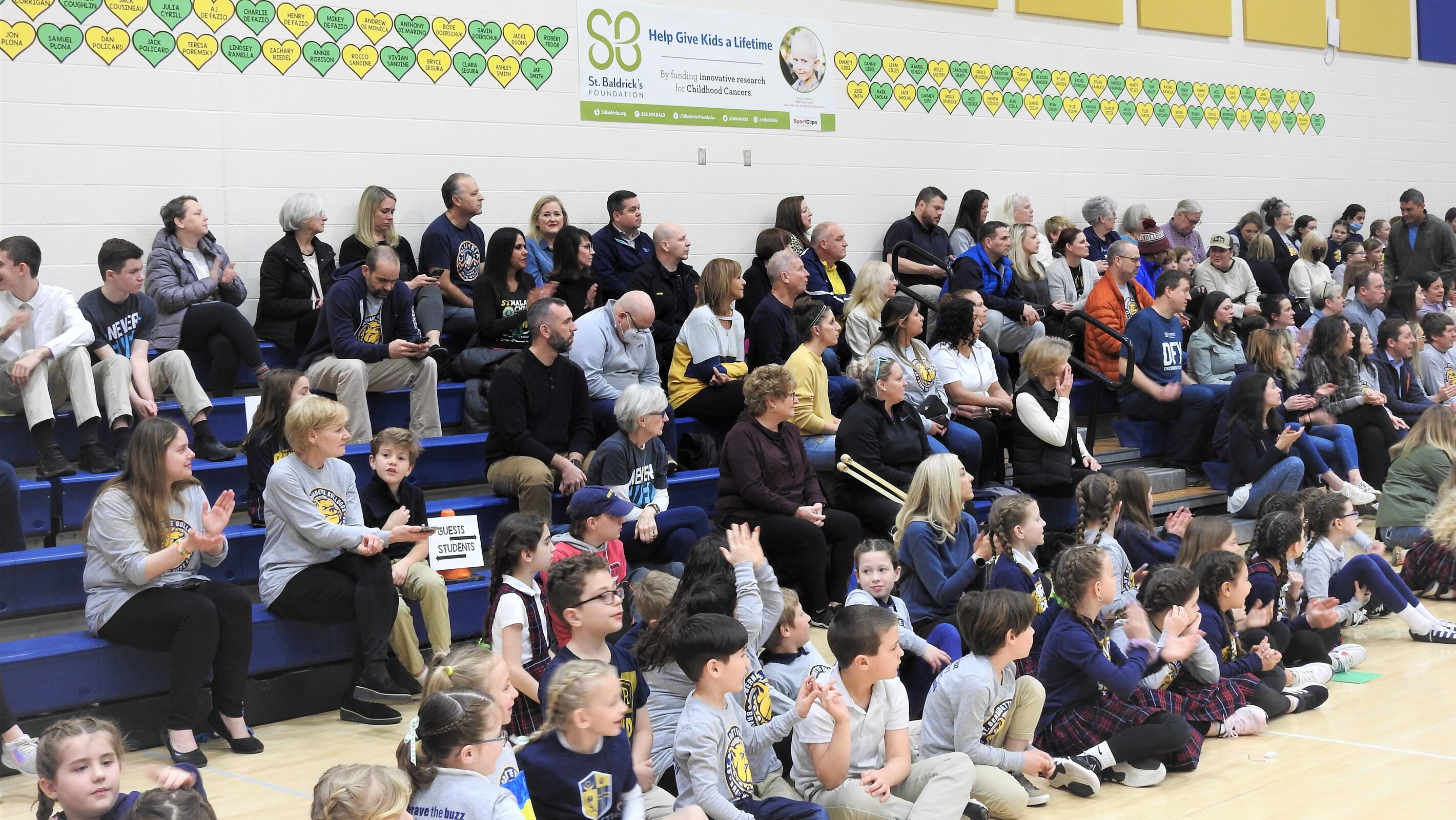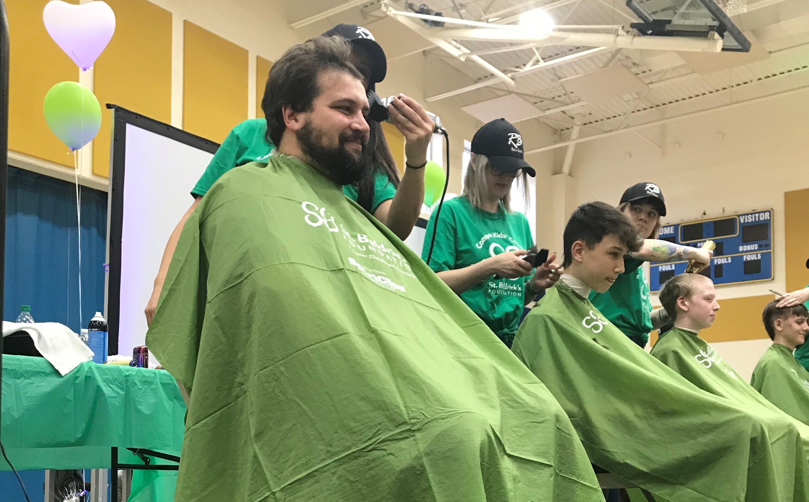 There was plenty of lively music in the gym as those in the stands cheered for the shaves. The St. Bernadette Bulldog cheerleaders helped pump up the crowd. Students waiting their turn to have their heads shaved were seated in one area of the gym and were bouncing beach balls. Meanwhile, the bulldog mascot made the rounds in the gym offering high-fives and waving to the crowd.
