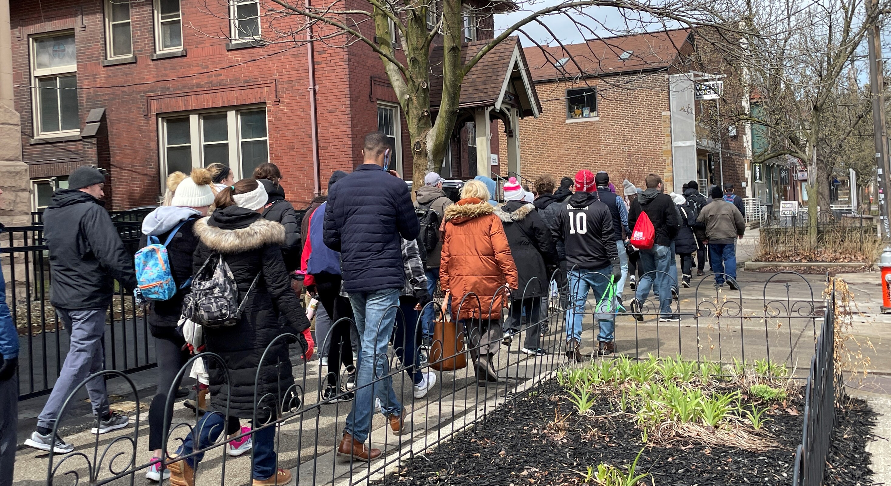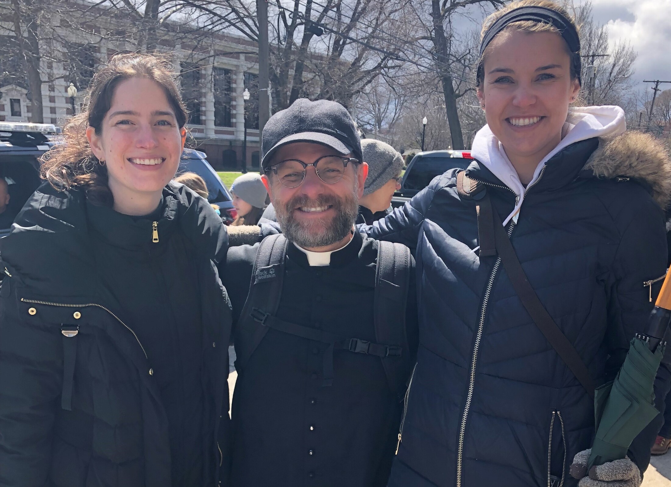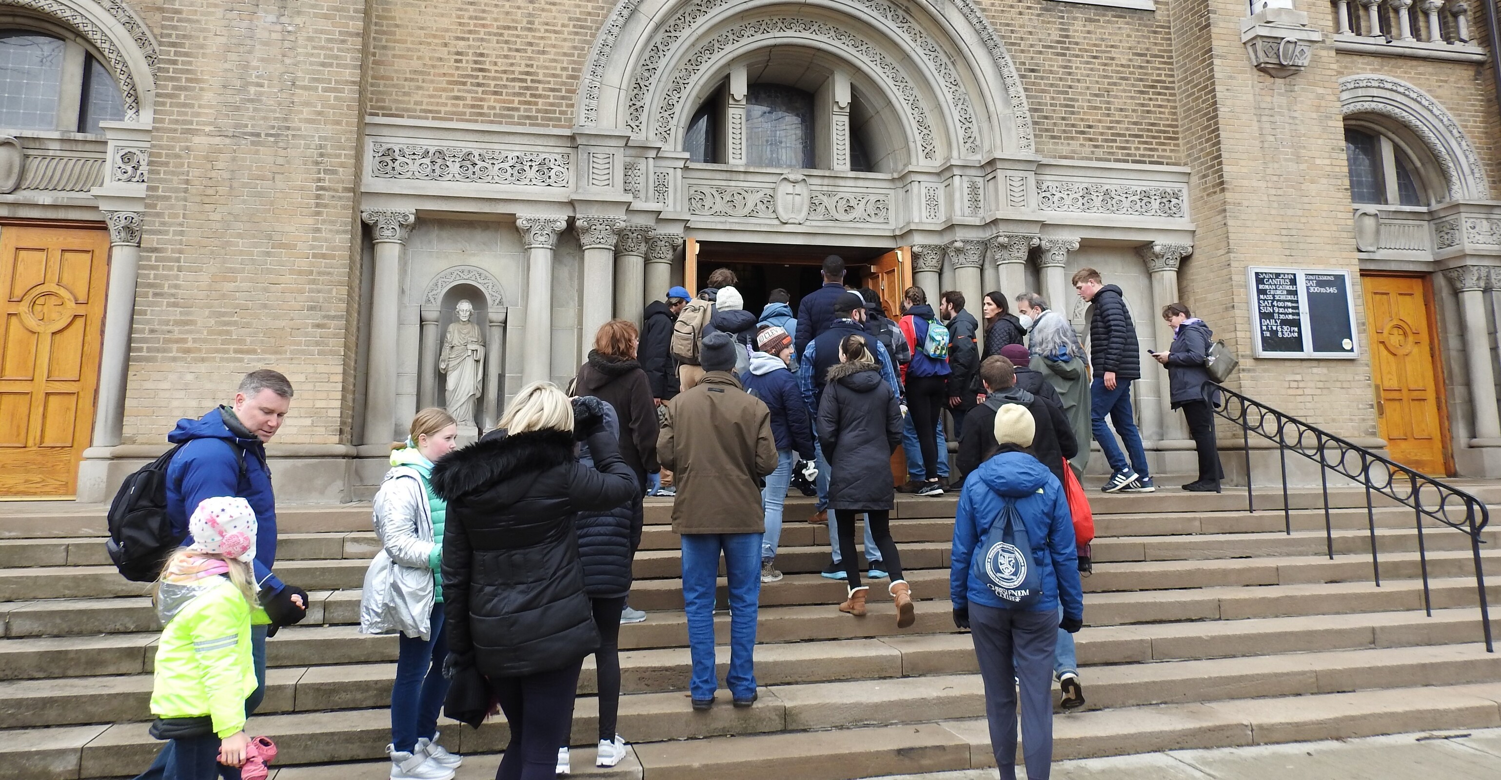 Those participating in the pilgrimage ranged in age from elementary school students to senior citizens. As they left the cathedral in the morning, most were using umbrellas to shield themselves from a cold, sometimes slushy rain. But by the time they arrived at the first stop – St. John Cantius – the sun was popping out. Although it remained chilly, the sun stayed out the rest of the day.