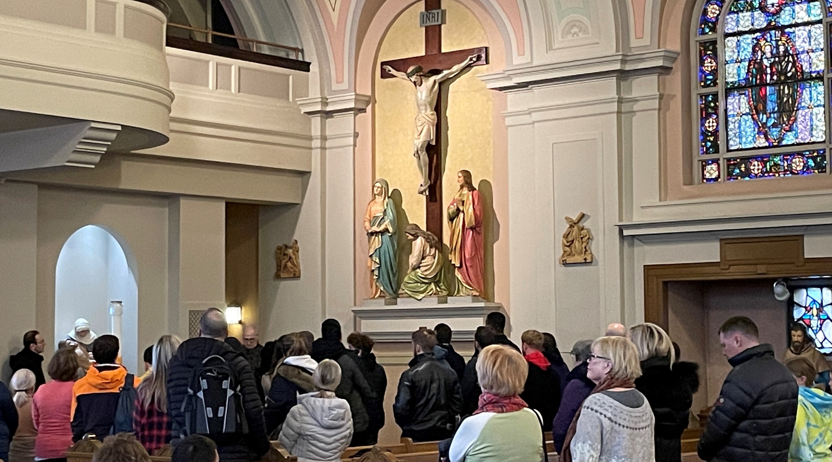 Father Kropac invited the pilgrims to gather near a wall sculpture at St. Wendelin depicting the crucified Jesus with the Blessed Mother and St. John the apostle at the foot of the cross. He asked the group to meditate on Jesus telling Mary to “behold her son” and St. John to “behold your mother.” He noted that often the stained-glass windows, statues and other images in the church were used to tell a story and to help spread the faith.