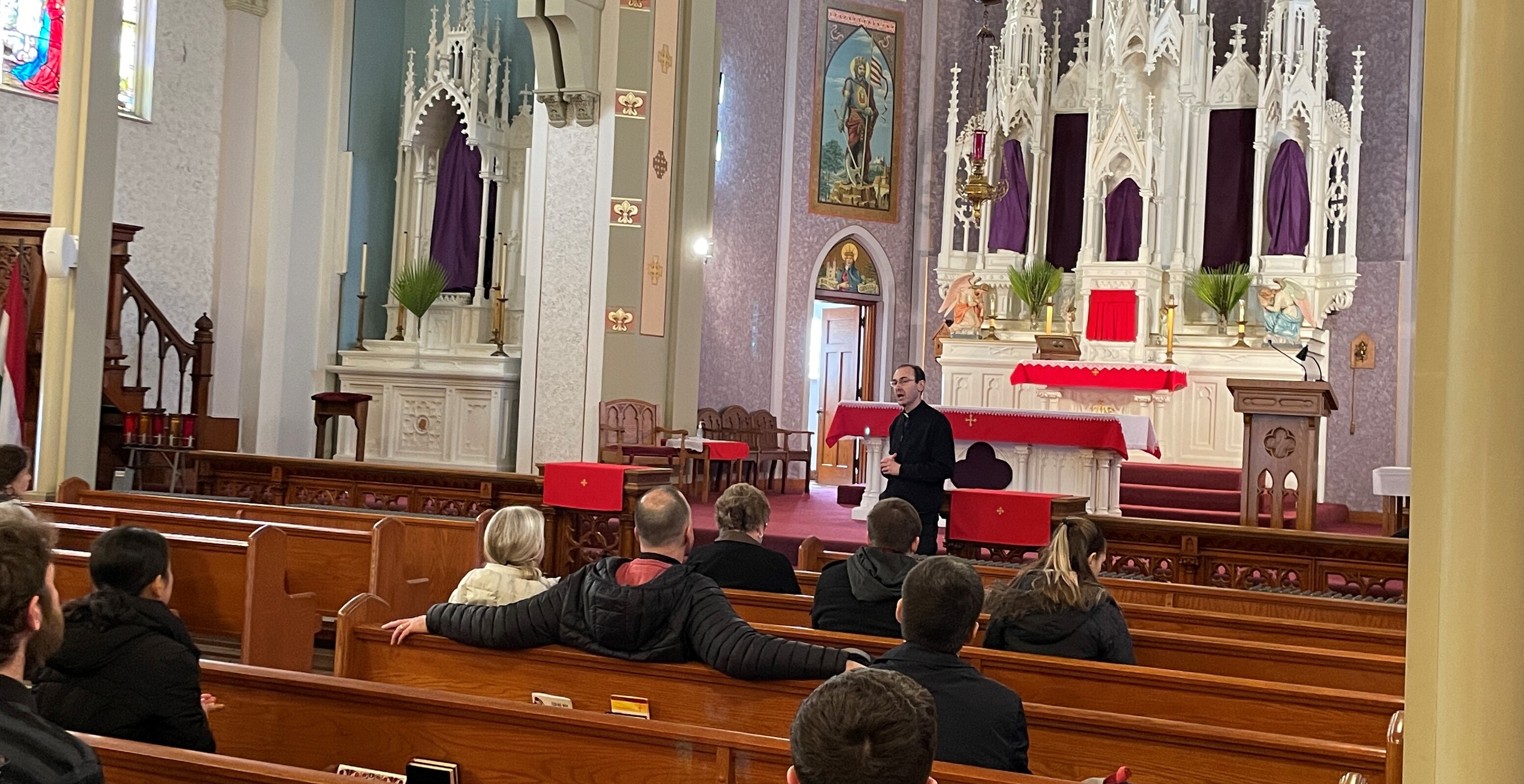 So, Father Bona mapped out six churches on Cleveland’s West Side that are within walking distance of the Cathedral of St. John the Evangelist. The cathedral was the starting and ending point for the pilgrimage. In addition to a meditation and short prayer time at each church, the pilgrims learned about the rich legacy of some of the diocesan parishes. Before leading the meditation, each pastor gave a brief history of his parish. They noted how the neighborhoods are changing, with gentrification taking place in many of the older areas of the West Side. As a result, there is a renewed opportunity for evangelization and parish growth.