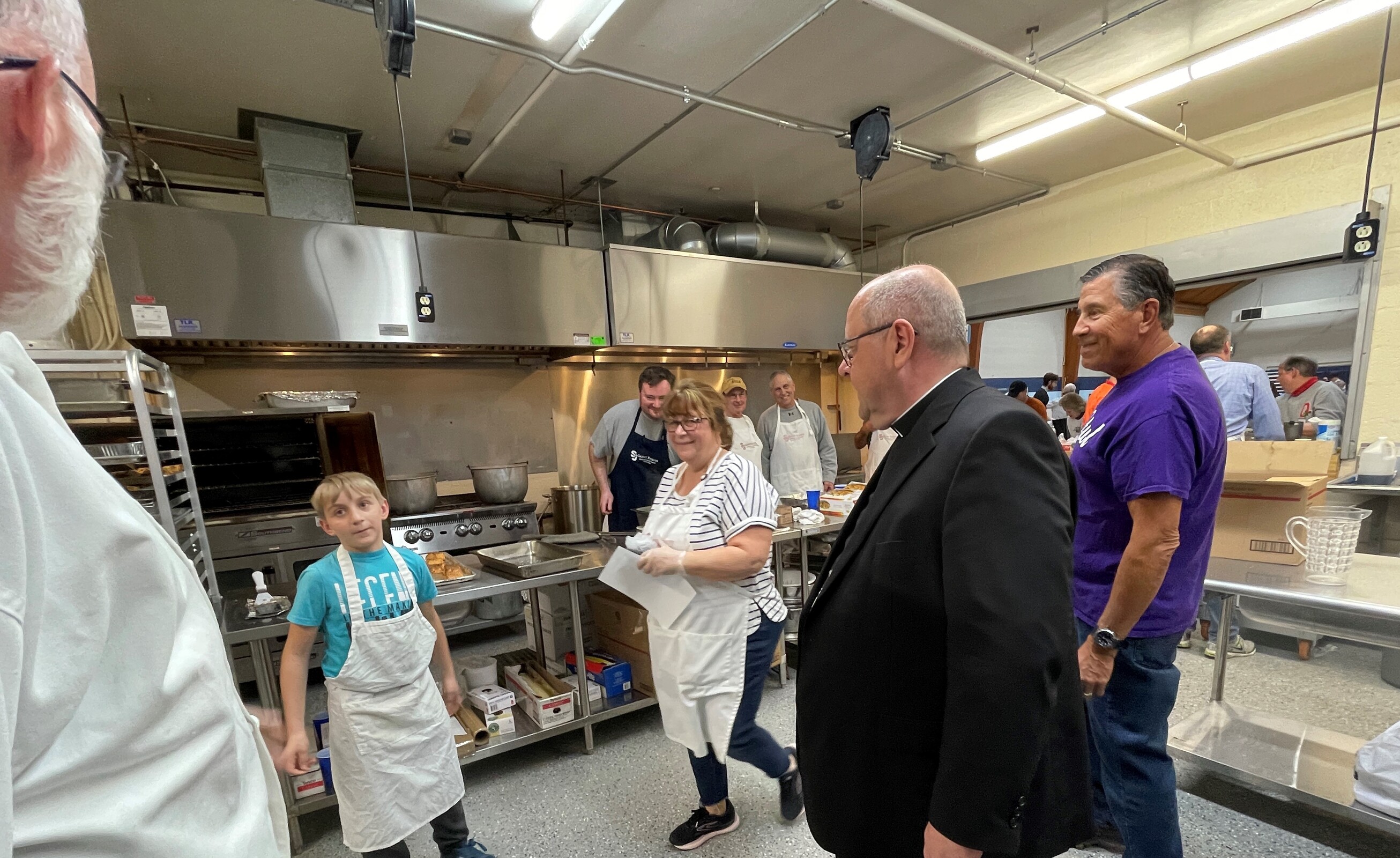 Prior to praying the Stations, he stopped at the parish’s popular fish fry. Father Ron Wearsch, pastor, guided the bishop through the kitchen and take-out areas before they headed to the school gym where he enjoyed a sample of the various entrees offered, including salmon, perch, walleye, shrimp, cabbage and noodles, green beans and homemade tomato bisque soup. Father Wearsch, who has culinary training and worked in restaurants before entering the seminary, works with his brother and other parish volunteers to help prepare the weekly fish fries.