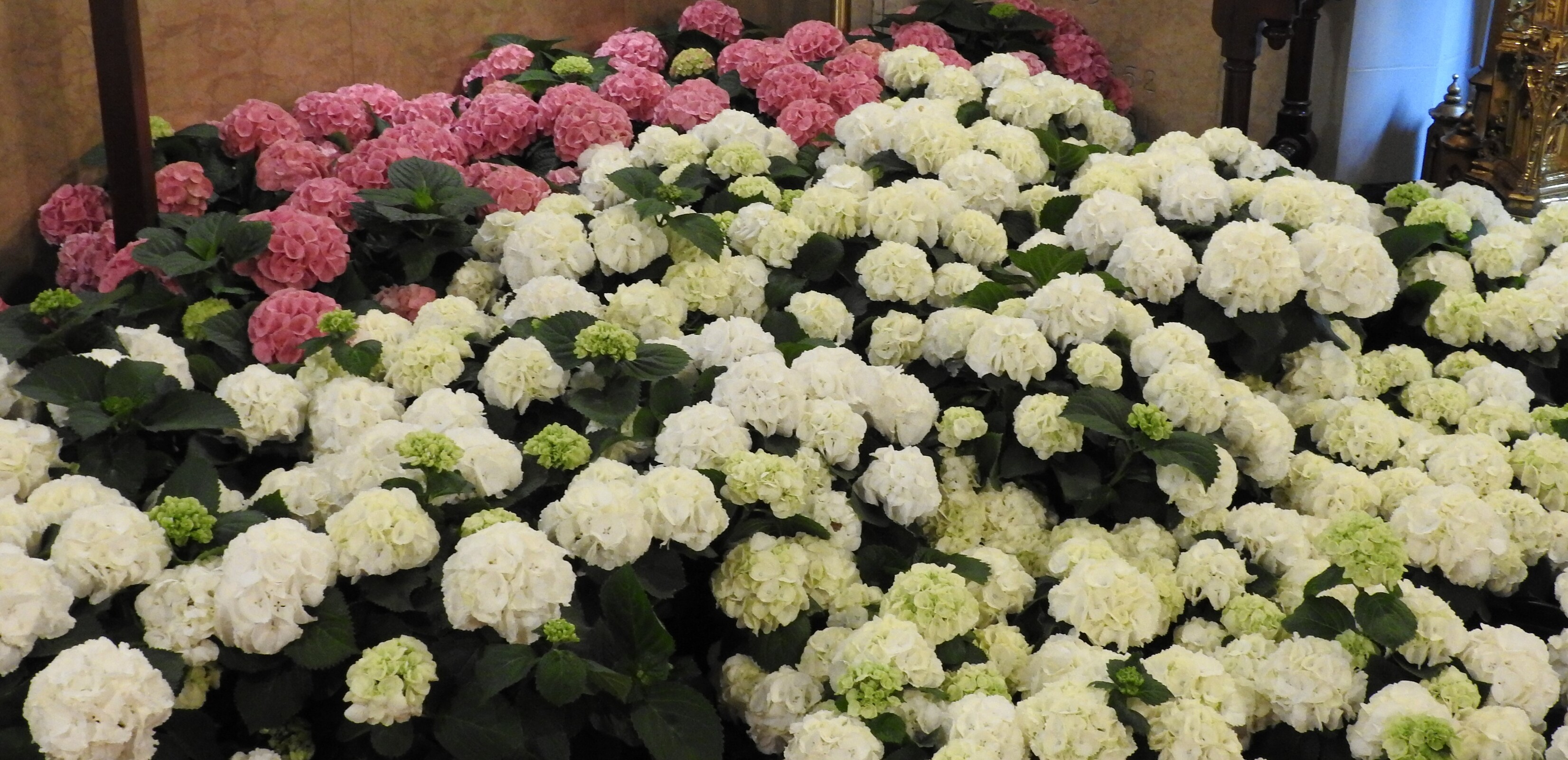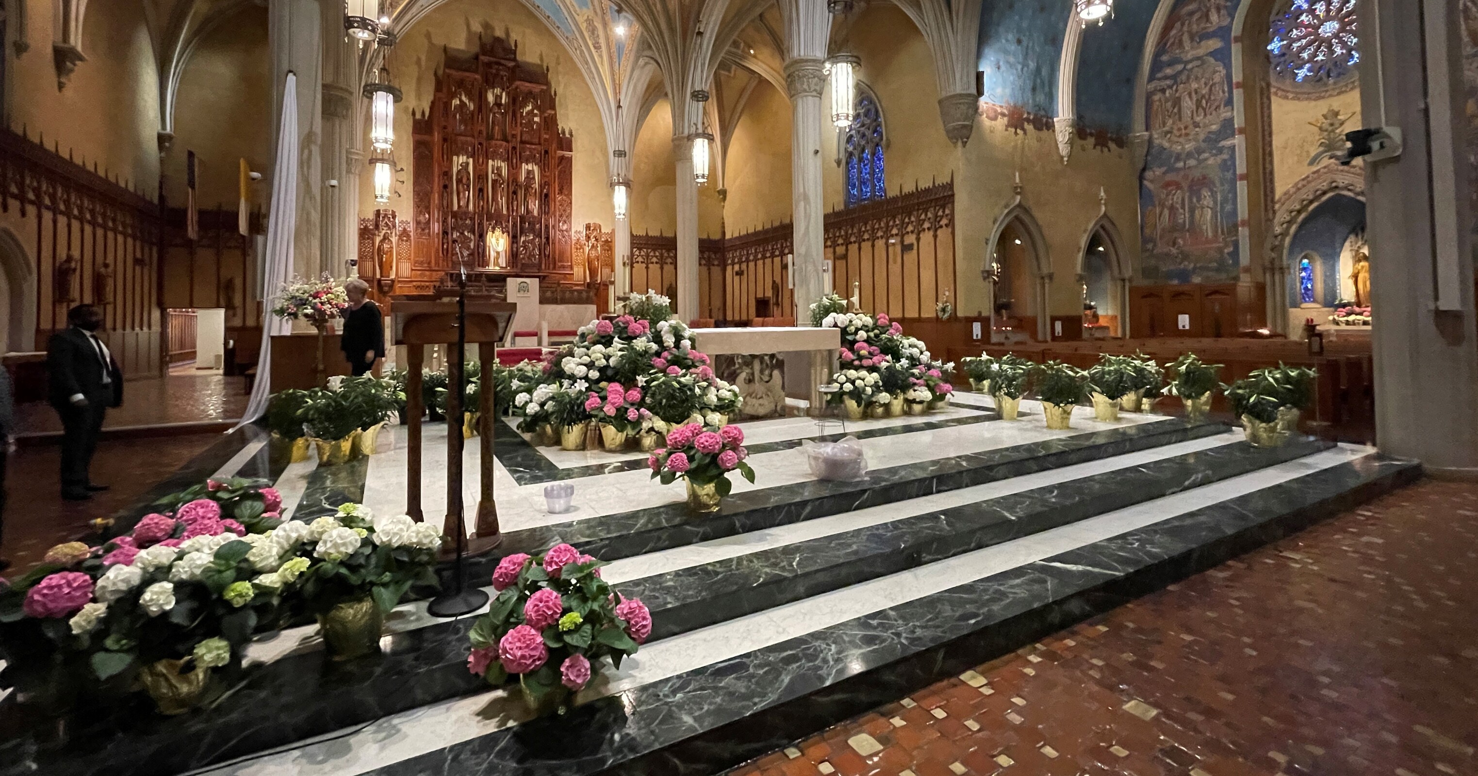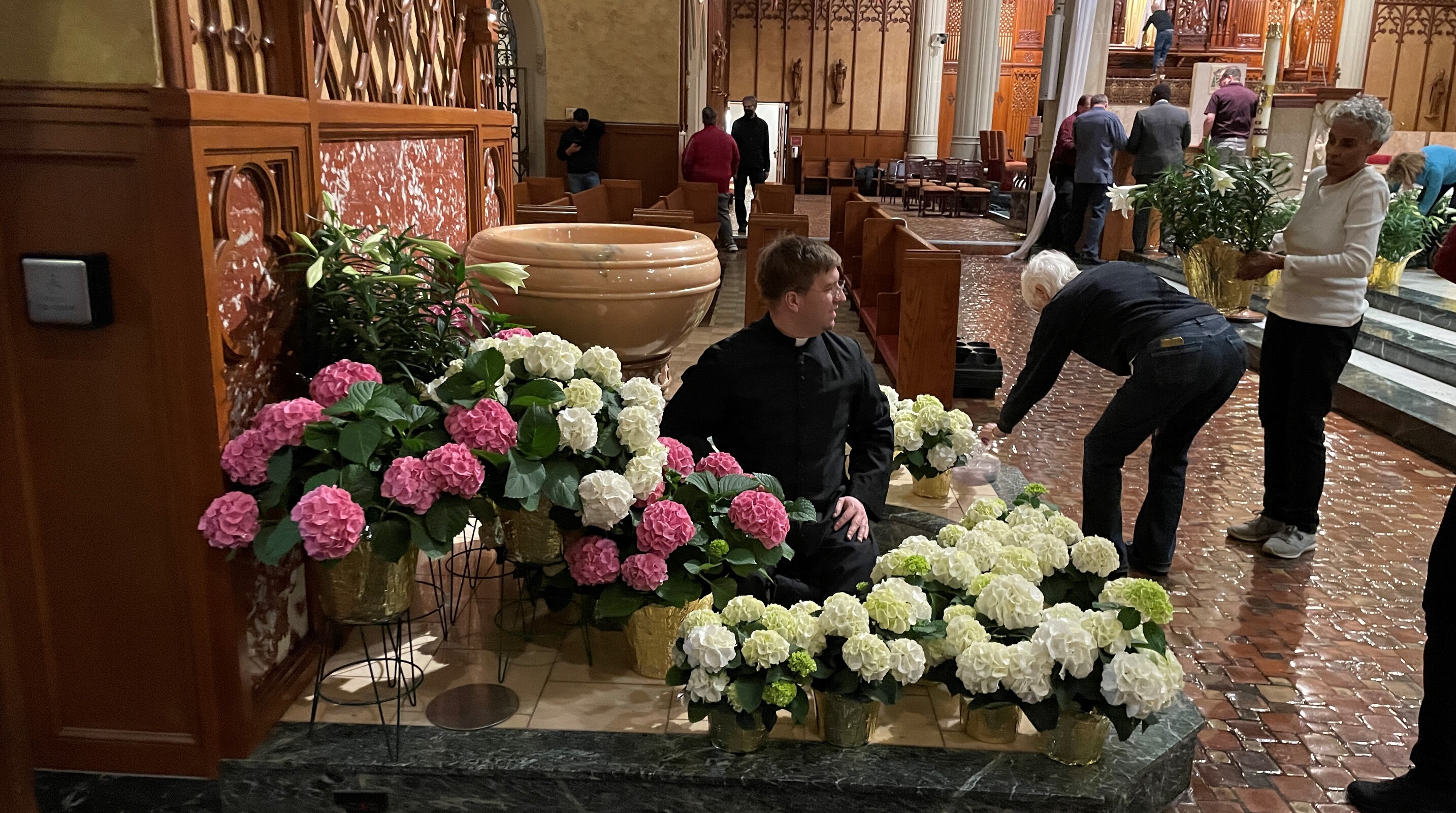 About a dozen people, including Father Sean Ralph, cathedral rector, brought the fresh flowers from their storage sites in the cathedral, placed them in decorative foil sleeves, added a plastic tray to collect water and then carefully placed them by size, type and color on the floor or on plant stands on both sides of the altar, next to the baptismal font and in other strategic areas.