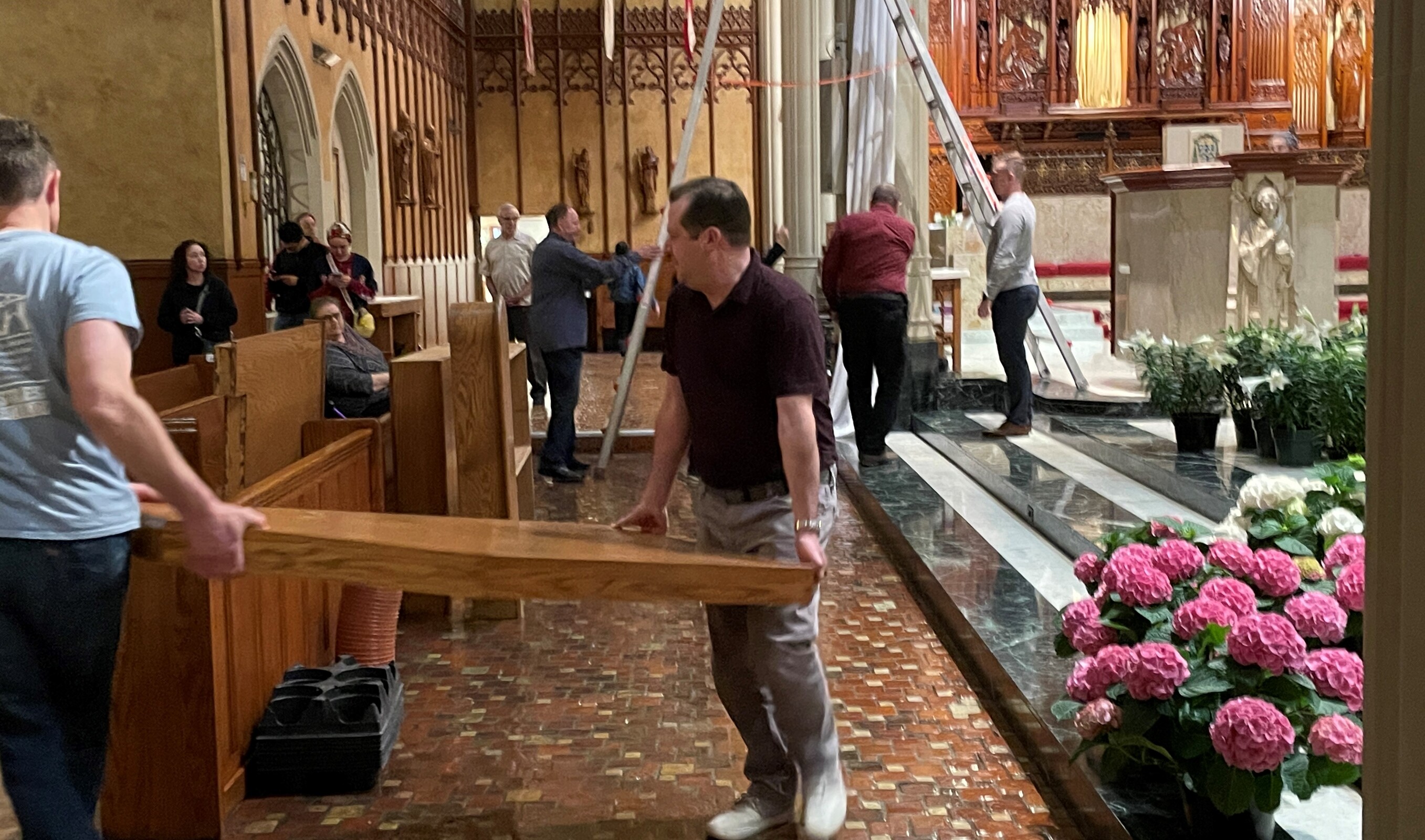 Volunteers went into the cathedral basement and carried up several large wooden pieces that were assembled adjacent to the ambo to form a structure for other plants and to reach the paschal candle.