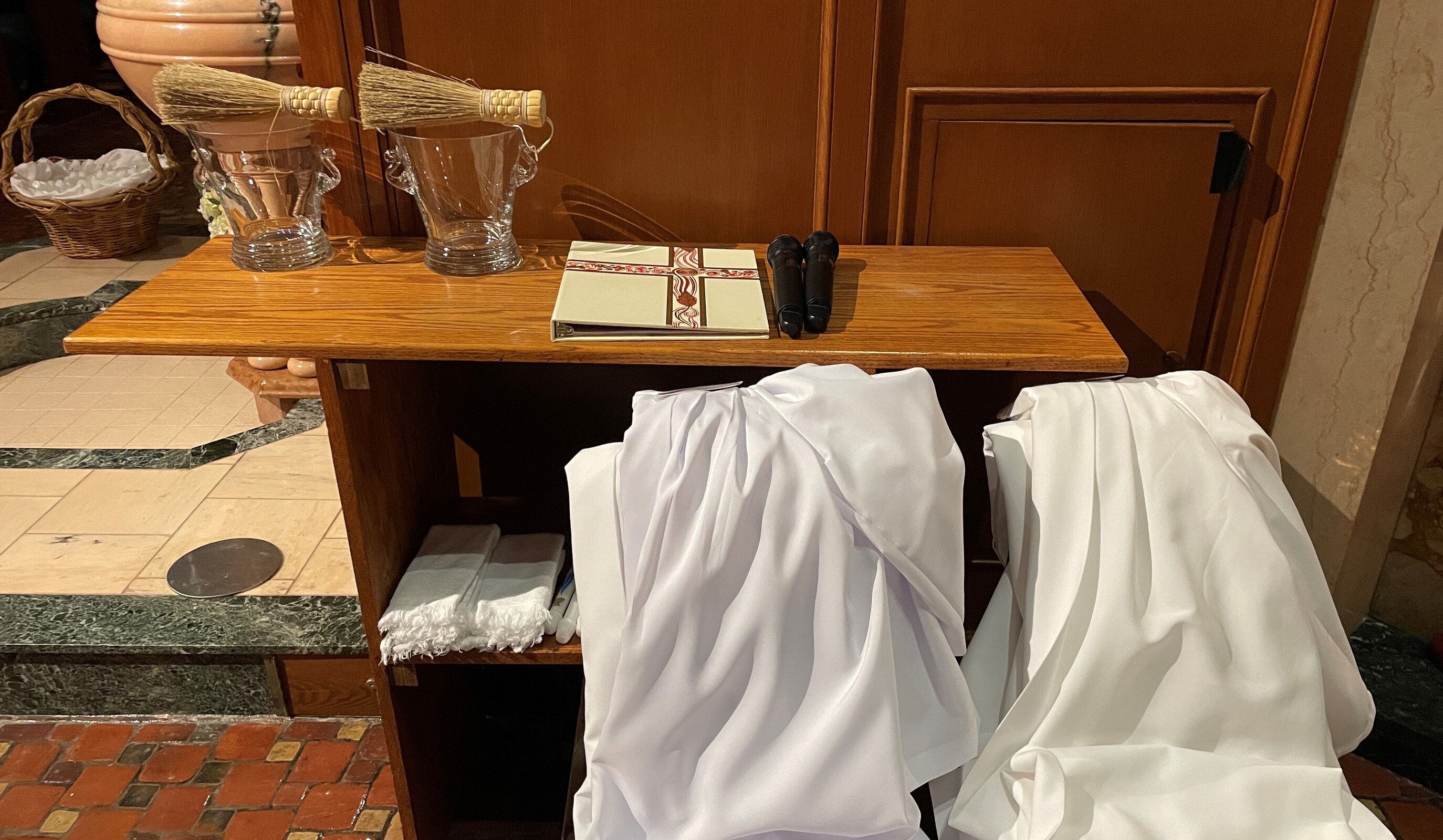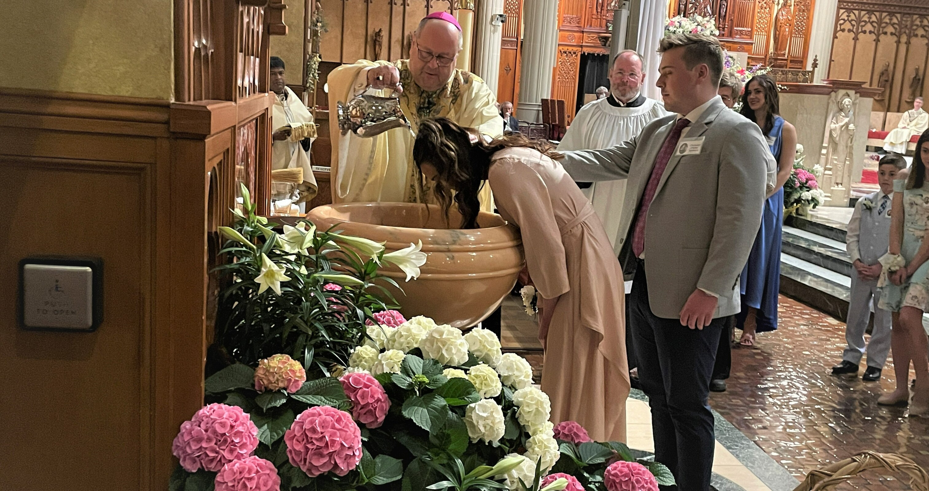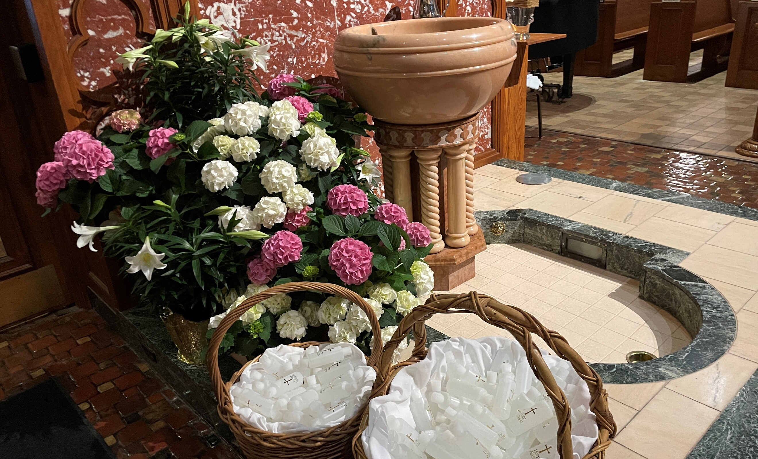 After the Gospel, those to be baptized were called to the front of the congregation and presented for the sacrament. They professed their faith and each was baptized by the bishop, received a white garment and a candle. They shared the light from that candle with their family, friends and others in the church. The rest of the congregation renewed their baptismal promises and the bishop and deacon passed through the cathedral sprinkling the faithful with holy water.