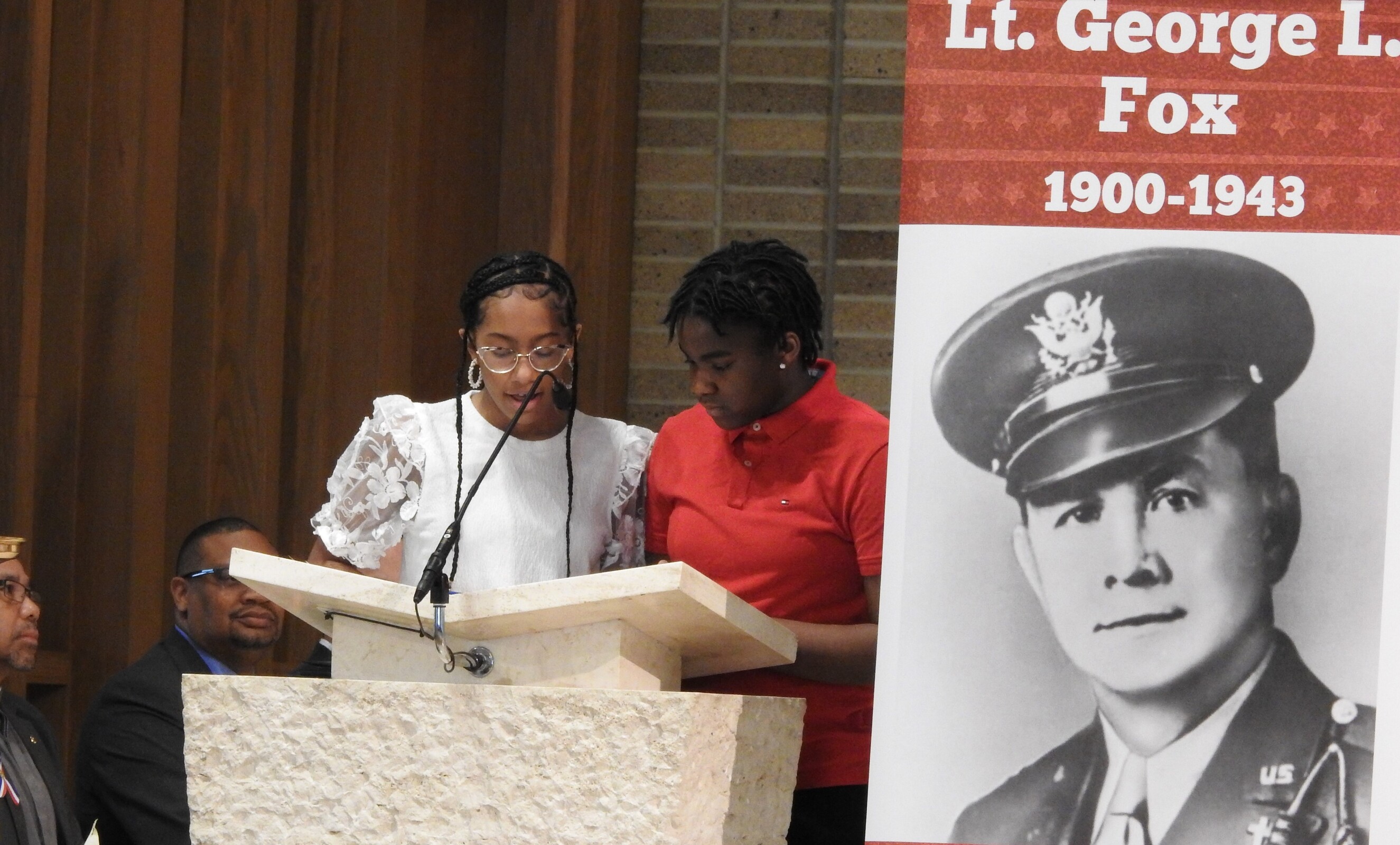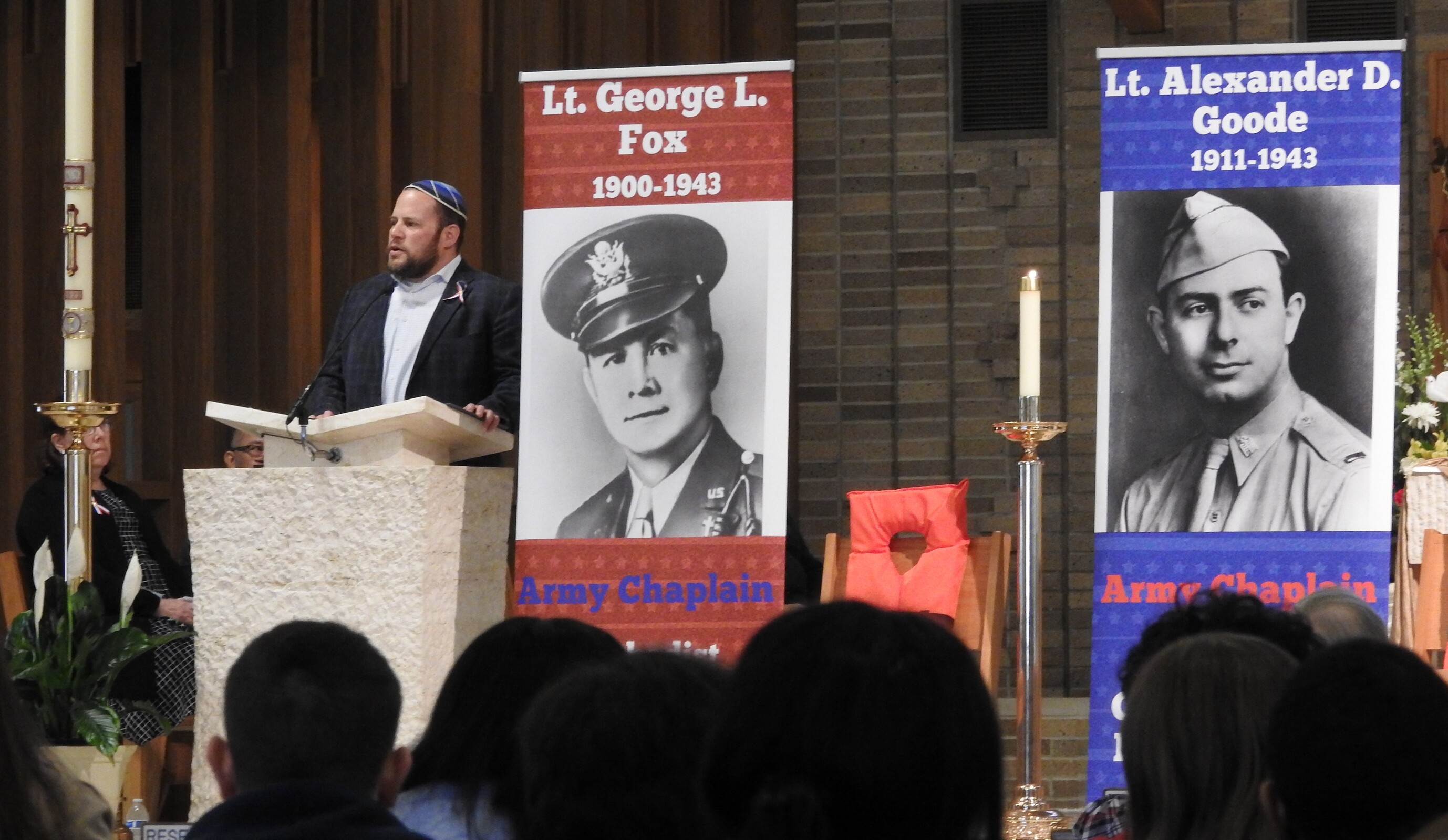 Individual tributes were paid to each chaplain during the ceremony. The Rev. Armando Arellano of East Shore United Methodist Church spoke about Lt. Fox. Rabbi Scott Roland of Congregation Shaarey Tikvah told Lt. Goode’s story and the Rev. Brian Moore of Lake Shore Christian Church talked about Lt. Washington, while student Frankie Oriani told Lt. Poling’s story.