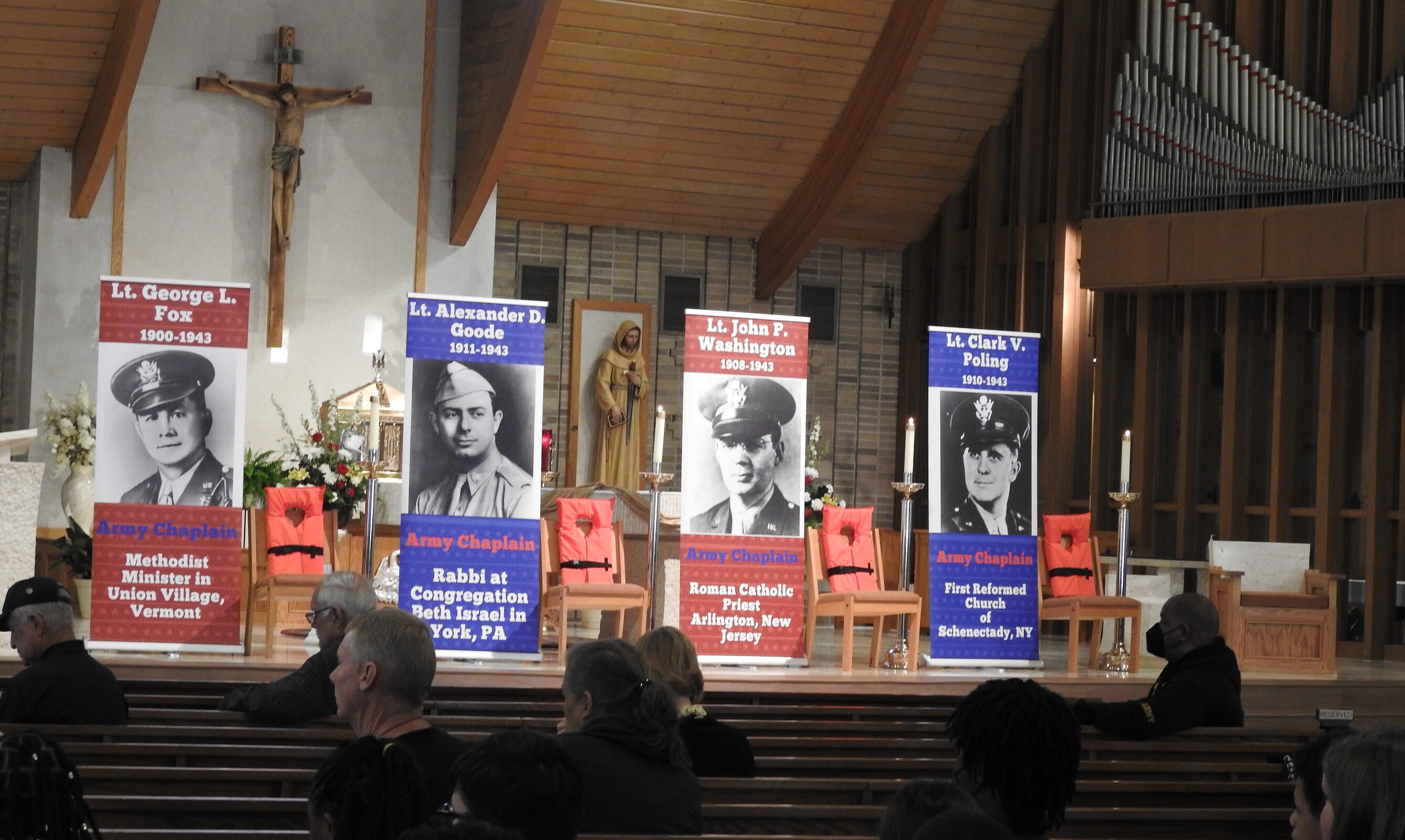 The ceremony took place in the church. Four large banners, each bearing the name, photo and religious affiliation of a chaplain, were displayed in front of the church. Next to each banner was a chair with a life jacket, a somber reminder of the sacrifice made by the chaplains.