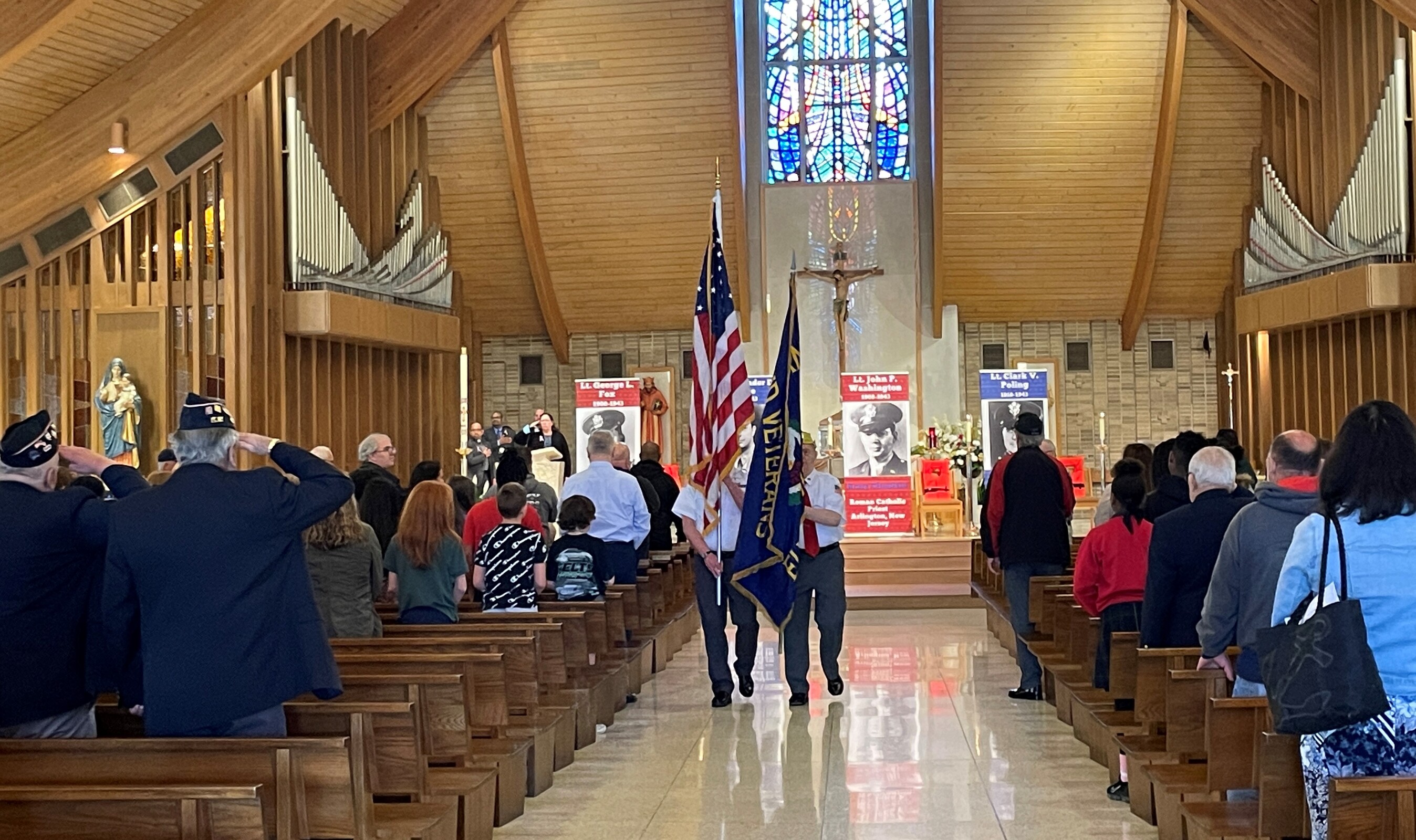 Retired Col. Cheryl Ludwa directed the posting and retirement of the colors, after which SS. Robert & William students sang and signed – using American Sign Language – the national anthem. Ludwa also gave an introduction to the Four Chaplains.