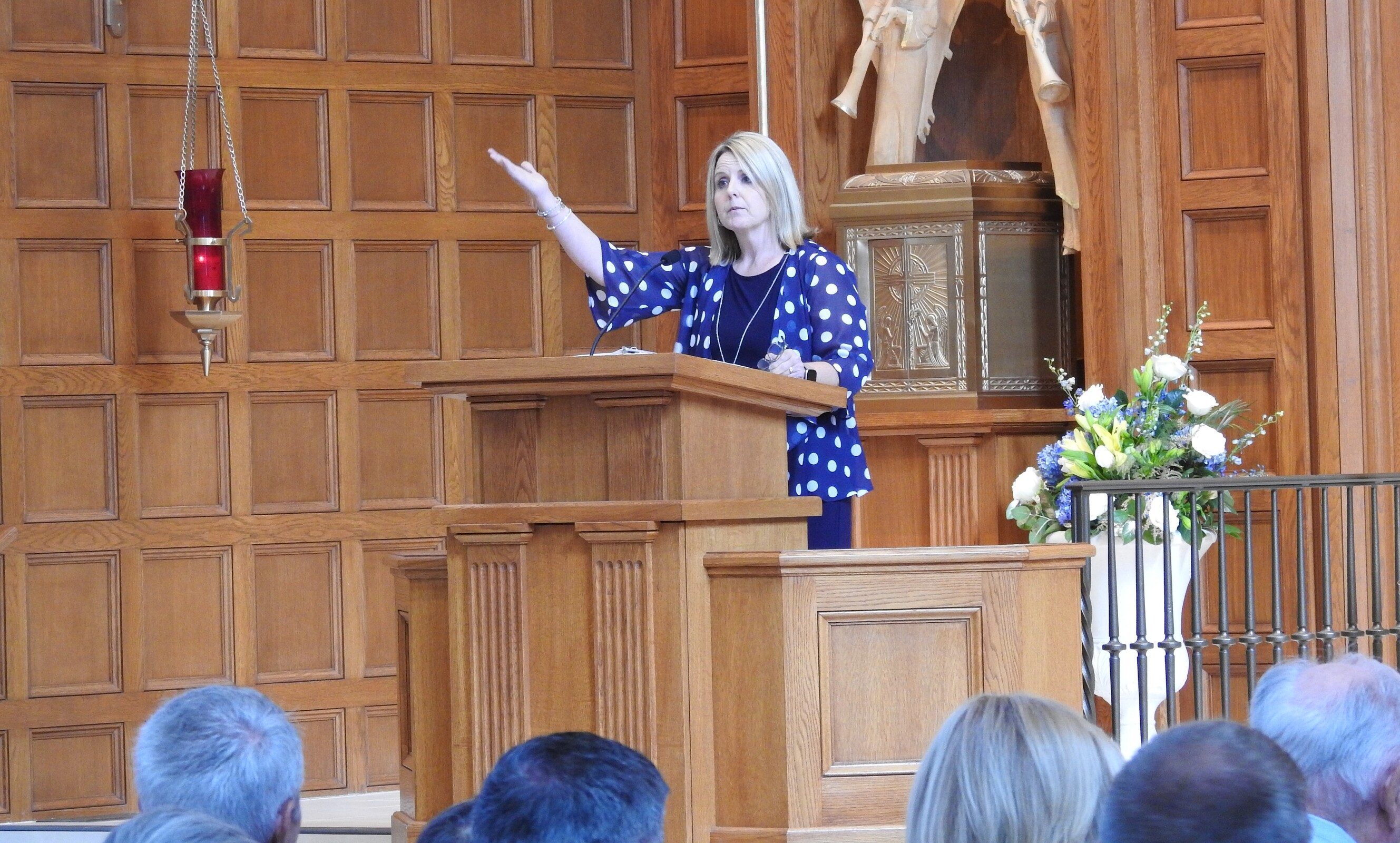 In 2008, the church was renovated and a baptismal font for immersion was added near the altar. A statue of the Holy Family was added, the tabernacle was moved to a more prominent location, the sanctuary was made handicap accessible, stained-glass windows were added to the gathering area and prayer room and other improvements were made to the parish physical plant.
