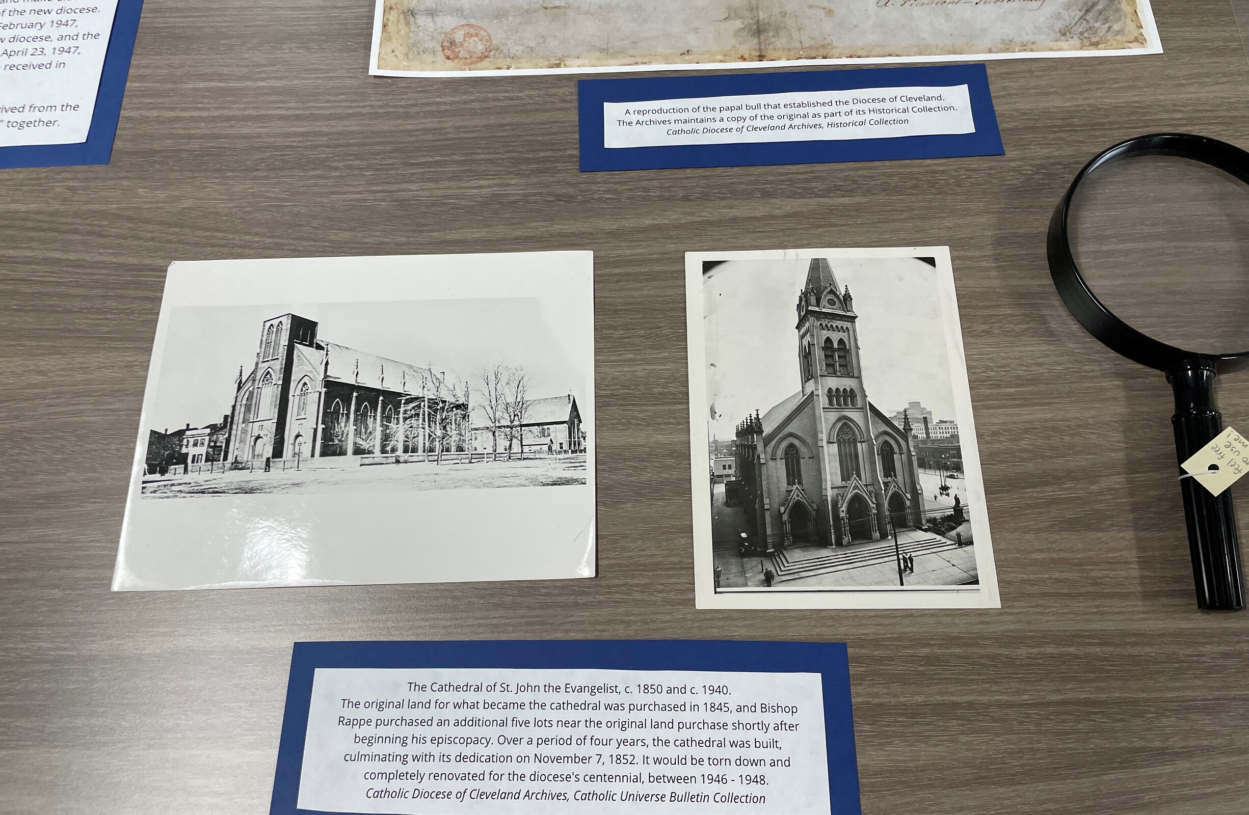 Father Yanus invited the group to visit a display assembled by Emily Ahlin, diocesan archivist, showcasing some artifacts and events from the 175-year history of the Cleveland Diocese.