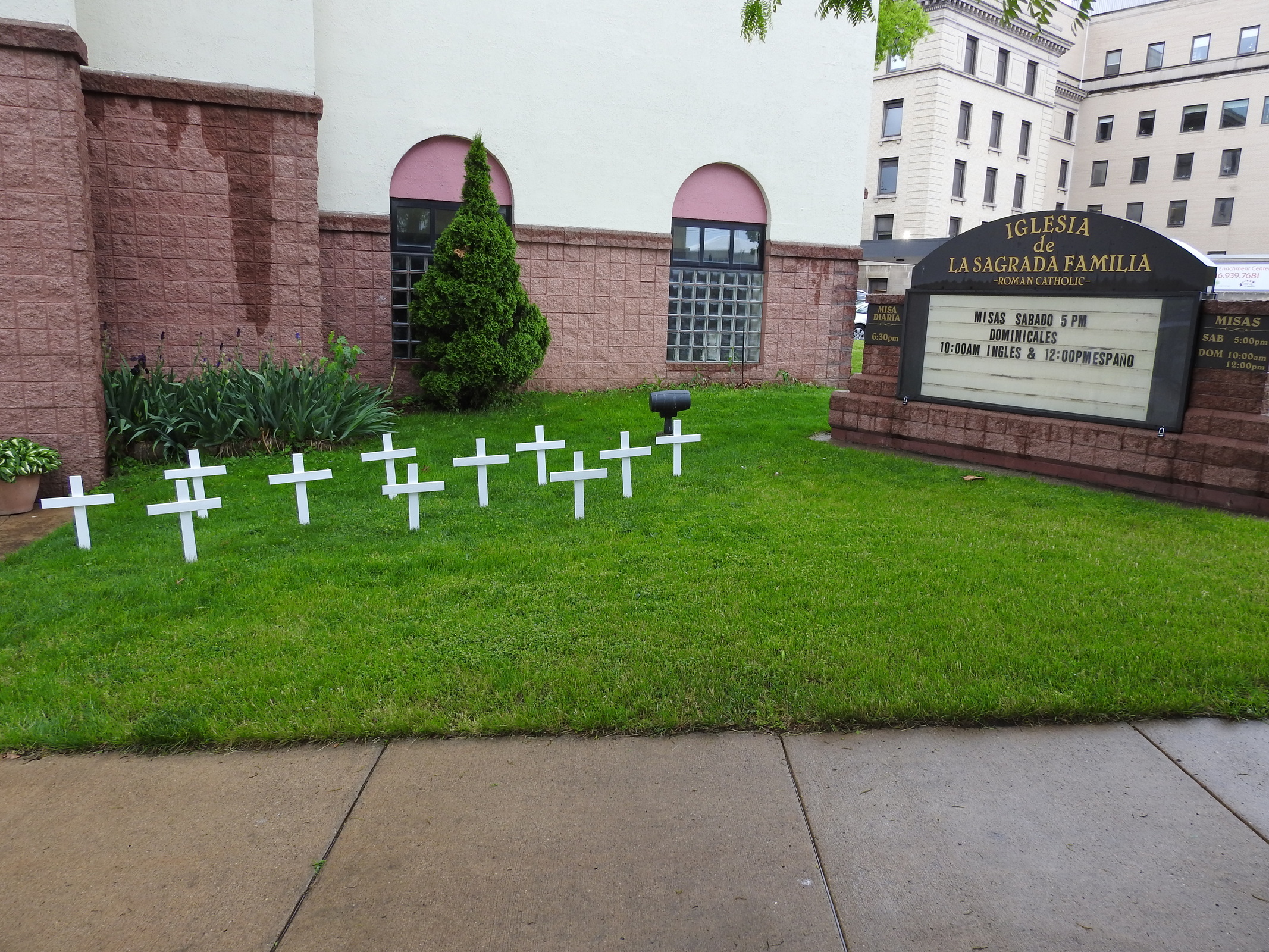 Twenty-two small white crosses – one for each victim – were placed on the lawn in front of the church. Father Francisco “Paco” Honorato Garnica, CSJ, pastor, said the crosses were donated by the Knights of Columbus. Some Knights attended the prayer service, which was livestreamed on the parish Facebook page. The group gathered in front of the church near a large cross draped in white with a sign bearing the school’s name and address.