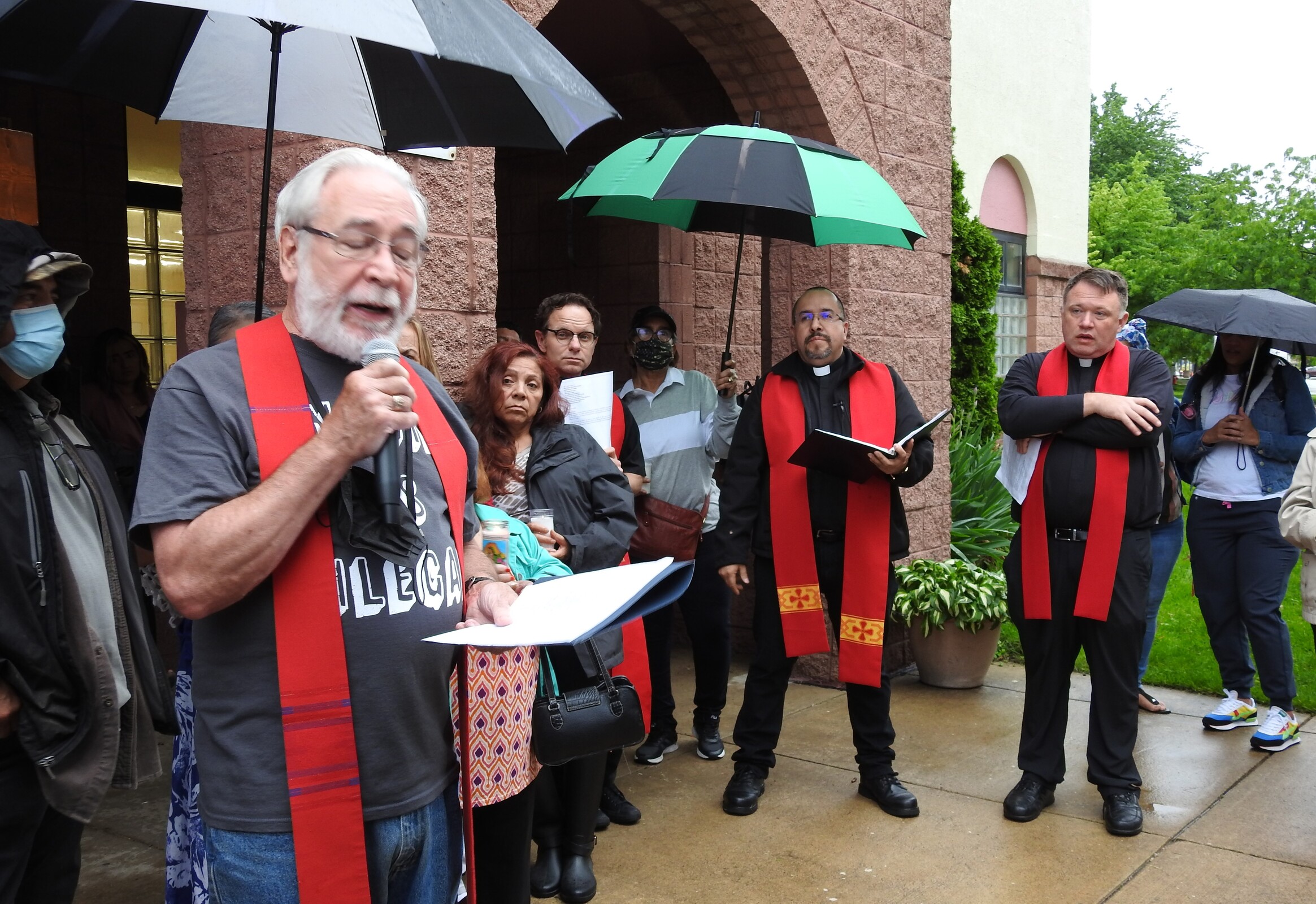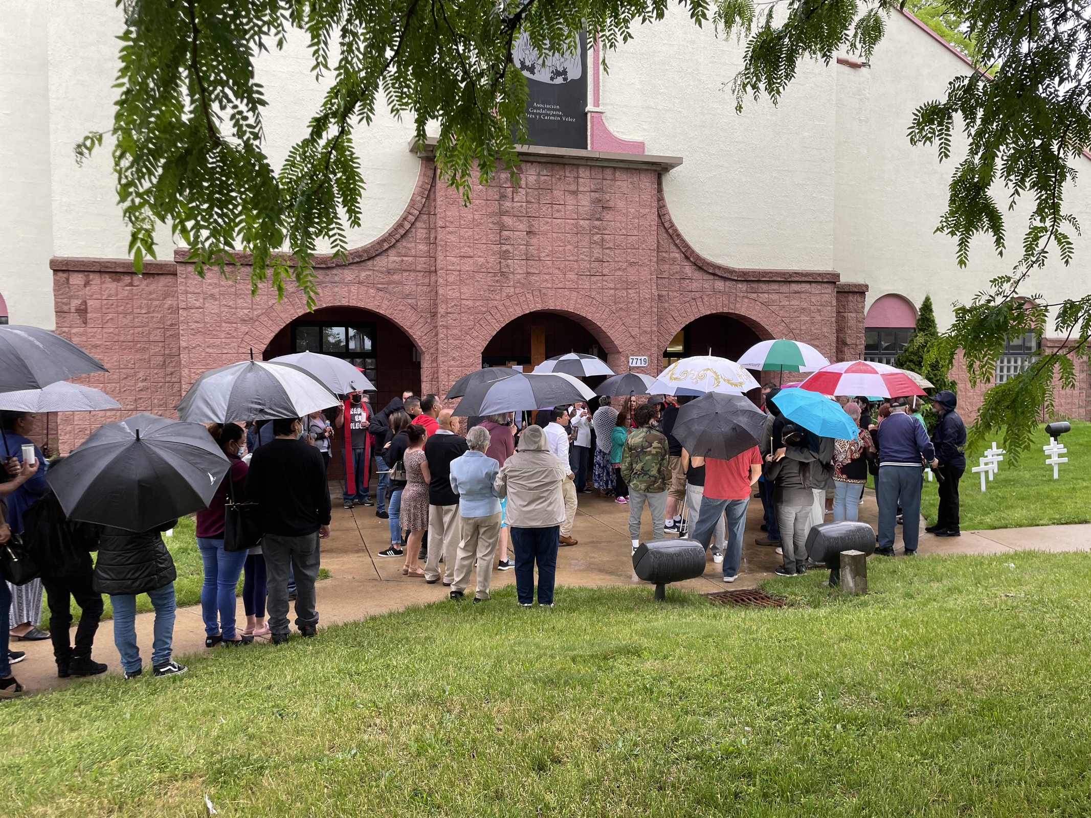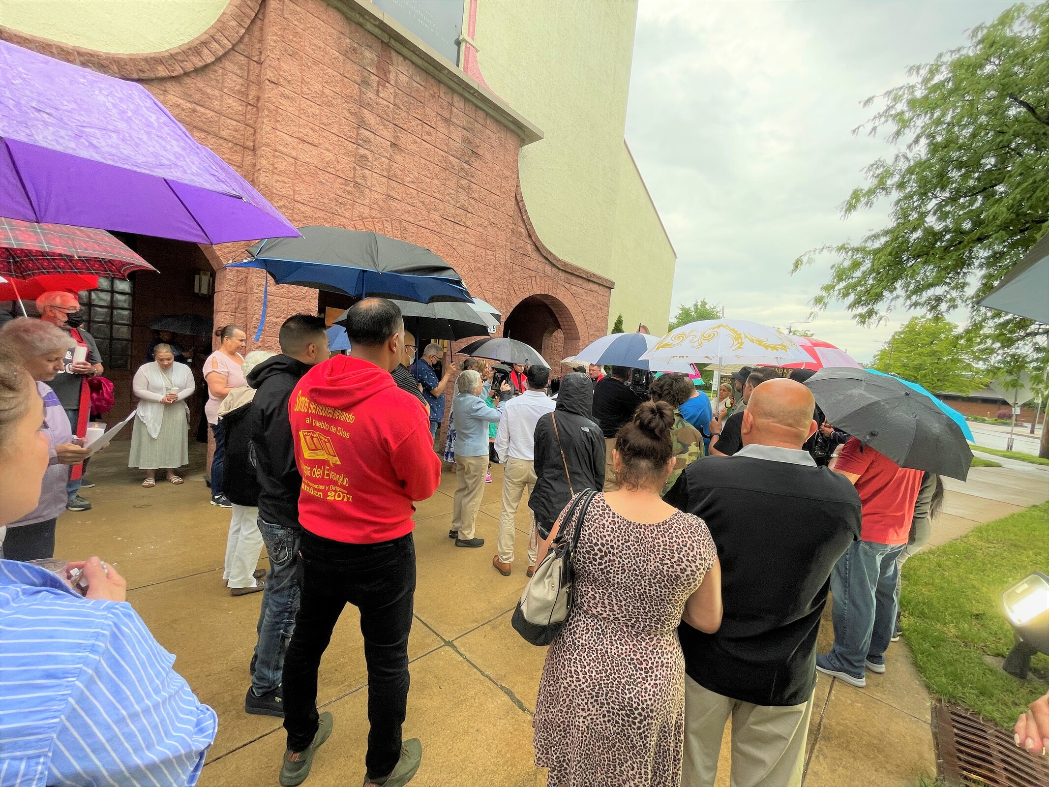 A light rain was falling as the service began and attendees clustered under umbrellas. Many carried candles.