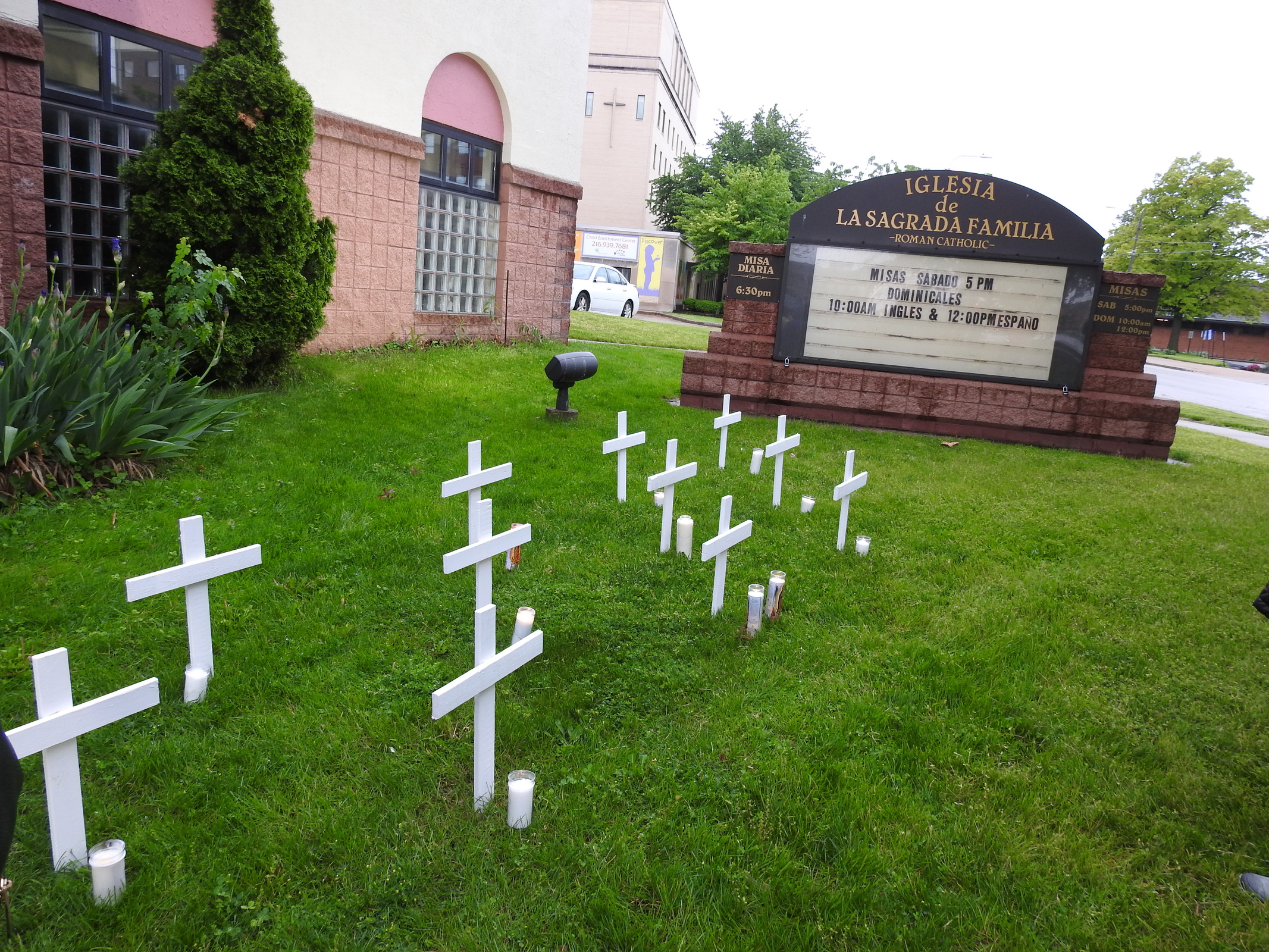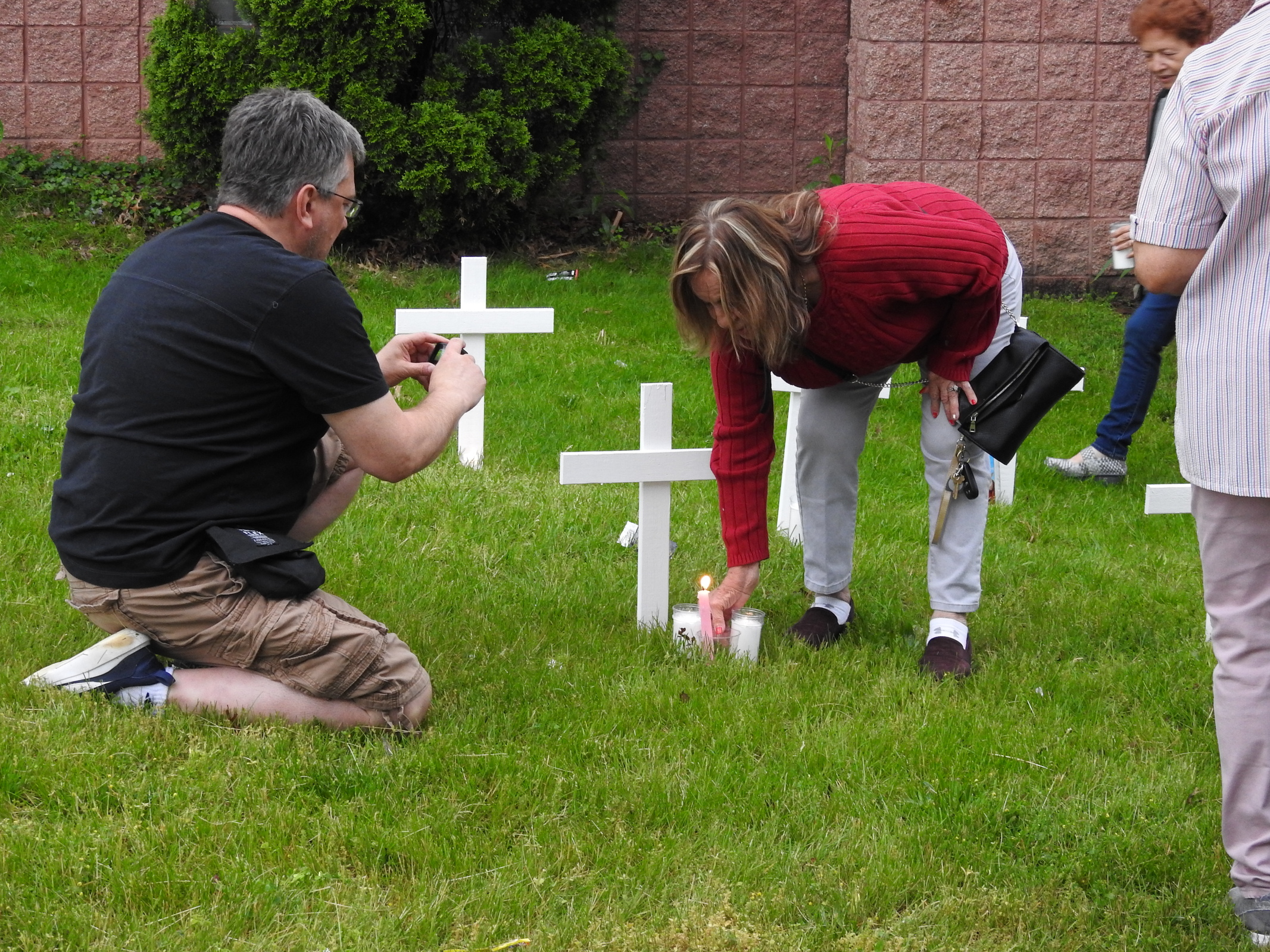After the prayer service, some of the attendees placed their candles next to a cross.