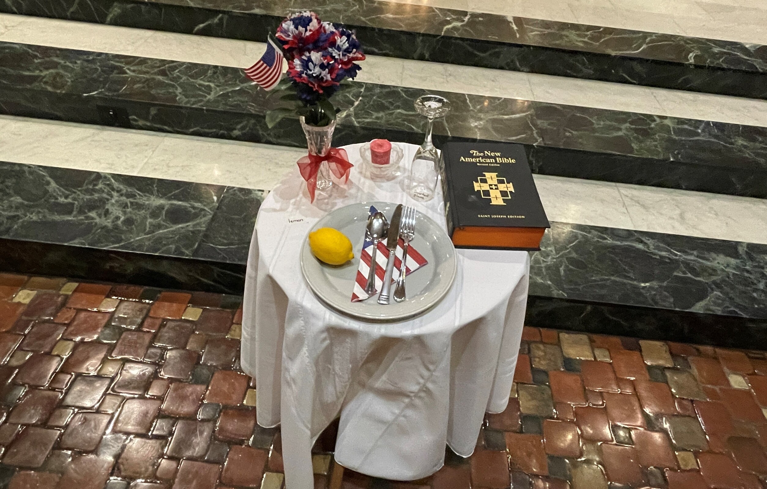 Sgt. First Class Ryan Acker and seventh-graders set the POW/MIA table, a poignant ceremony in honor and remembrance of all prisoners of war and those who are missing in action. The symbolism of the table was explained as they set a small table with a white tablecloth and added a single candle, a Bible, an inverted glass, a vase of flowers, a plate with a lemon and some salt. A chair was draped with a POW cover.