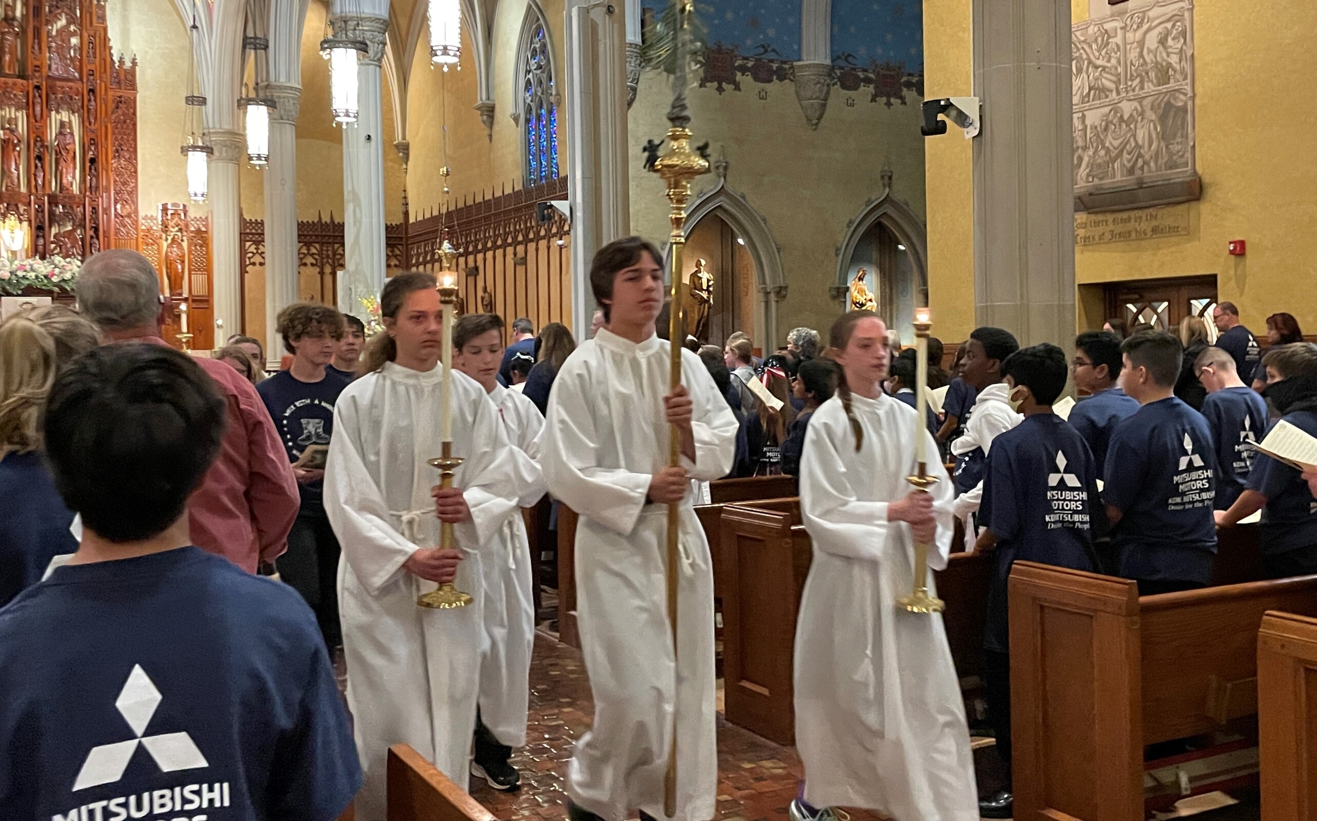 After Mass, the bishop greeted the students as they lined up, small American flags in hand, for an approximately three-mile walk around downtown Cleveland. The Cleveland Browns welcomed the group to FirstEnergy Stadium for lunch after the walk.