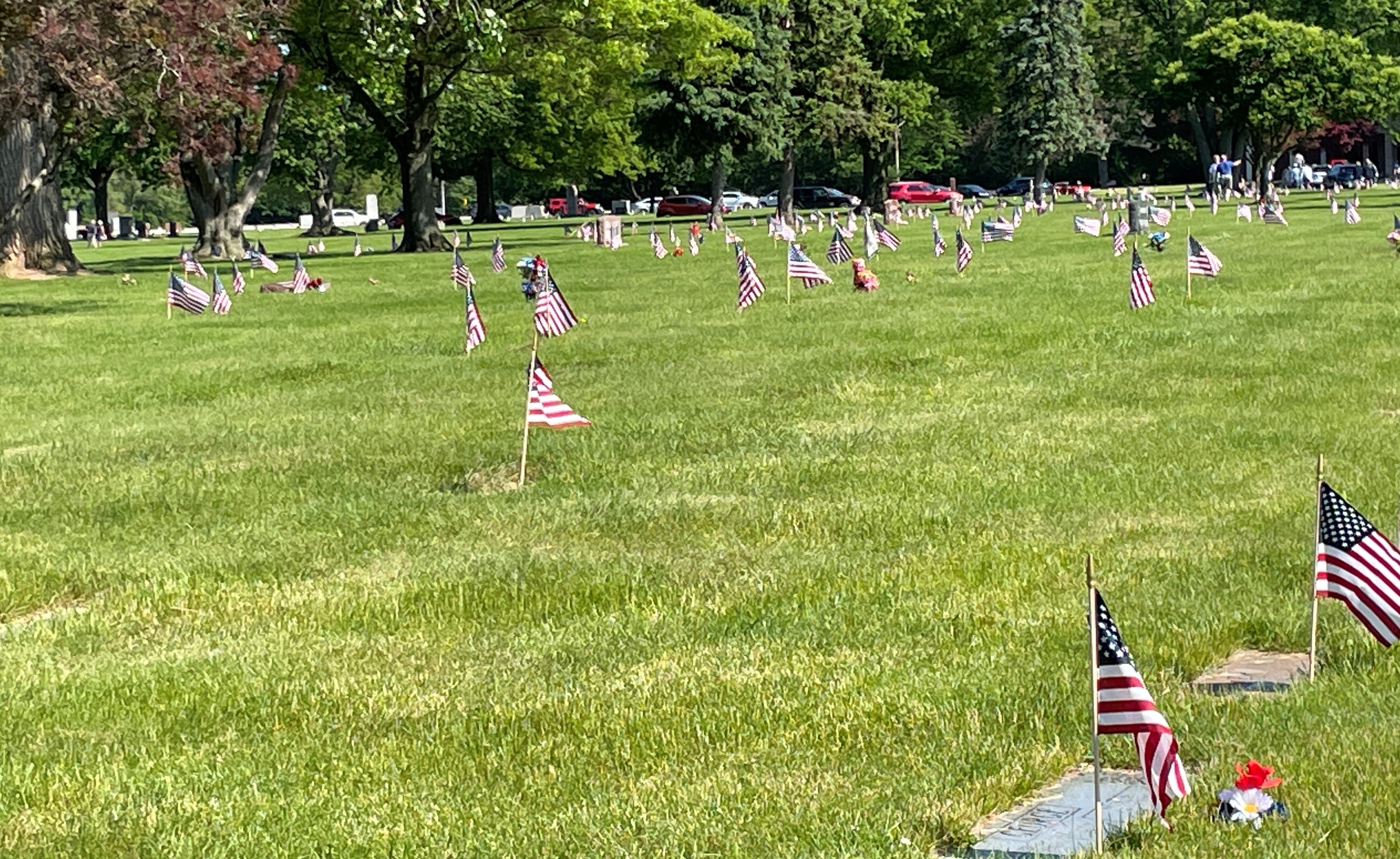 In preparation for Memorial Day, graves of veterans in the Catholic cemeteries were decorated with small flags by volunteers and Catholic Cemeteries employees. Members and friends of Catholic War Veterans St. Vitus Post 1655 in Cleveland spent several hours May 27-28 placing flags on hundreds of graves at Calvary Cemetery in Cleveland and All Souls Cemetery in Chardon.