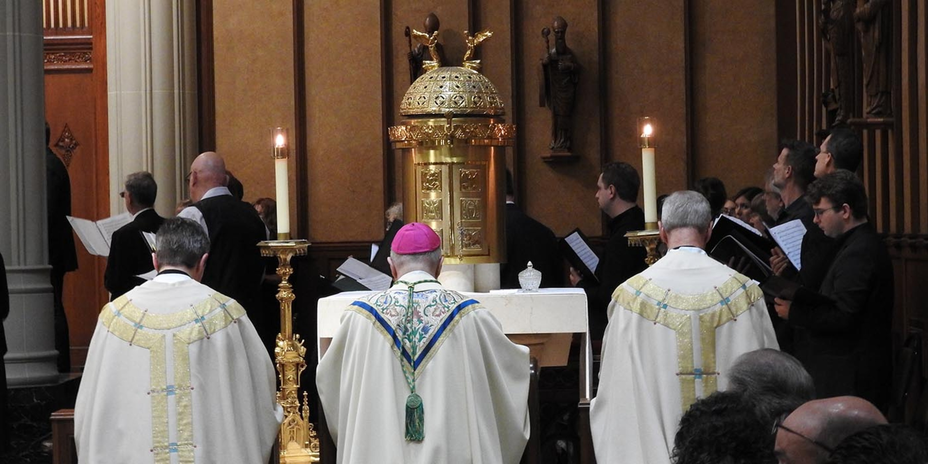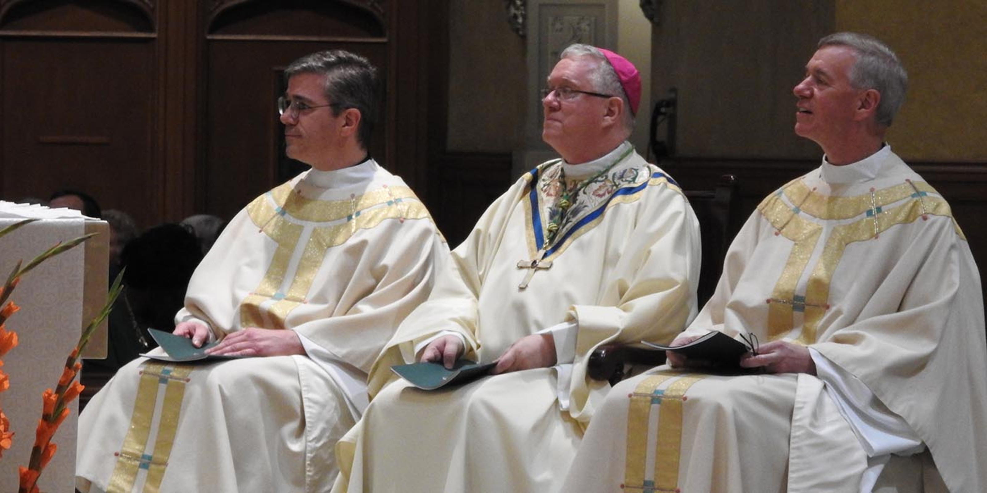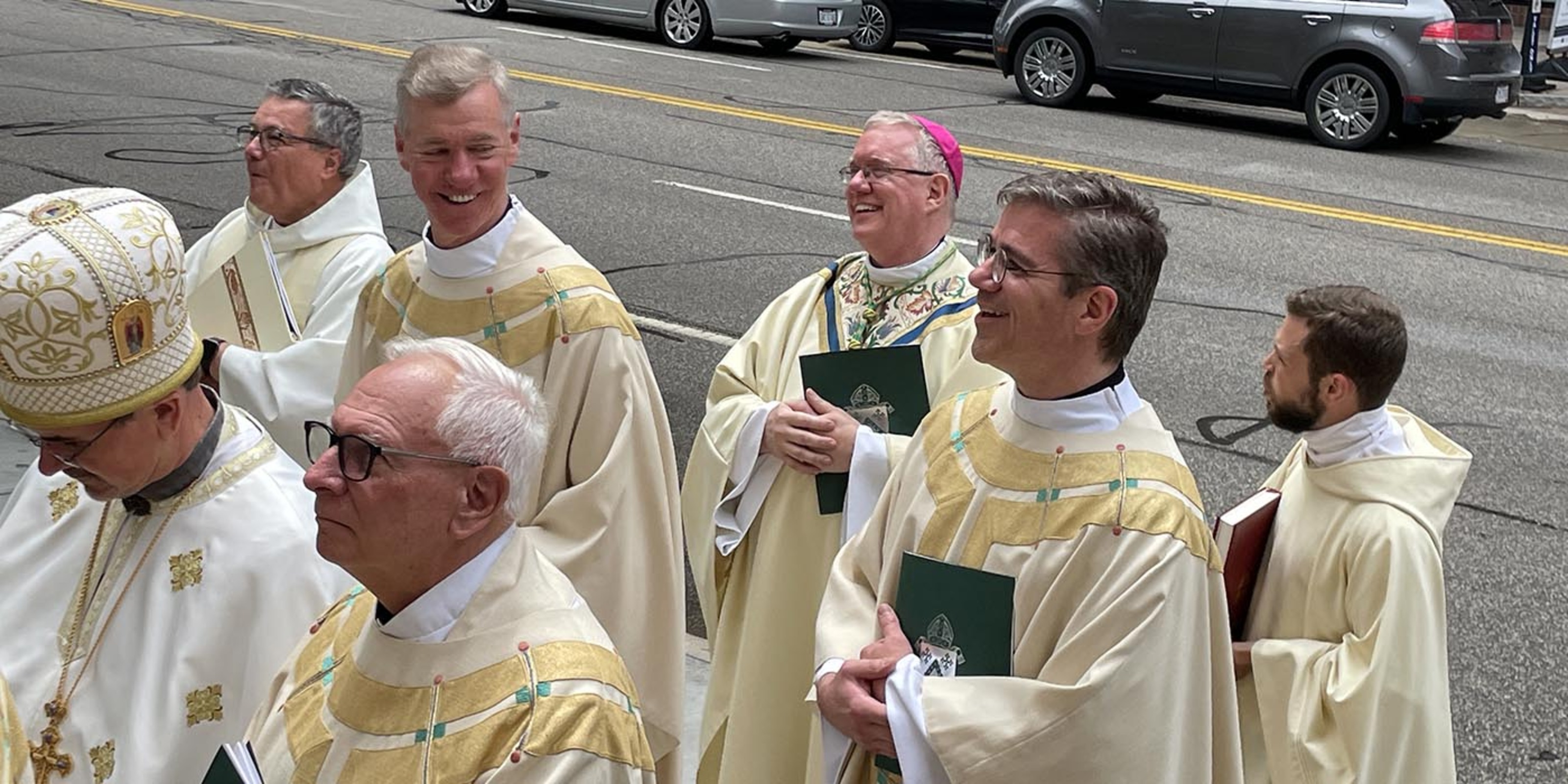 After members of the presbyterate and other invited guests filed into the cathedral, Bishop Woost and his two brothers who are diocesan priests entered the church. Father Dave Woost, pastor of Divine Word Parish in Kirtland, and Father Tom Woost, pastor of St. Brendan Parish in North Olmsted, accompanied their older brother to the tabernacle where they spent a few minutes in silent prayer. They joined members of the presbyteral council, visiting bishops and other clergy processing along Superior Avenue onto East Ninth Street, up the newly rebuilt front steps of the cathedral and into the church.
