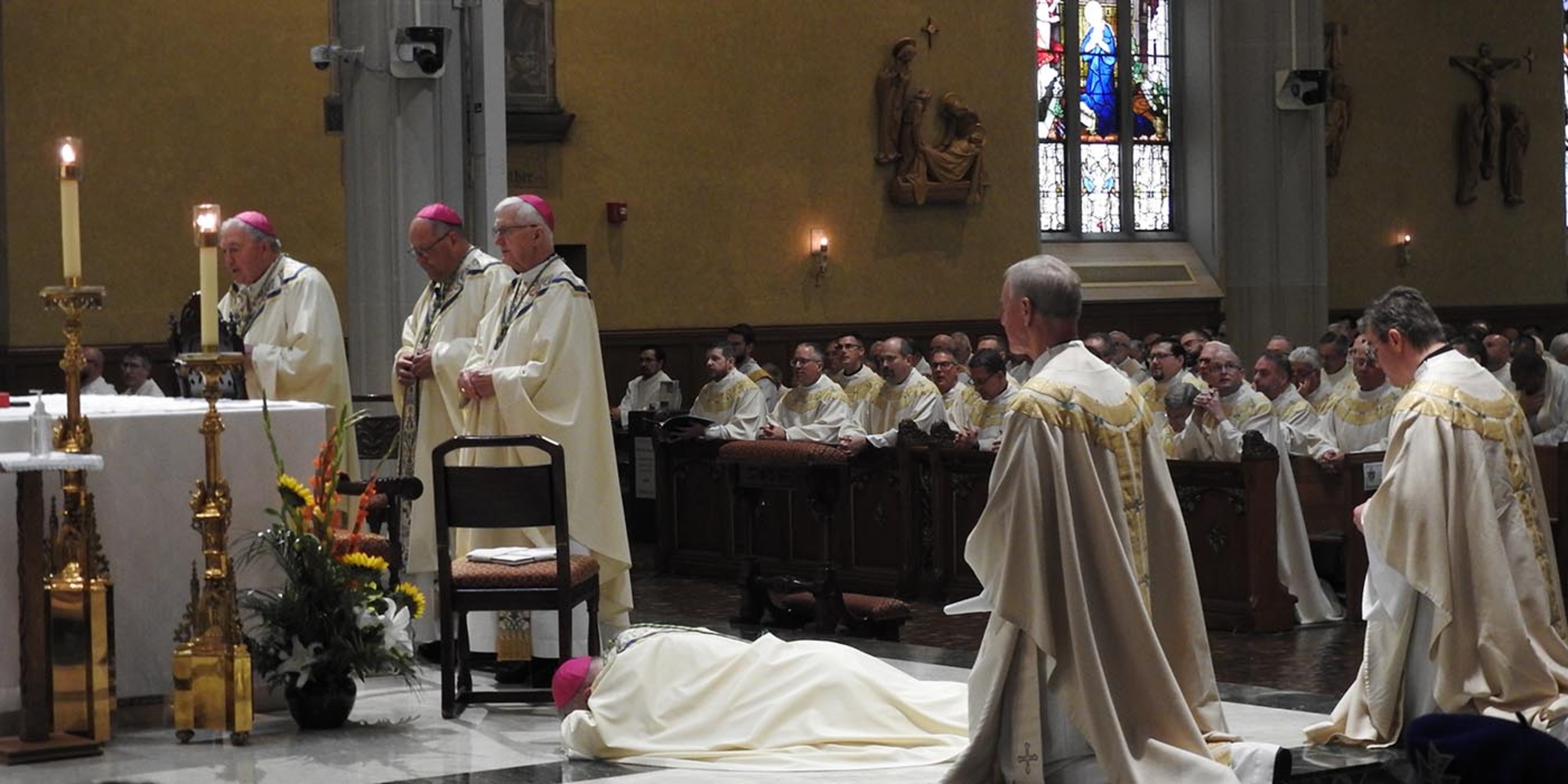 The ordination continued with the new bishop lying on the cathedral floor as the litany of supplication was sung. The laying-on of hands, the prayer of ordination, handing on the Book of Gospels, presentation of the insignia – the ring, miter and crosier – seating of the new bishop and the fraternal kiss concluded the rite.