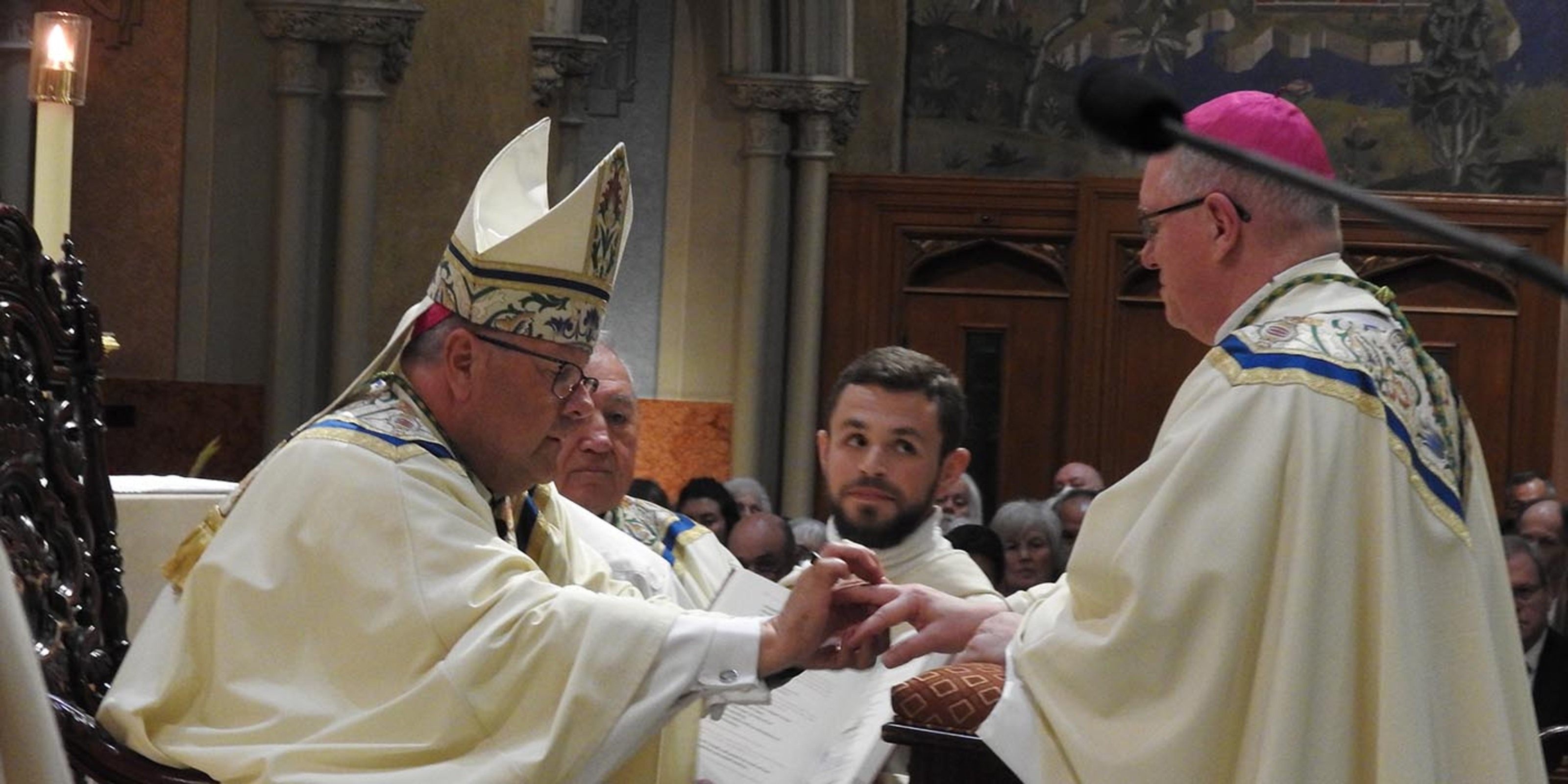 The rite of ordination took place after the Gospel. Father Don Oleksiak, diocesan vicar general, presented Bishop Woost and Msgr. Horgan read the apostolic mandate from Pope Francis announcing Bishop Woost’s appointment. The congregation responded, “Thanks be to God,” after which Bishop Woost, accompanied by his priest brothers, showed the mandate to Bishop Malesic and the other bishops before he walked around the cathedral displaying the document.