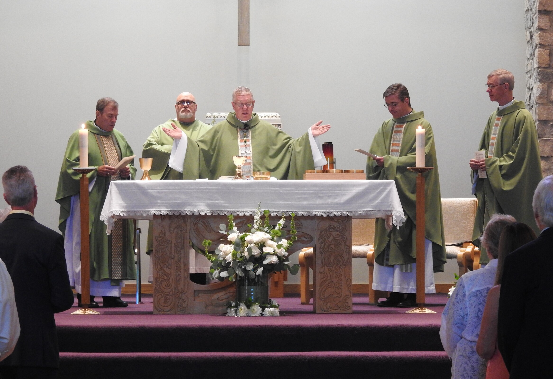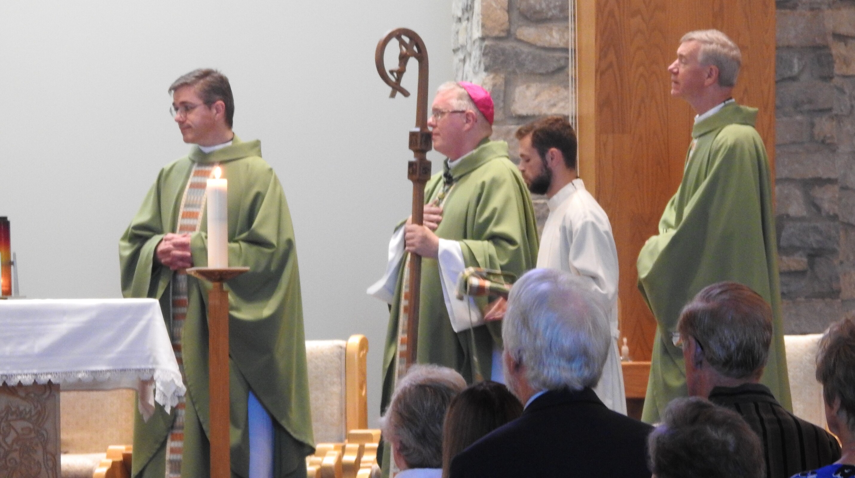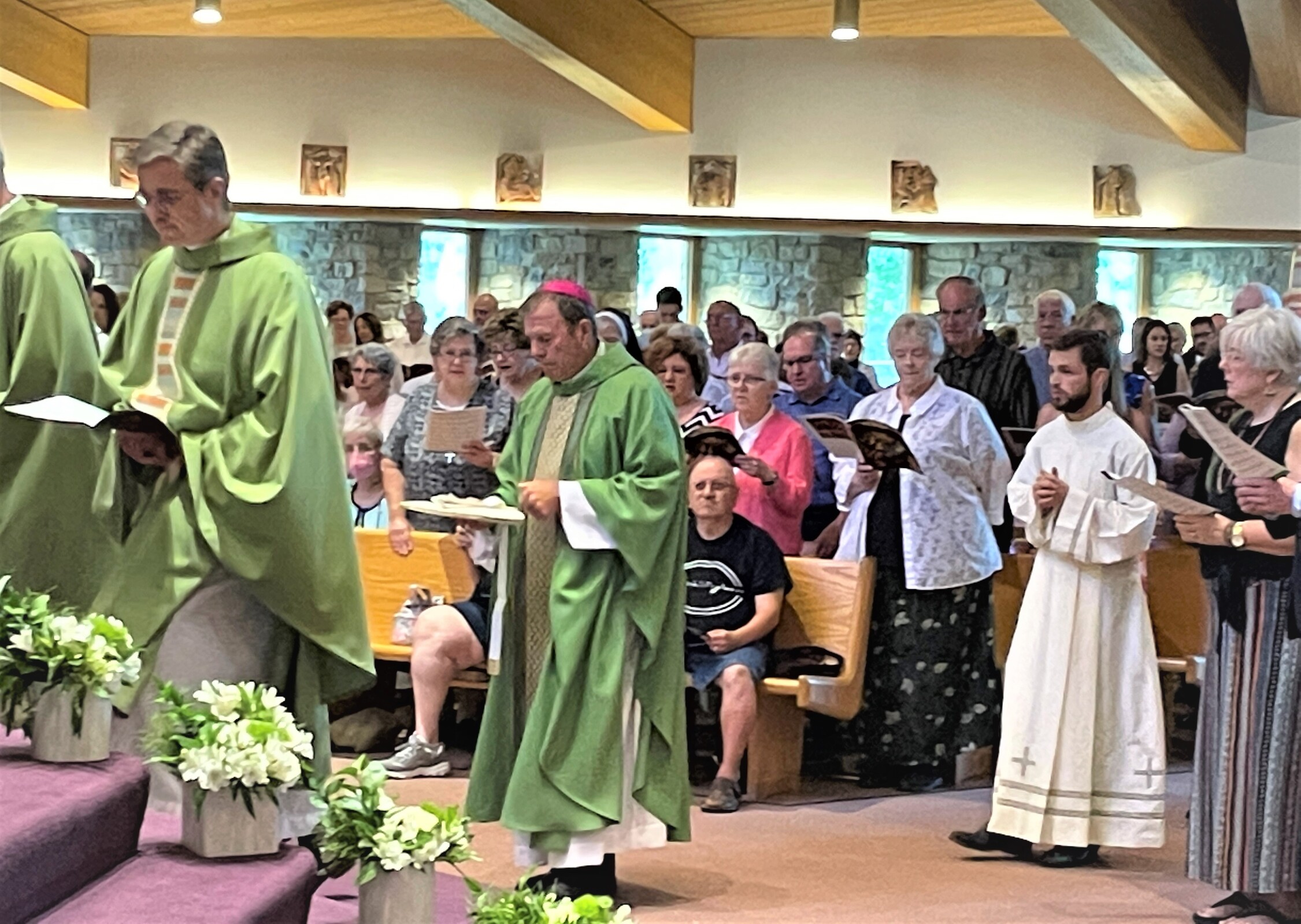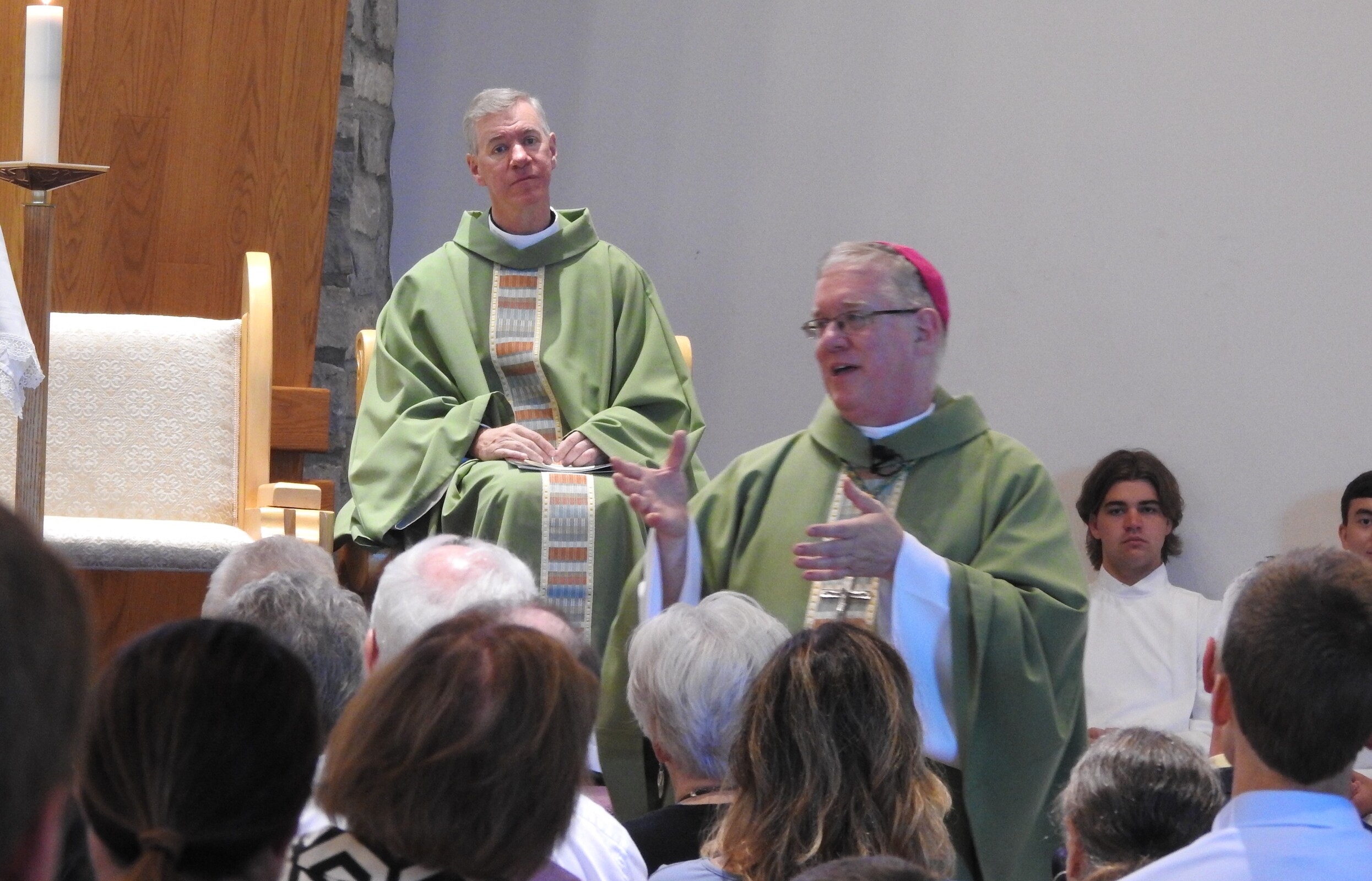 As he began his homily on Aug. 7, Bishop Woost explained to the congregation that he was walking gingerly because of what he called “a liturgical accident” the prior Sunday. He said he injured his knee while genuflecting.