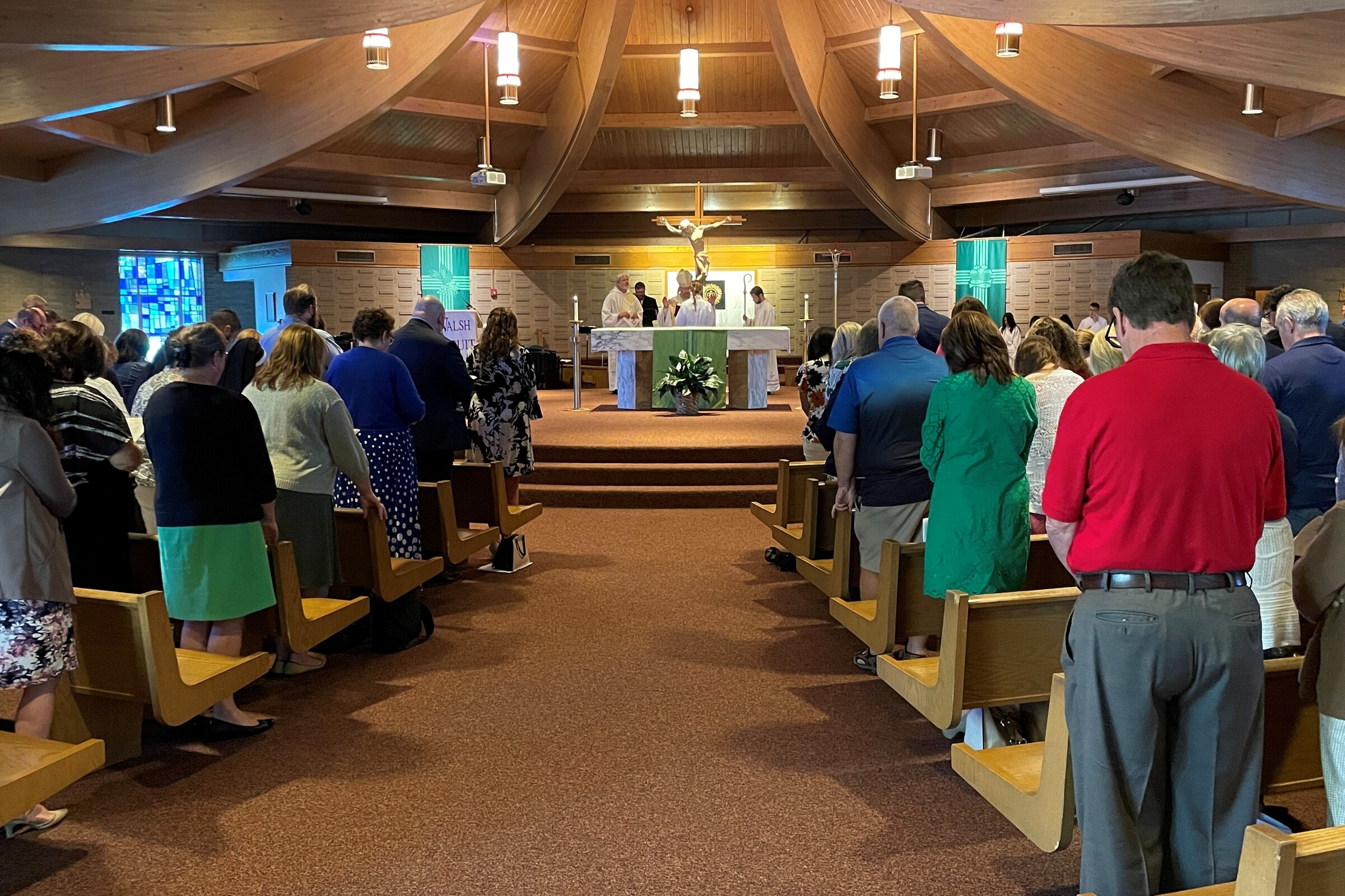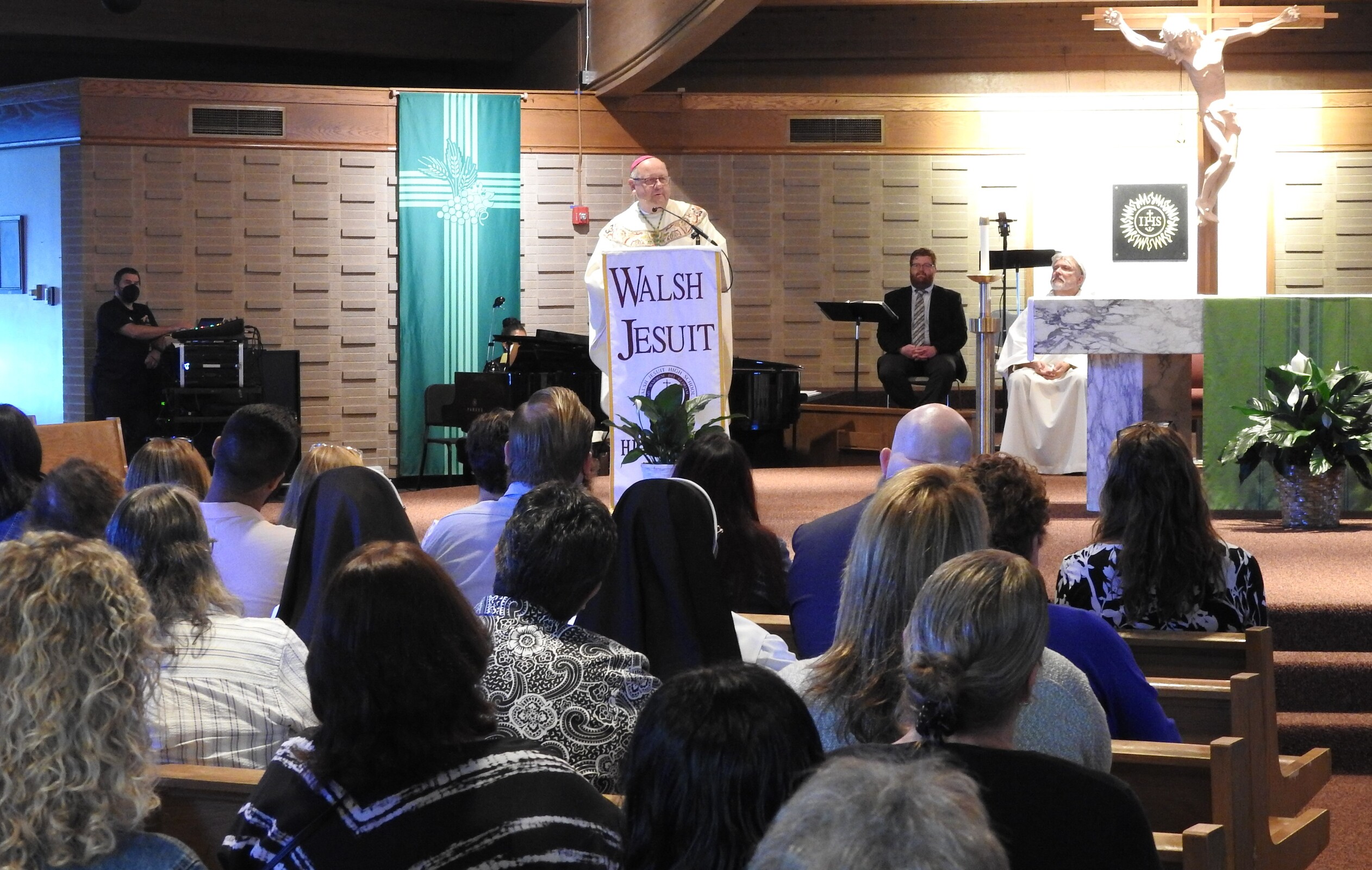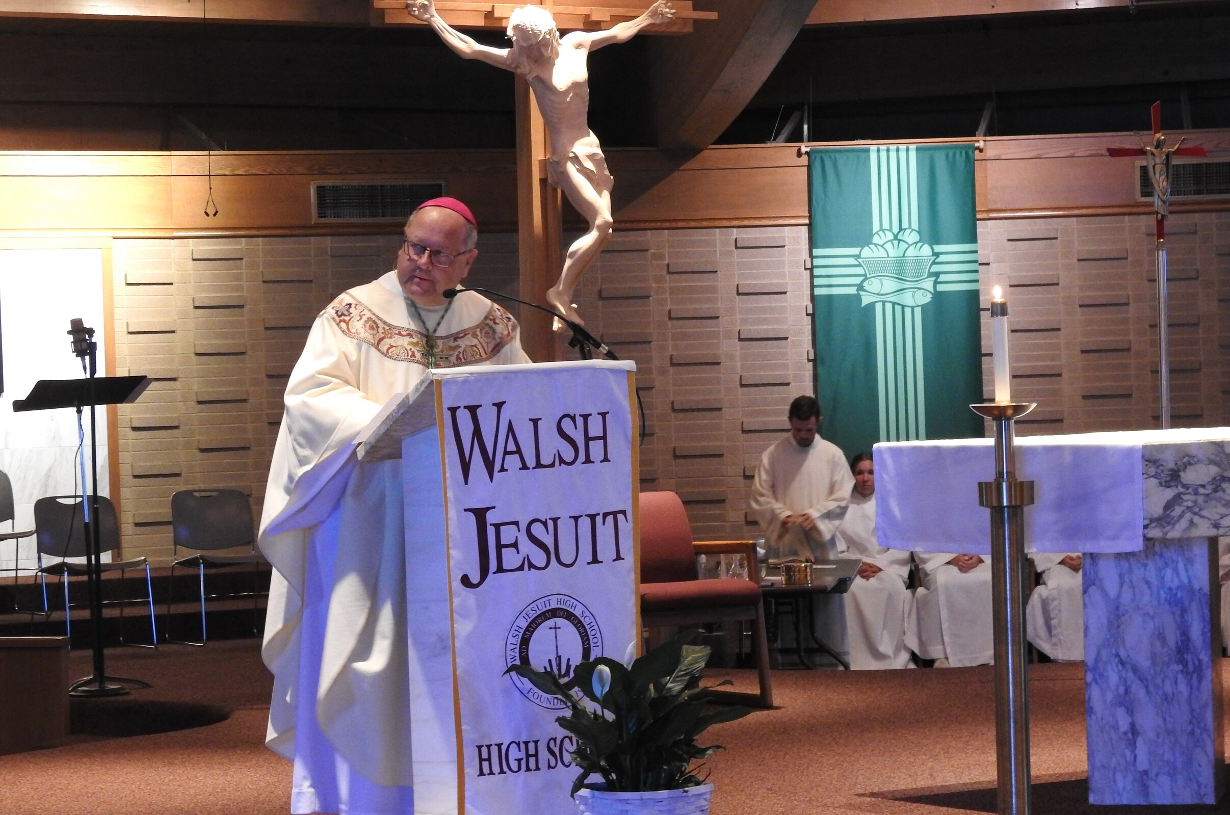 Bishop Edward Malesic celebrated Mass for the group with Father Tom Acker, SJ, Father John Blasek, CSC, Father Ray Guiao, SJ, Father Jay McPhillips, Father Don Petkash, SJ, Father Ken Styles, SJ, and Father Turner as concelebrants. Deacon Bob Grgic, catechetical leader at St. Gabriel Parish in Concord Township assisted and music leader was Cameron Cabot, Walsh Jesuit music director.