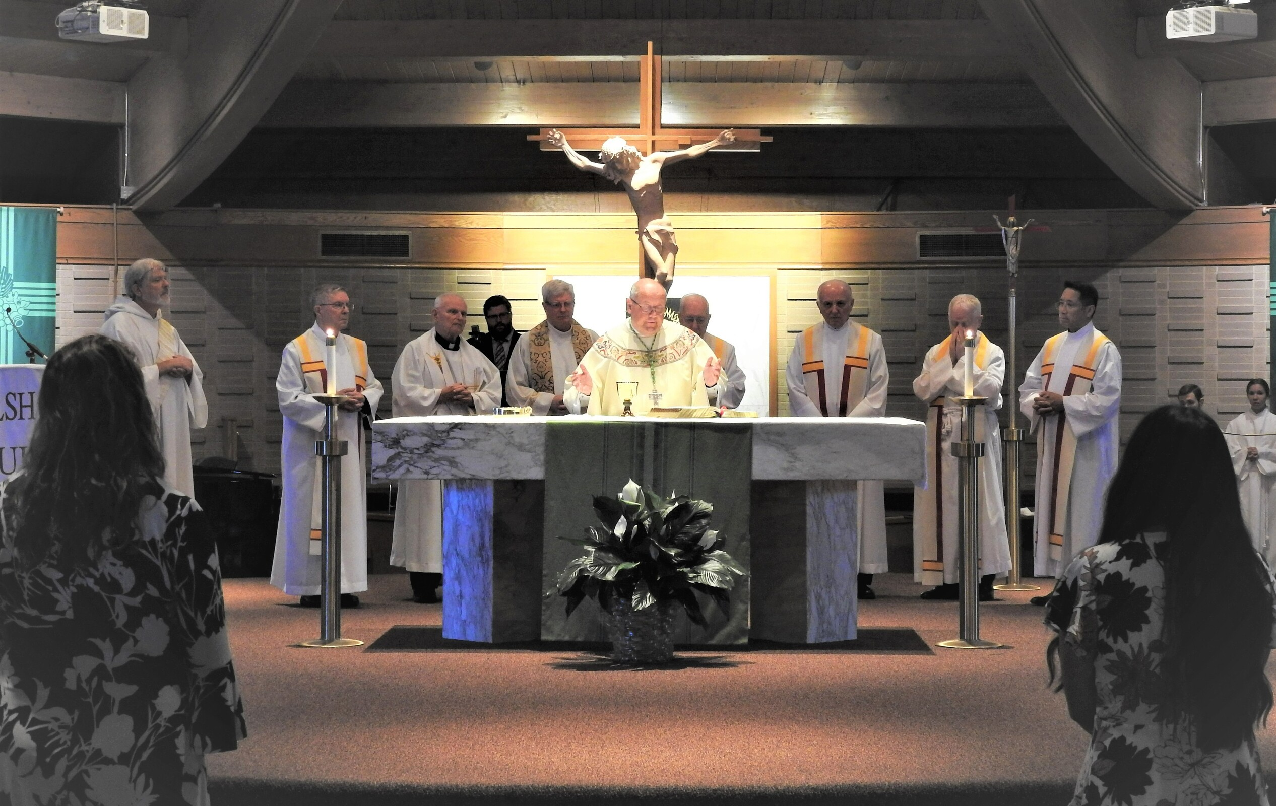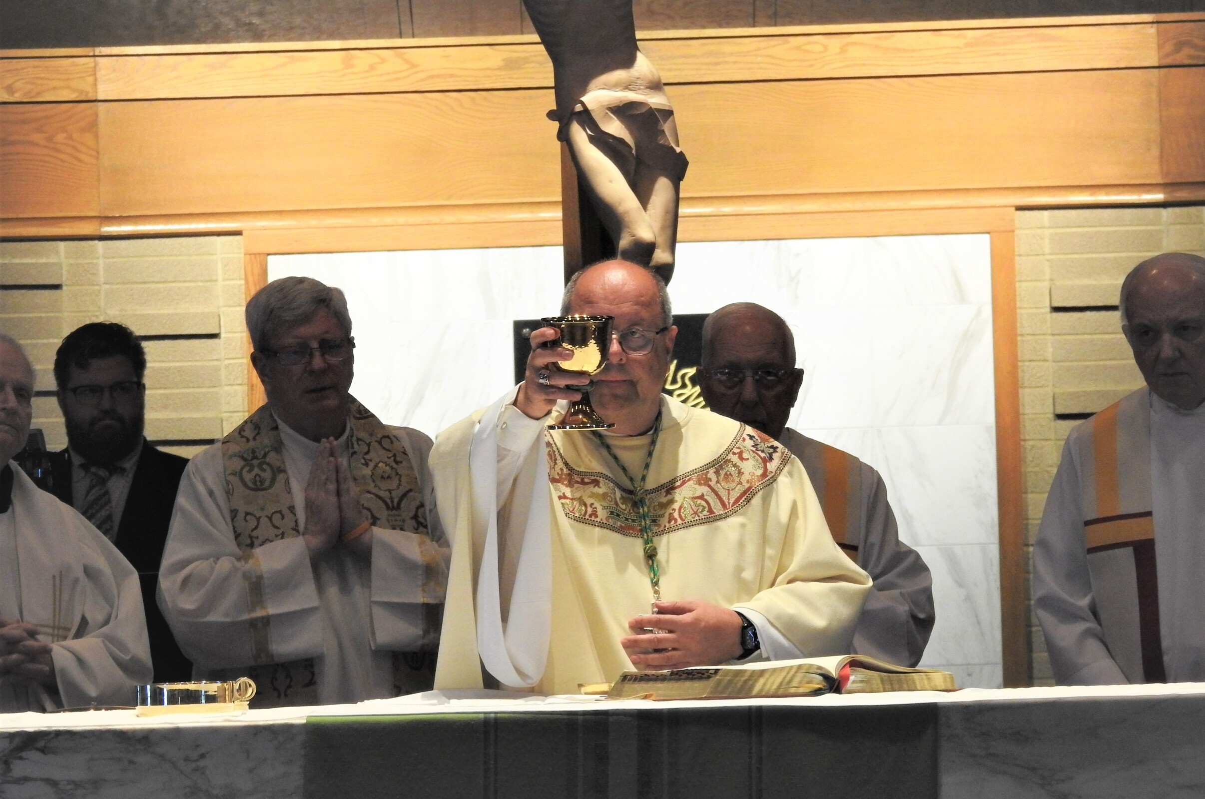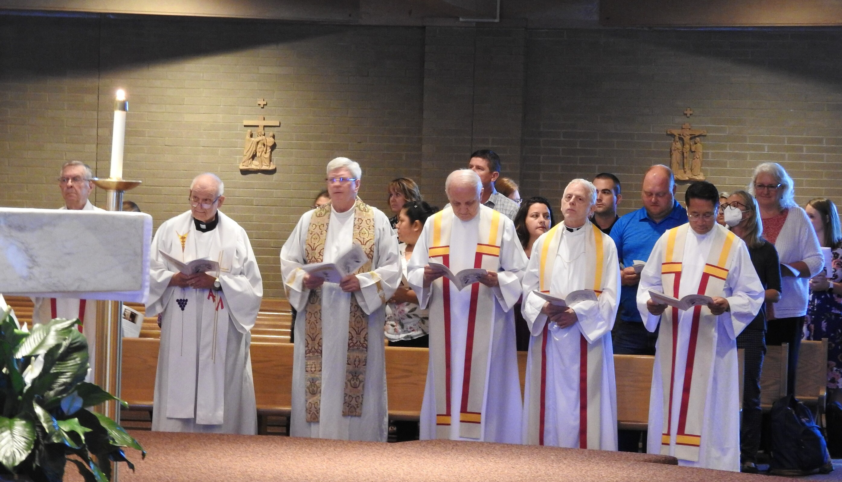 Bishop Edward Malesic celebrated Mass for the group with Father Tom Acker, SJ, Father John Blasek, CSC, Father Ray Guiao, SJ, Father Jay McPhillips, Father Don Petkash, SJ, Father Ken Styles, SJ, and Father Turner as concelebrants. Deacon Bob Grgic, catechetical leader at St. Gabriel Parish in Concord Township assisted and music leader was Cameron Cabot, Walsh Jesuit music director.