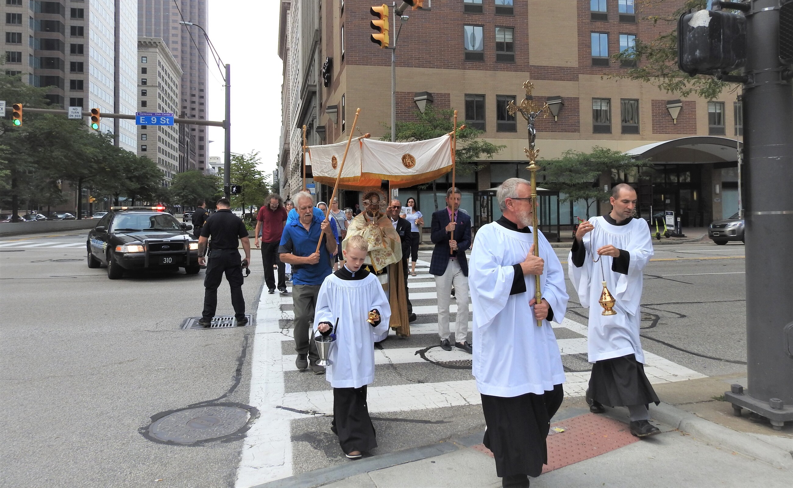 After Mass, Father Estabrook carefully placed a blessed host in the luna of the monstrance and carried it reverently as he led the procession that marched north on East Ninth Street to Lakeside Avenue, west on Lakeside to East Sixth Street, south on East Sixth to Superior Avenue and east on Superior to East Ninth Street, where the group crossed the street and reentered the cathedral to pray the rosary and recite closing prayers.