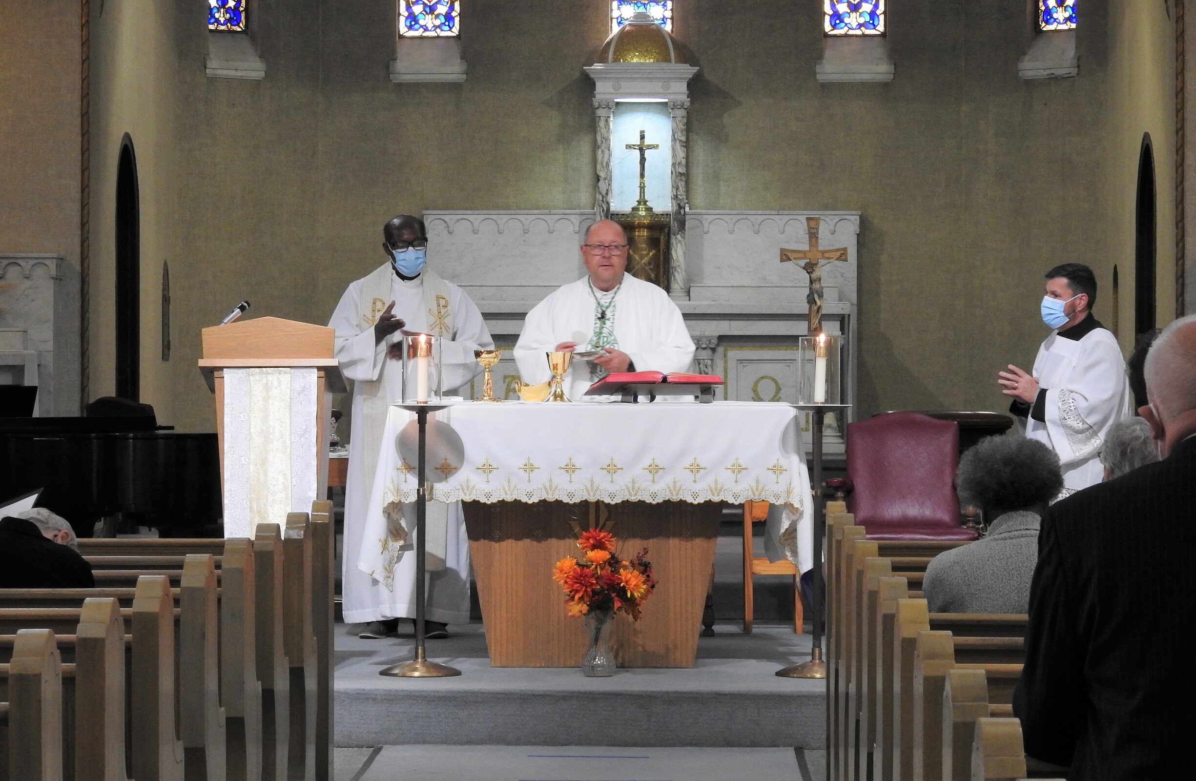 Bishop Edward Malesic visited the medical center on Sept. 27 to celebrate Mass and to observe the operation of the Refresh Food Pantry, a monthly program that operates during lunchtime from June through September. It welcomes those in need to register and receive a hot lunch, food, produce, blood pressure and other checkups and more. Often there is music, as well. Unfortunately, the day of the bishop’s visit, which was the final pantry day for the season, rain forced a reduction in operations.