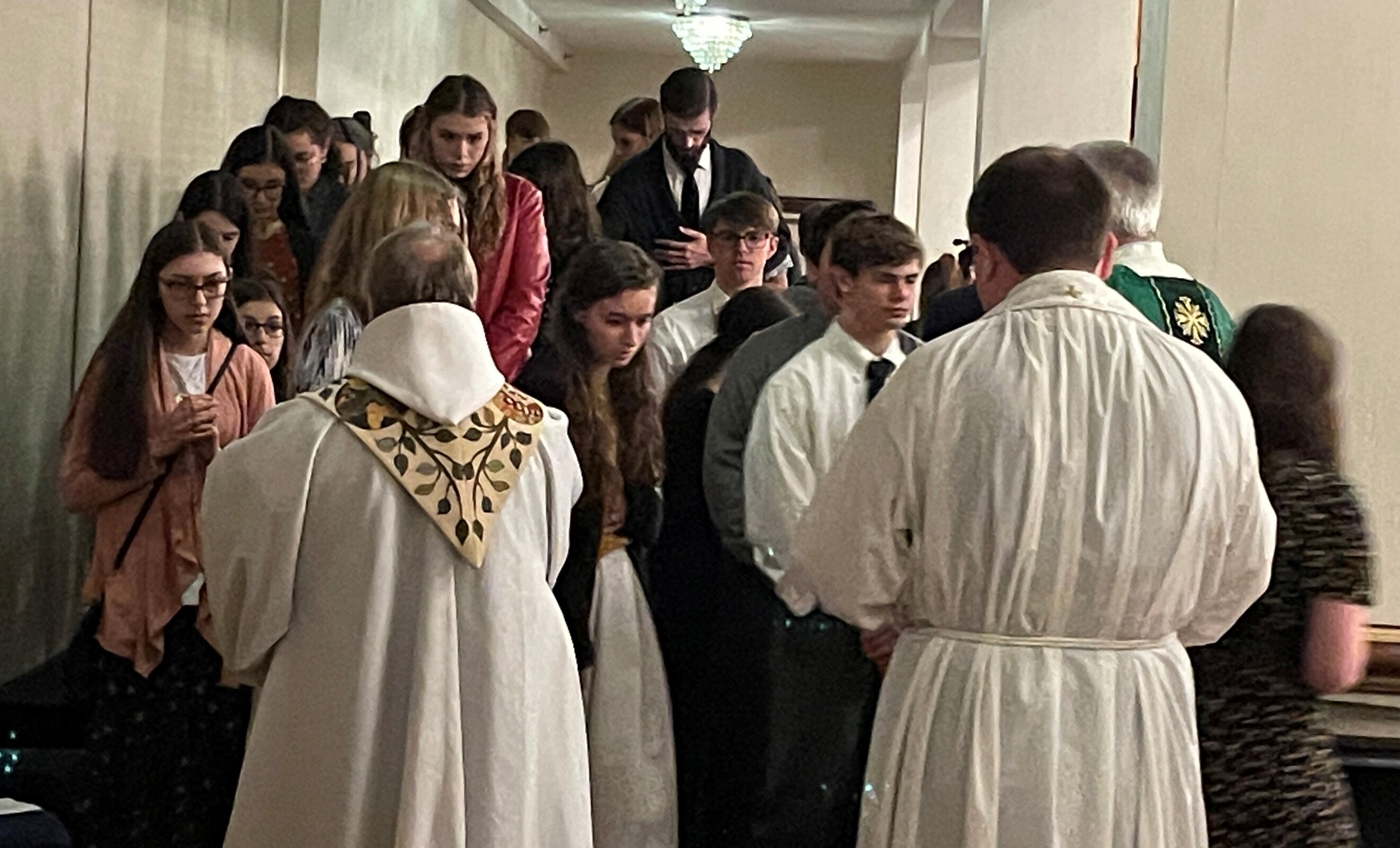 The group stopped for evening prayer before Bishop Robert Barron, bishop of Winona-Rochester, Minnesota delivered his address.