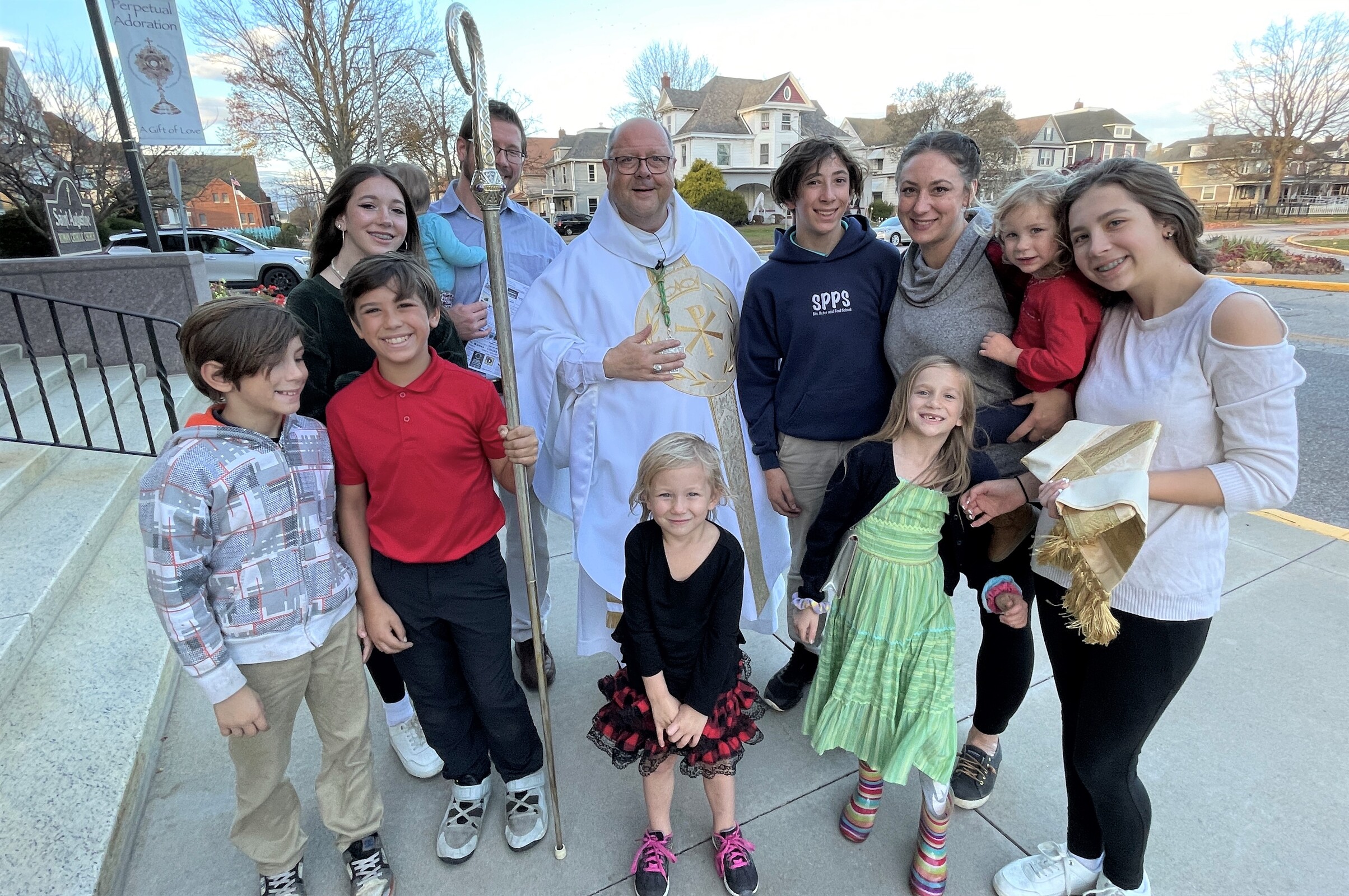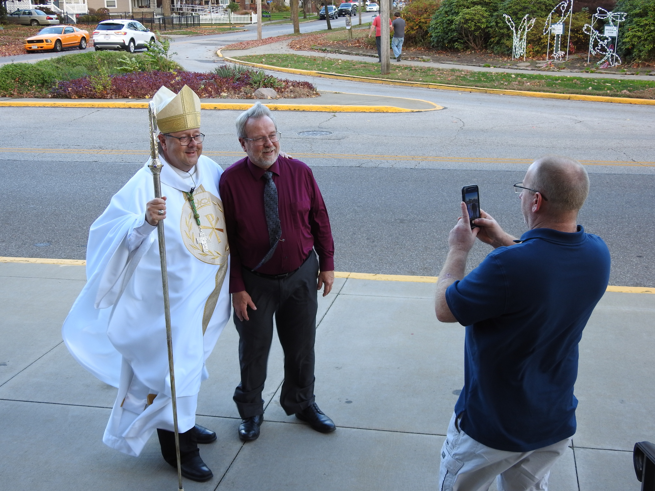 After Mass, the bishop took advantage of the warm – but windy – fall weather to greet parishioners outside the church before joining some of those involved in Eucharistic adoration at a celebration dinner in the hall.