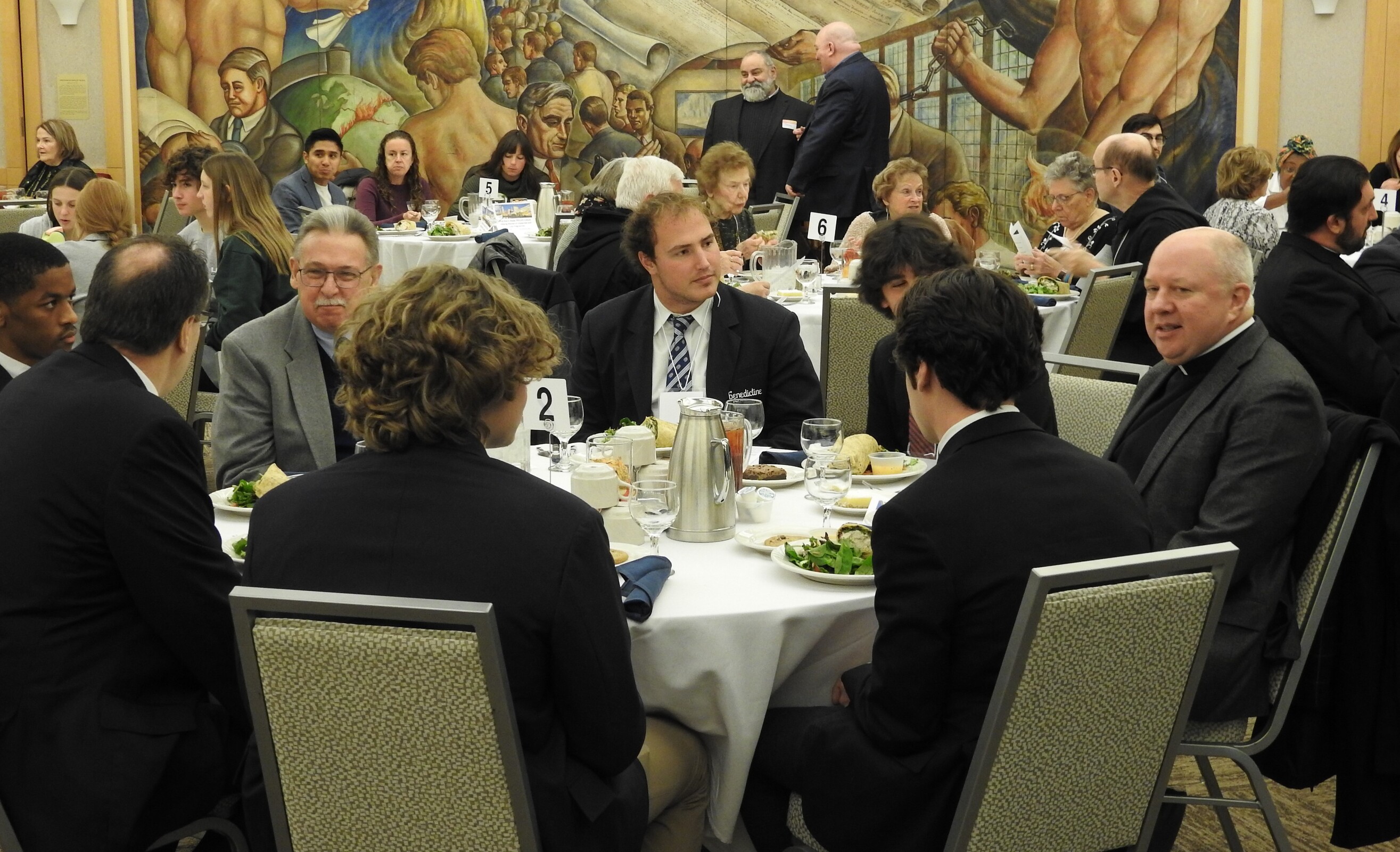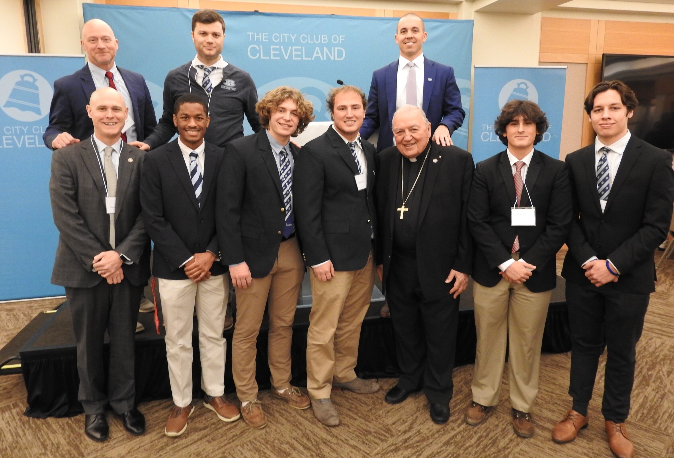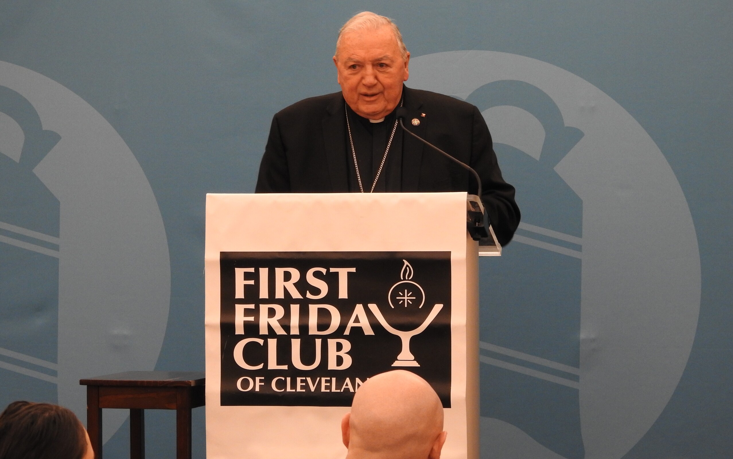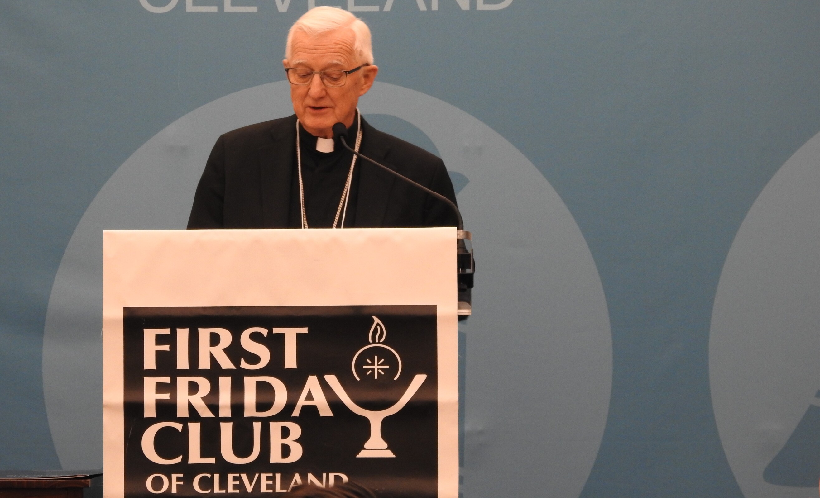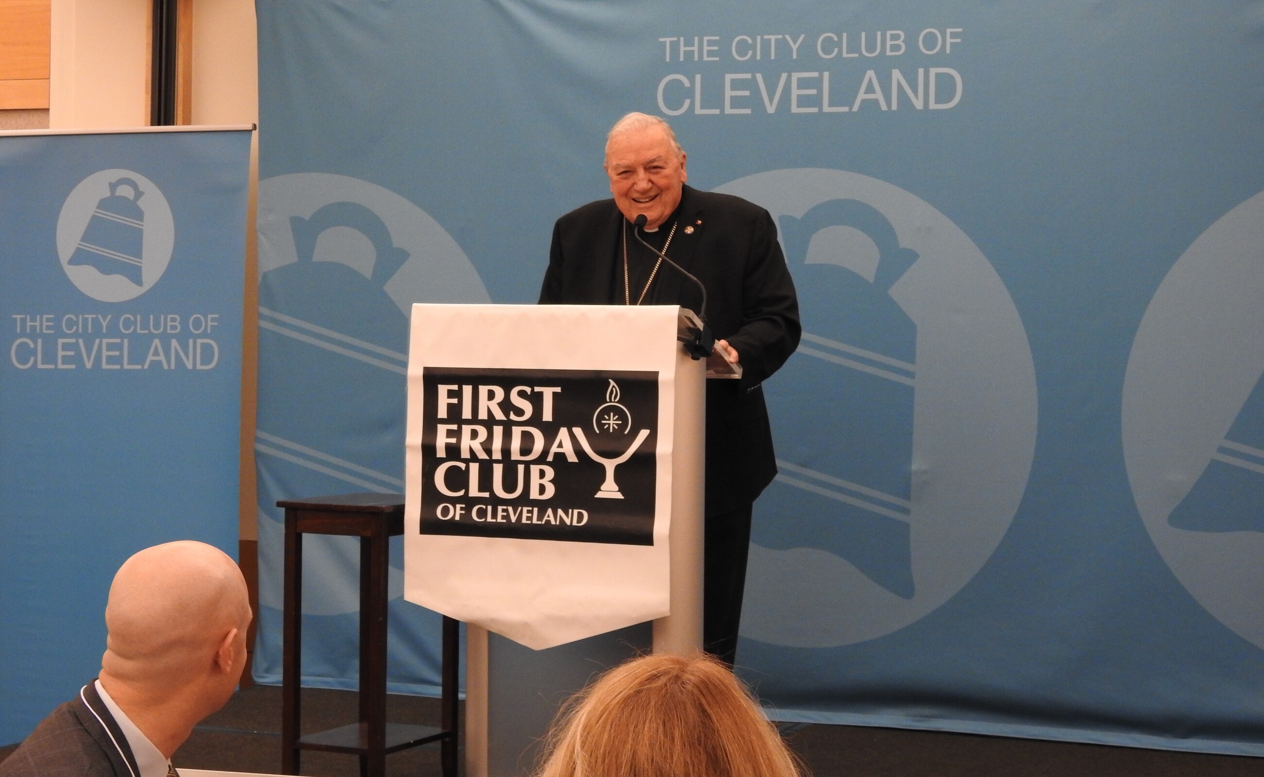 It was a full house for the Dec. 1 First Friday Club of Cleveland program when Auxiliary Bishop emeritus Roger Gries shared the story of his life as a Benedictine monk, teacher, coach, school administrator, prior, abbot and auxiliary bishop of Cleveland. In attendance were fellow priests, monks, students from some Catholic high schools – including a contingent from Benedictine – friends and admirers of the beloved bishop.
