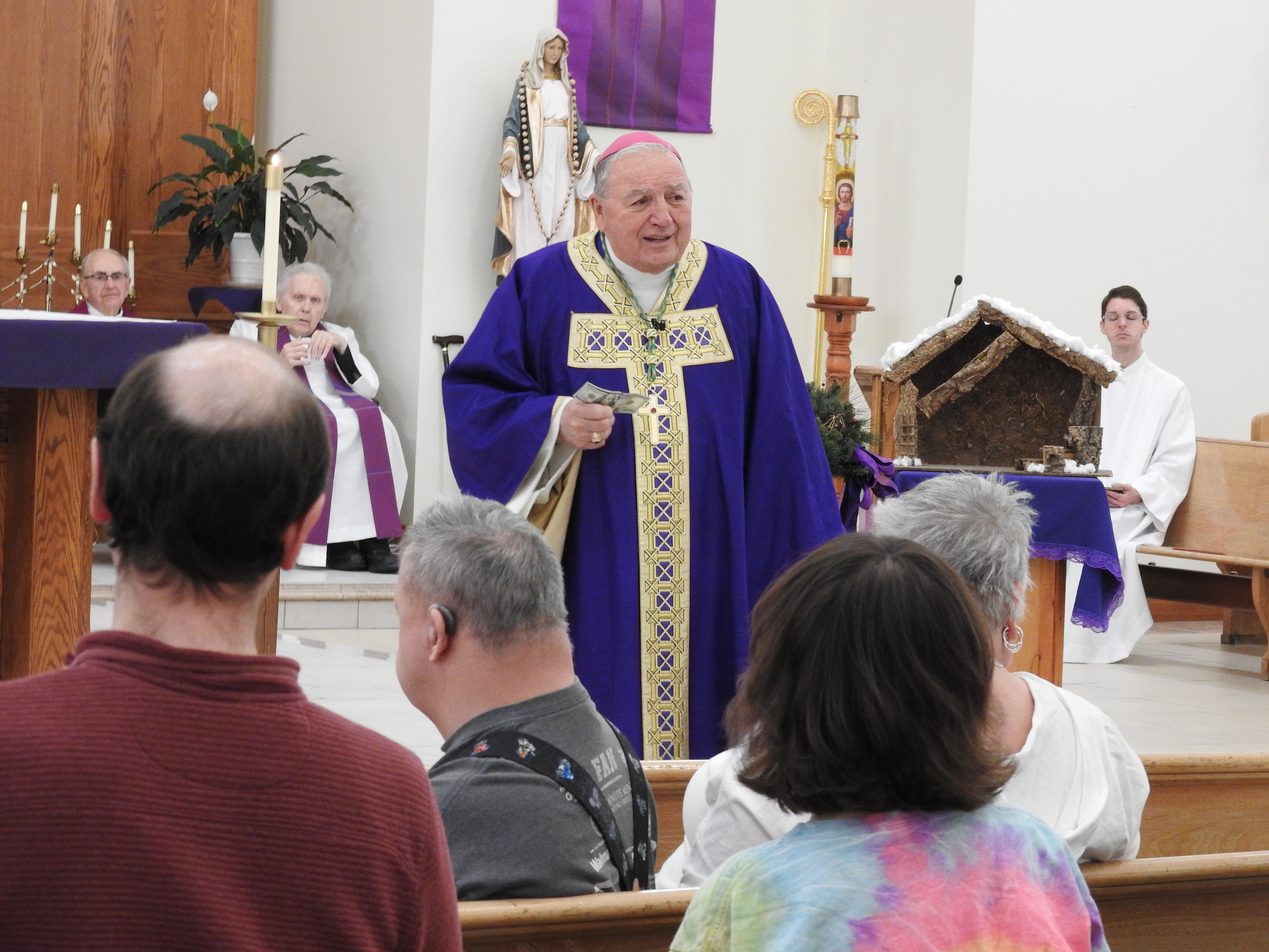 As is his custom, Bishop Gries brought a $100 bill and displayed it during the homily, much to the delight of the congregation.