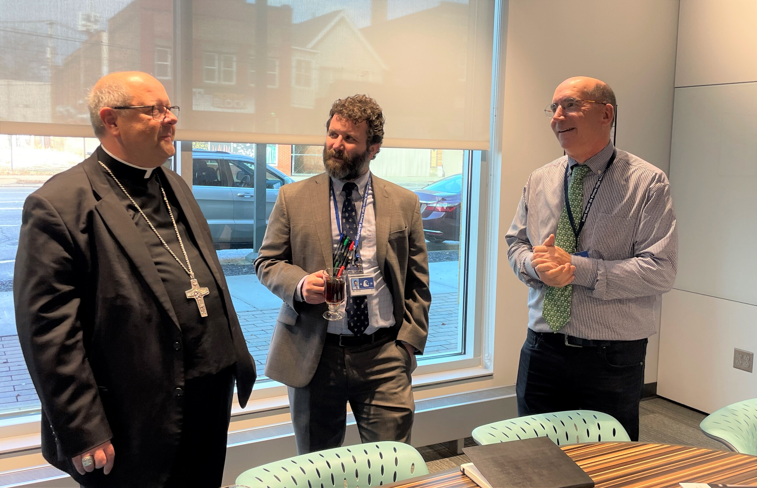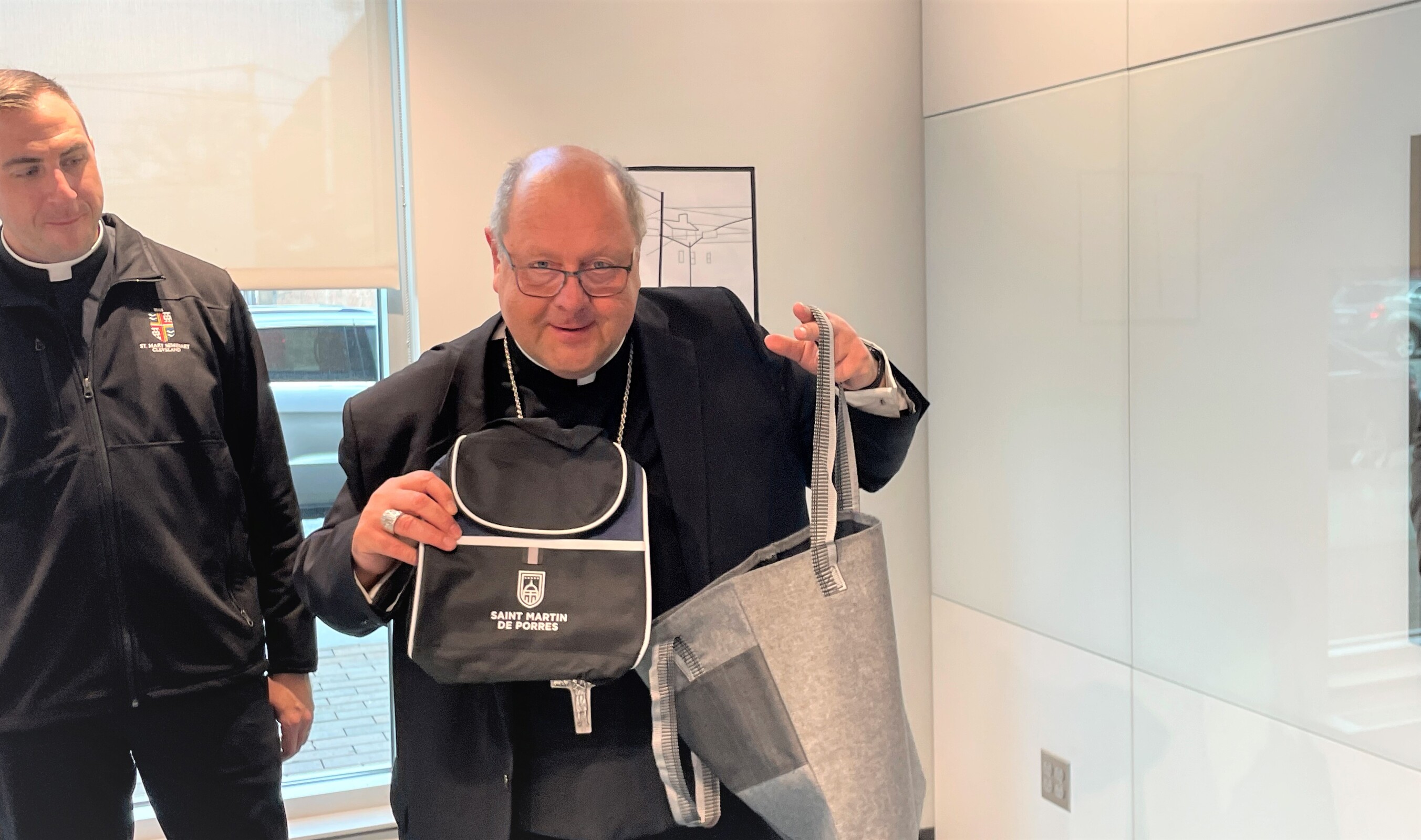 He greeted students outside the church before heading back to campus for a tour and an opportunity to chat with some students, faculty and staff. The bishop received a bag of Saint Martin de Porres “swag” before leaving.