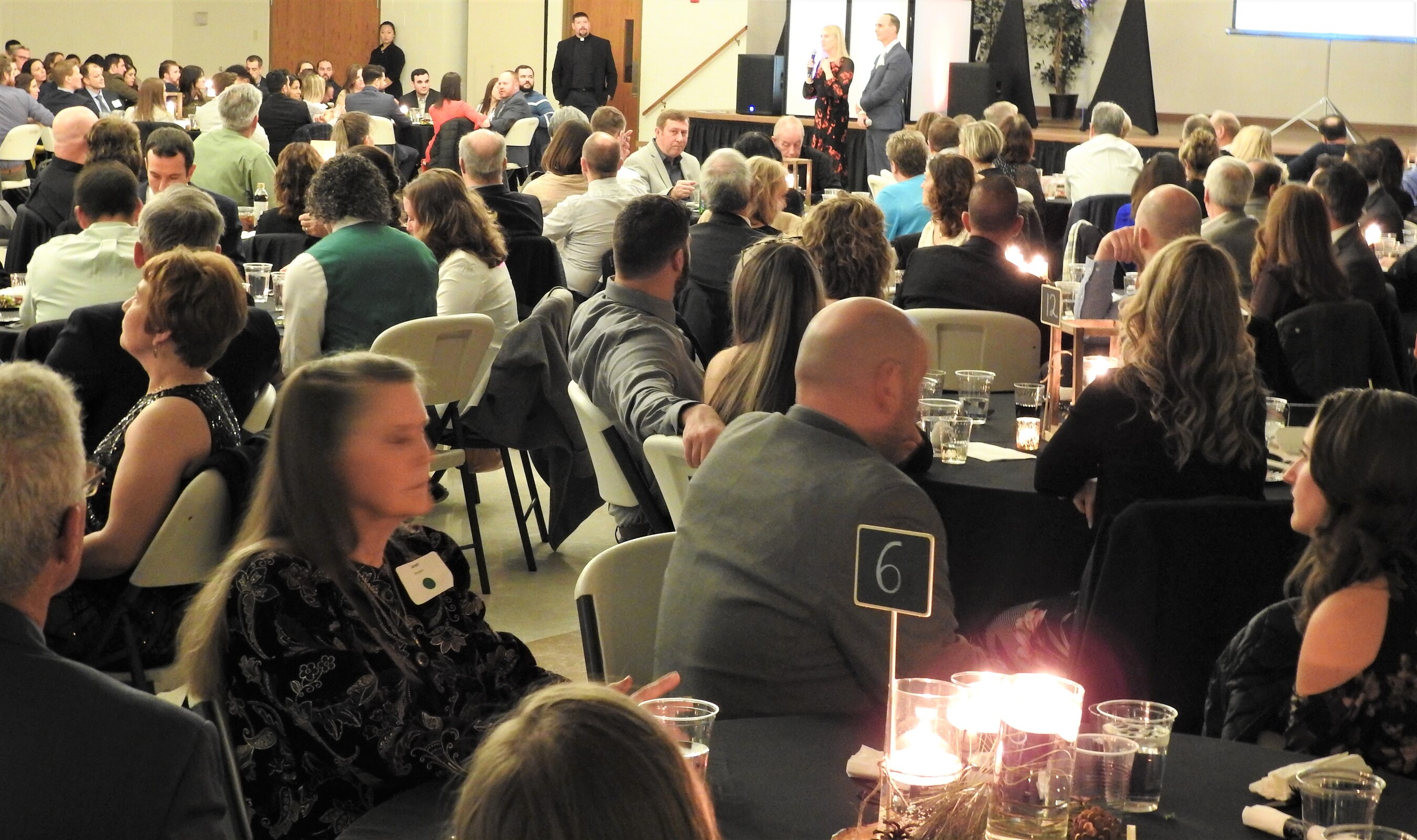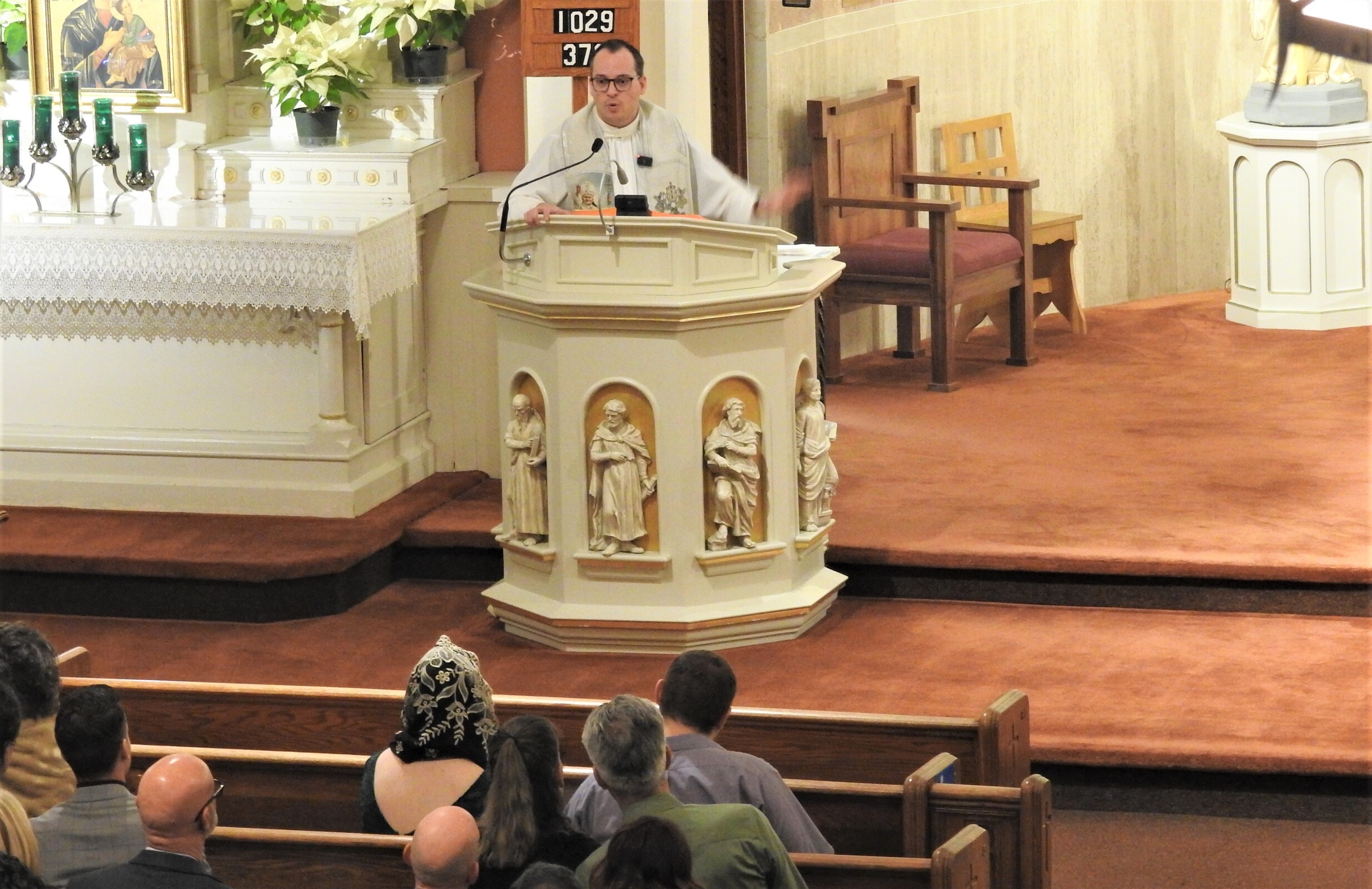 The evening began in the church with prayer, a chance to reflect on marriage, adoration, music and a message from Father Mann. Father Butkowski presided at adoration. Tanis Merimee and members of the Menkhaus family including Max and Father Joe Menkhaus, parochial vicar at St. Bernadette Parish in Westlake, provided music.